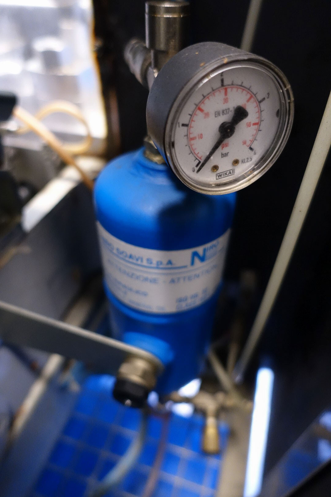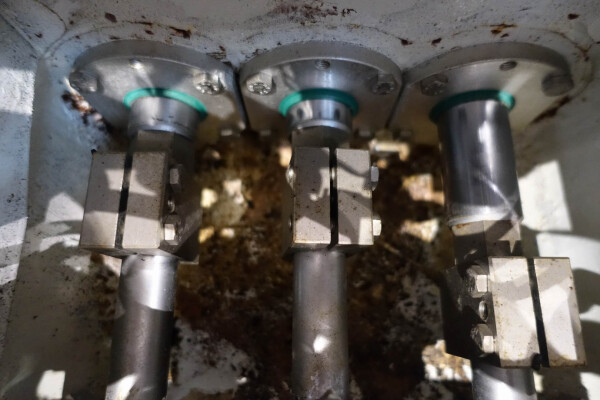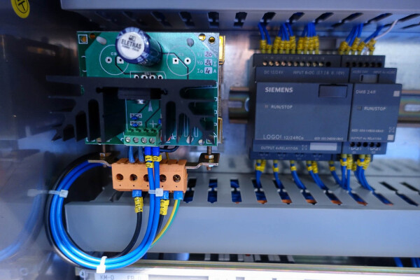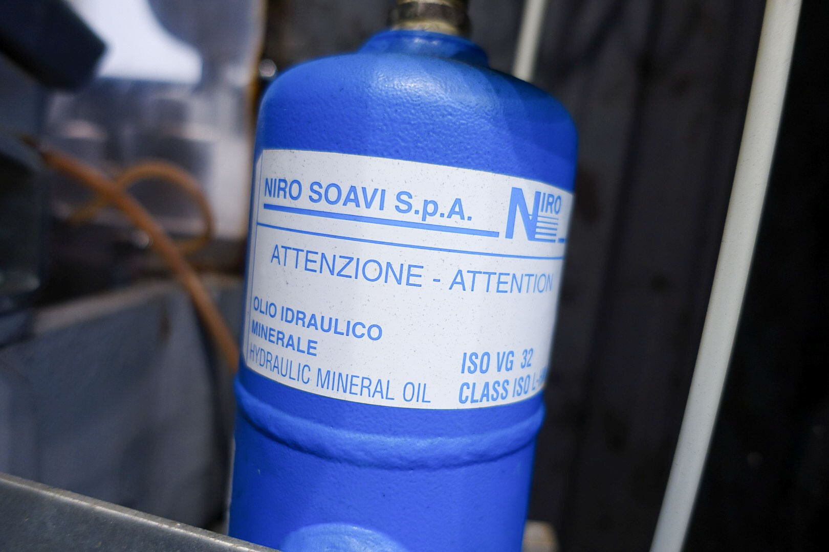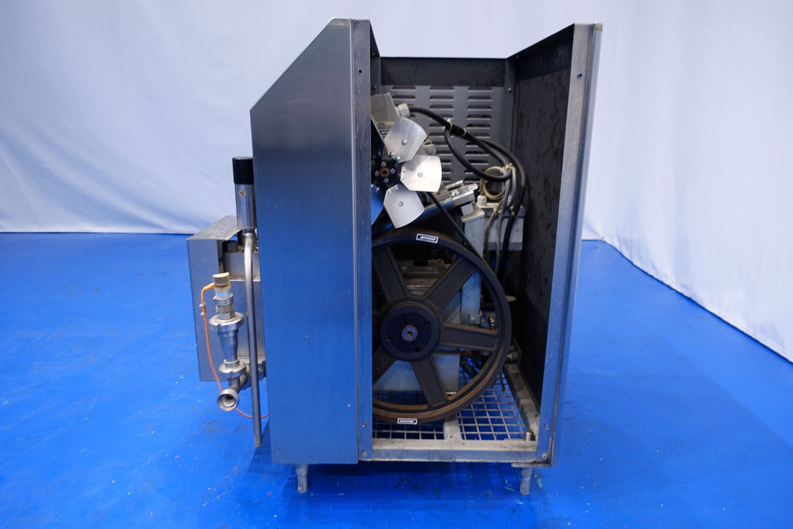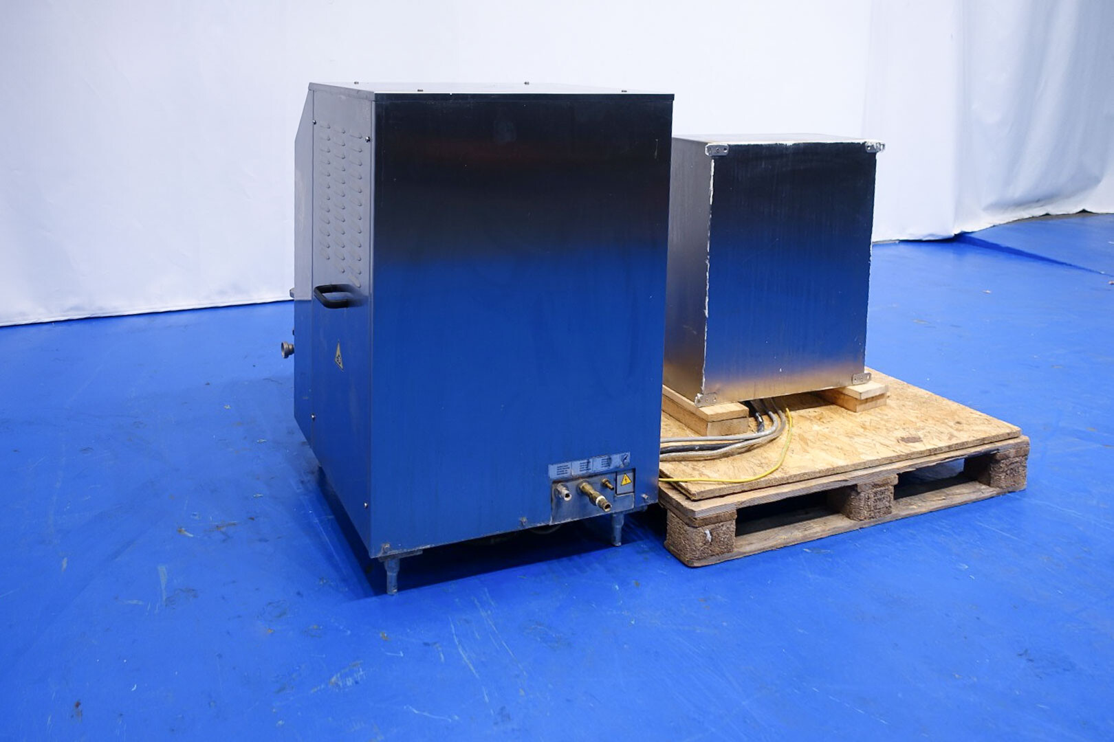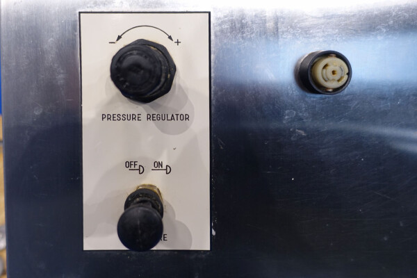 Hogedrukhomogenisator. 3 zuigers, 1-traps, met handmatige drukregeling. Zuigers, zuigerdiameter 30 mm en slag: ca. 55 mm. RVS bekleed. Huidig motorvermogen: 6,0 kW - 12 A - 50 Hz - 400 V - 3 fasen. Maximale druk in stroomconfiguratie met deze motor tot 250 bar. Vrijstaand bedieningspaneel (voor wandmontage). Bedrijfsuren op meter: 1.202. Inclusief elektronische druktransmitter op de inlaat, drukindicator, overdrukventiel, flowswitch (en handmatige klep) op het koelwater.