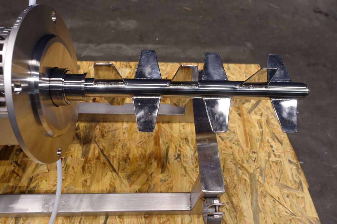 Peddle gentle inline mixer. Diameter rotor: 32 mm. Length 38,5 cm. 12 Peddles on rotor. Single jacketed. Shaft speed: 950 rpm. Connections: in 150 mm / out 150 mm, Flange. Motor: 1,5 kW - 400 V - 3,9 A - 50 Hz - 950 rpm. Total dimensions 120 x 80 x 60 cm, weigth 111 kg.