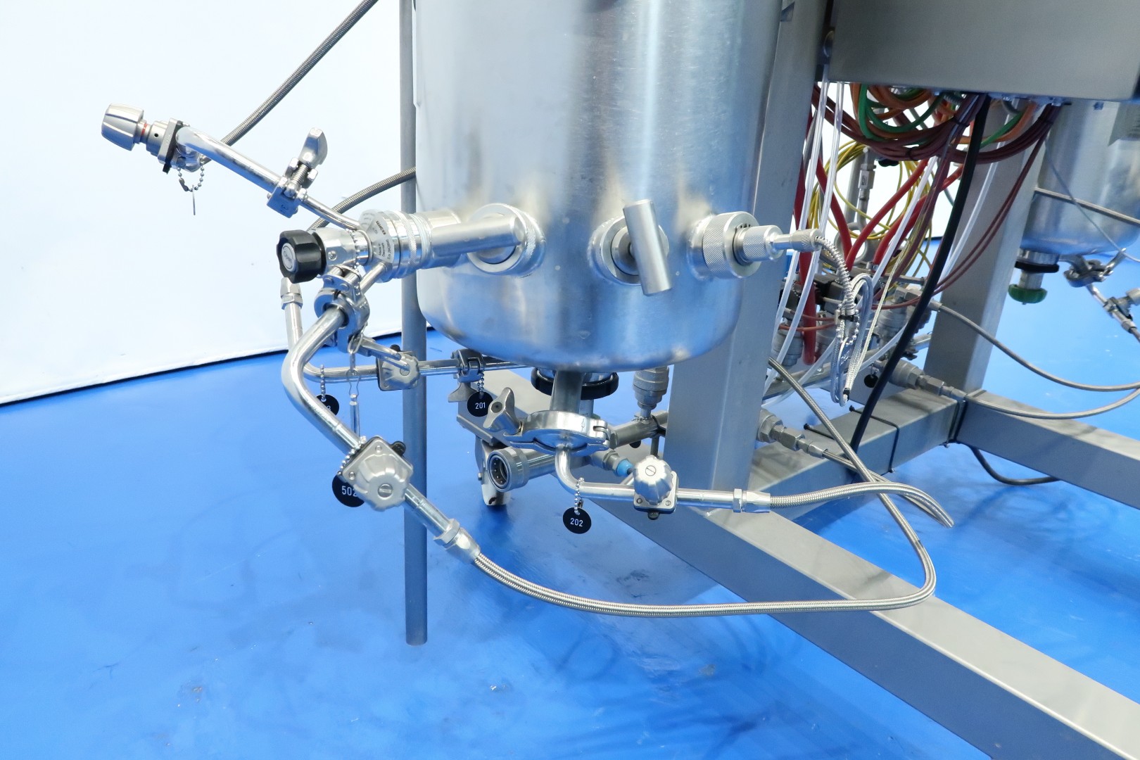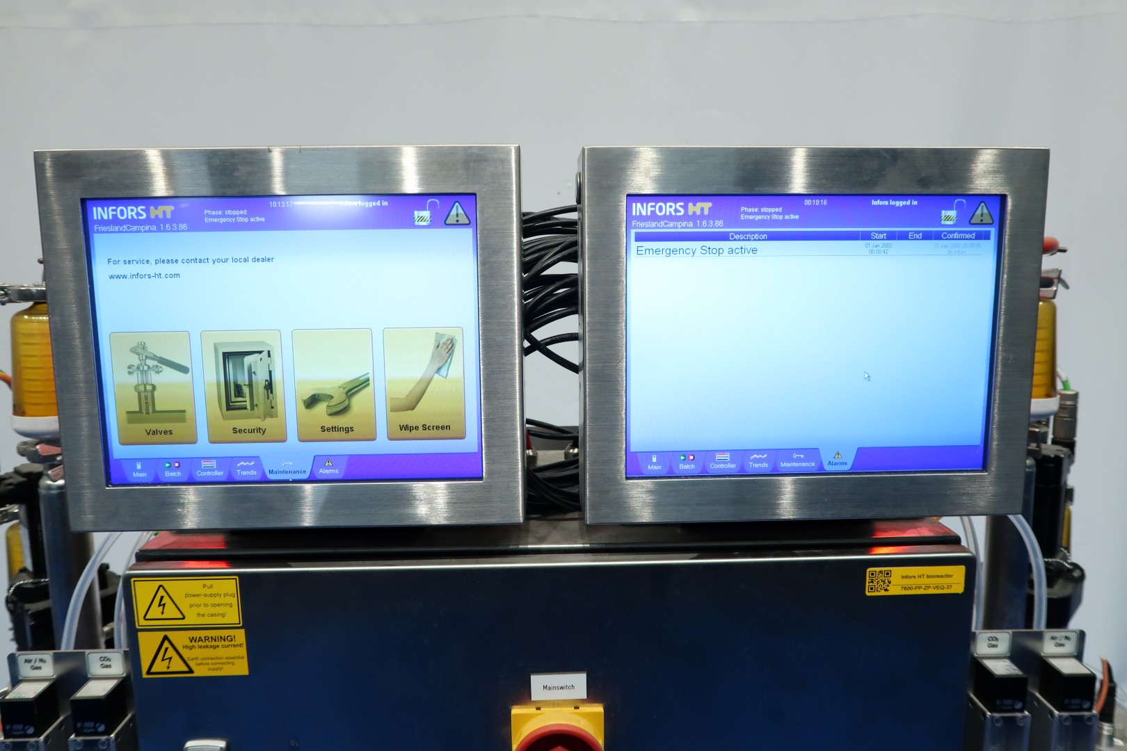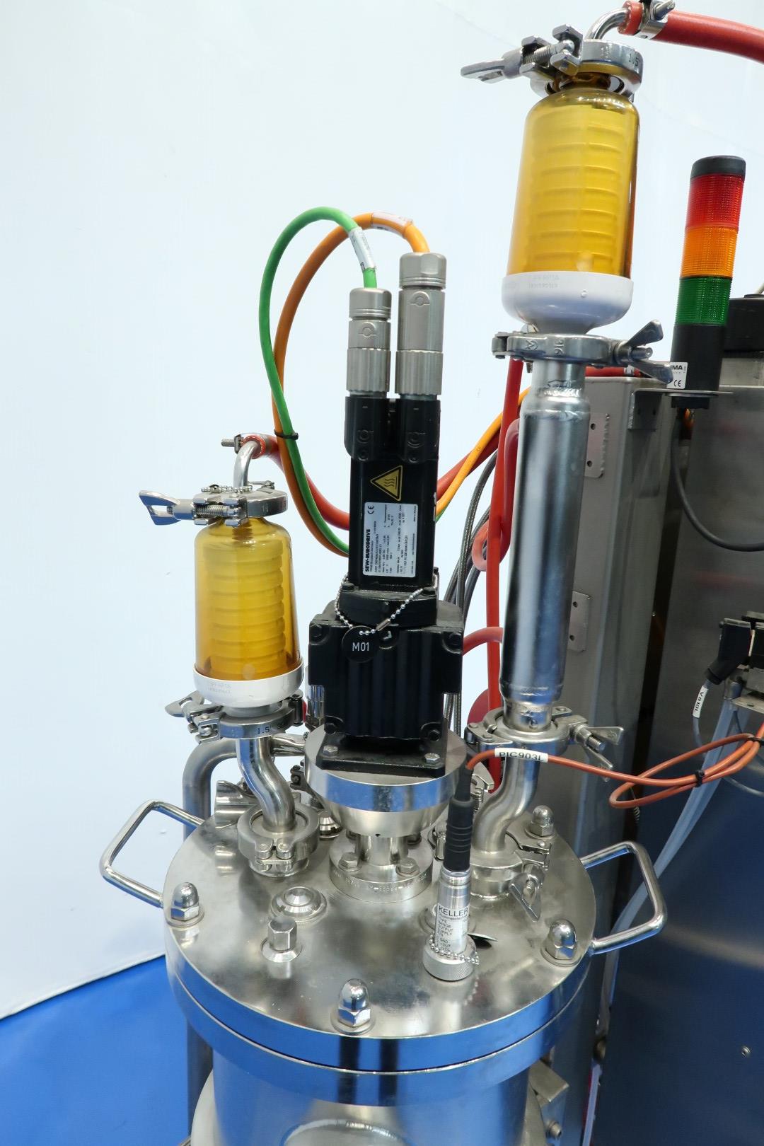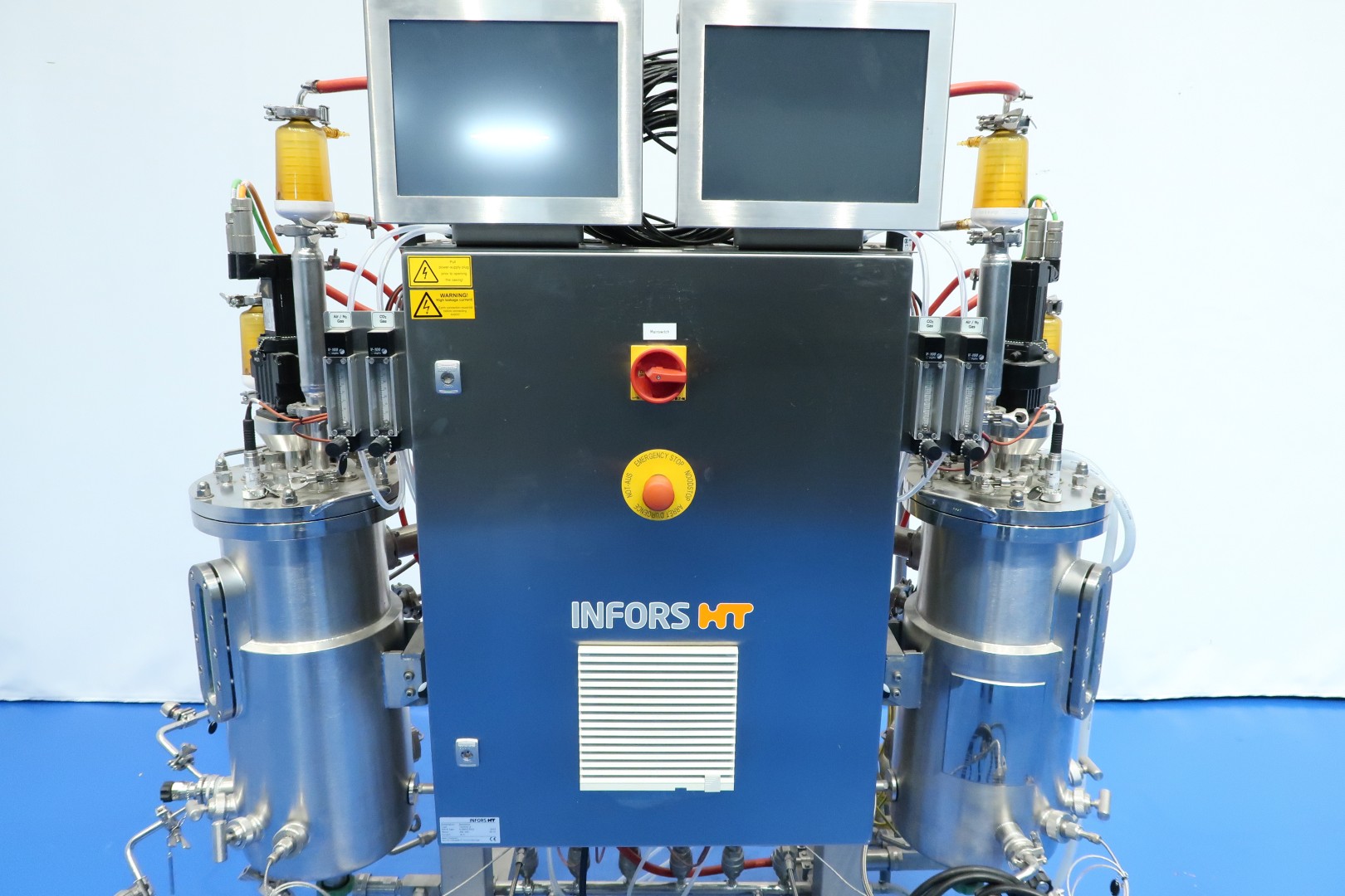 Double bioreactor. Used for fungal applications. Condition: very good. Vessel woking volume 2 x 20 ltr. - jacket 2,0 ltr. - Total volume 2 x 30 ltr. With i.a. following systems/sensors: Air/N2 gas system - Co2 gas system - temperature sensor in vessel and jacket - pressure sensor in lid - both vessels with oval sight glass - both vessels with internal lamp - both vessels with U-shaped agitator (speed frequency controlled servomotor). Material SS 316 (1.4404) and 304L (1.4307). With 2 x Tool-Temp AG, TT-133 pre-heater (water bath) system. Power 2x 13,9 kW. Controls bioreactor: Siemens/Infors with 2 x HMI touch screen. Dimensions bioreactor: 180x100x177 (lxwxh) cm - weight: 237 kg. Dimensions pre-heater: 105x100x132 (lxwxh) cm - weight: 225 kg.