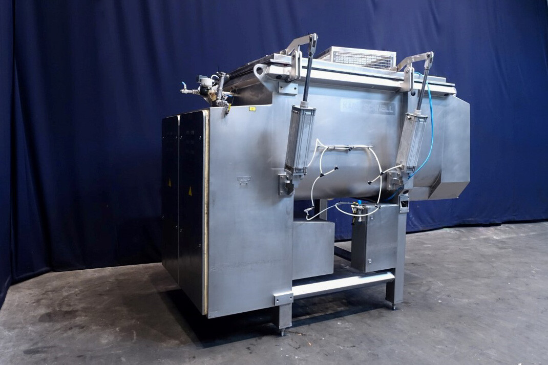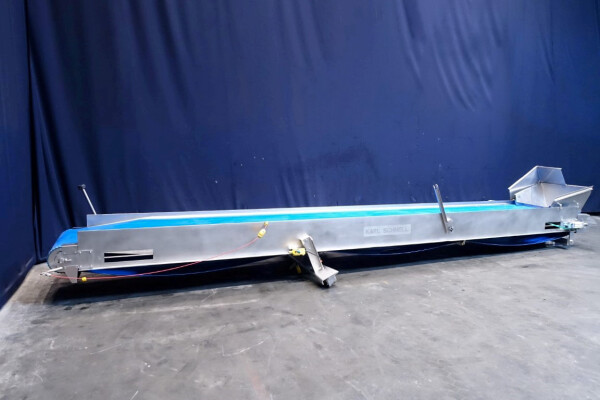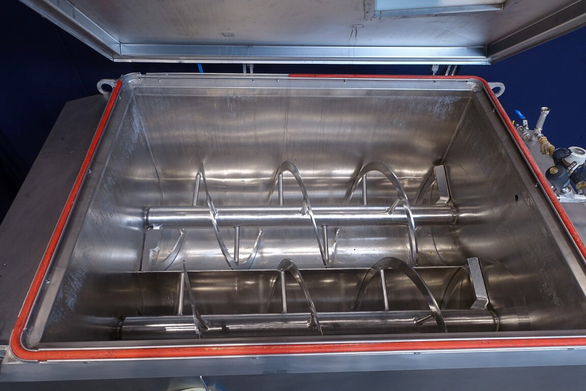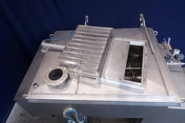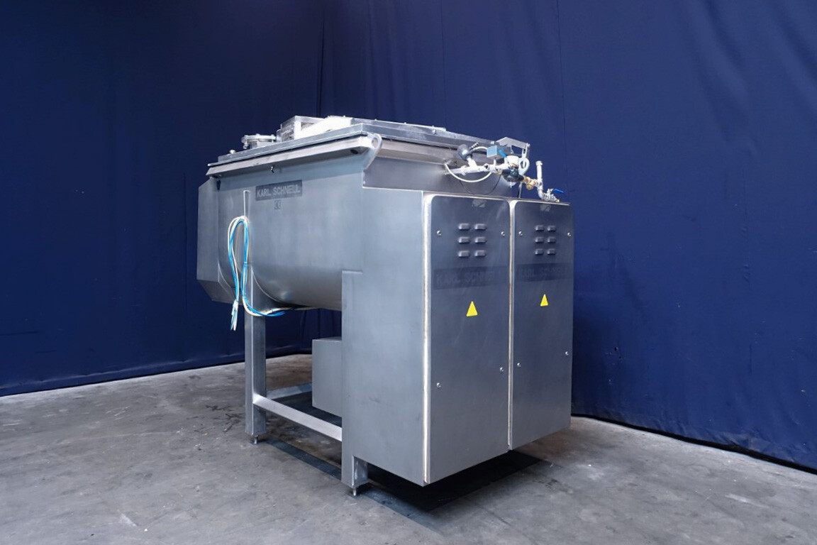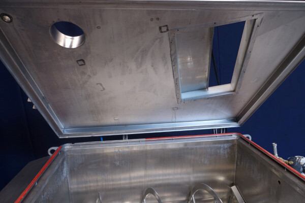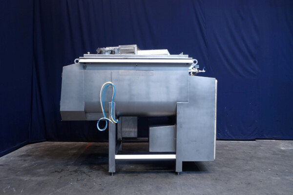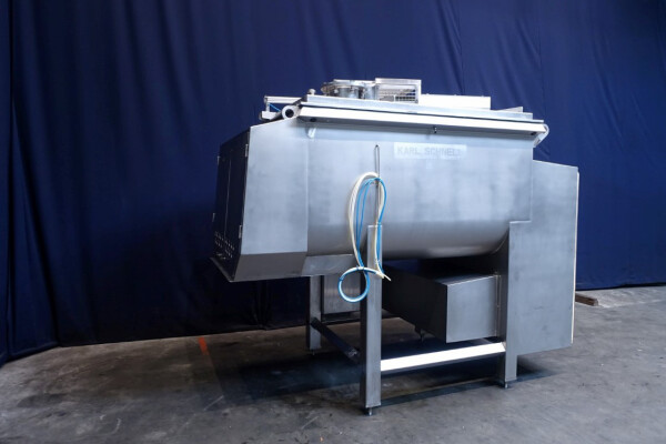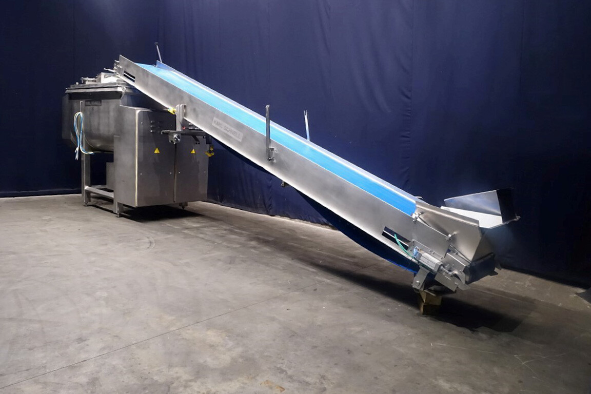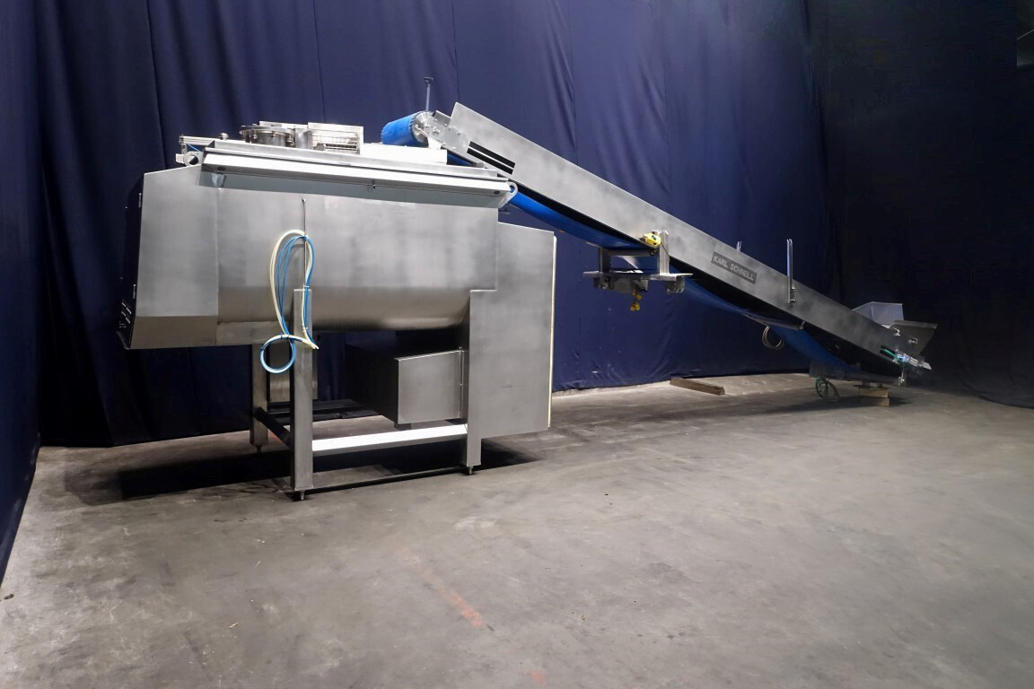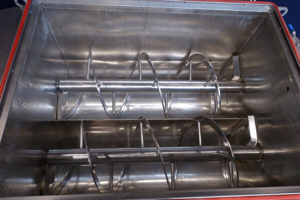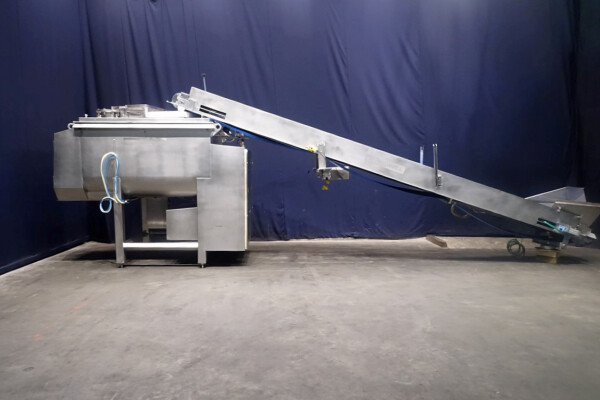 Ingrediënten mixer. Lintmixer met 2 assen. Horizontaal. Enkelwandig. Handmatig reinigbaar. Uitlaatkleppen, pneumatisch tilbaar. Gesloten deksel met een ingrediënteninlaat, handmatig. Deksel pneumatisch kantelbaar. Afmetingen productruimte: 170 x 130 x 120 cm. Inclusief invoerbandtransporteur (Karl Schnell, type 635). 2 voet van de transportband ontbreken. Afmetingen van de transportband: 670 x 120 x 100 cm.