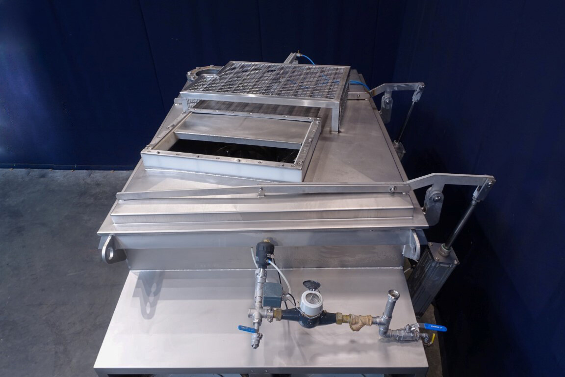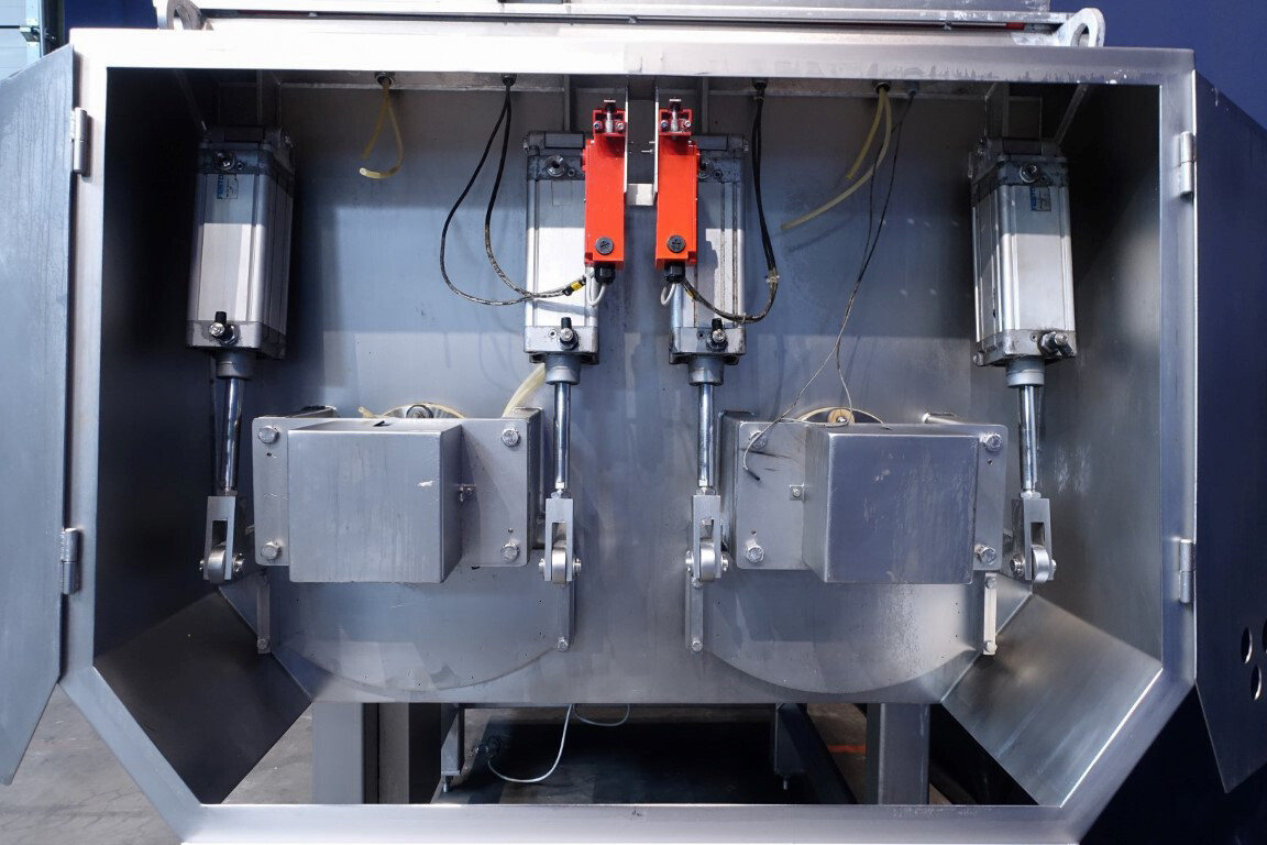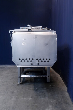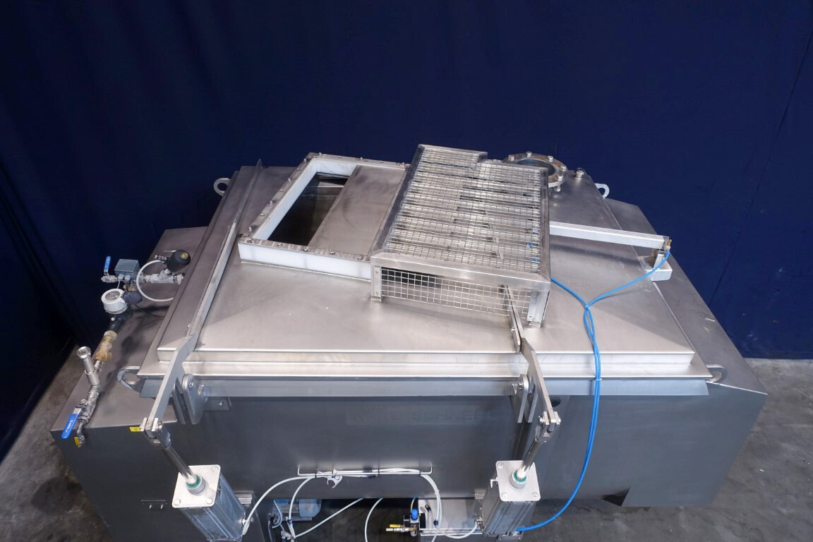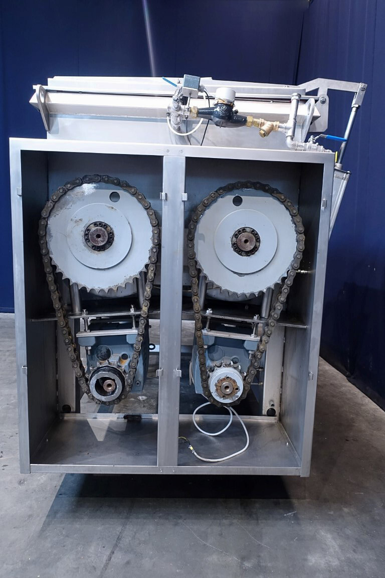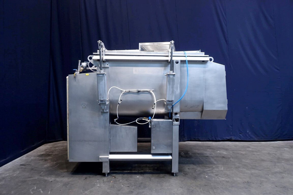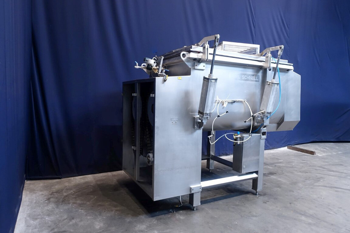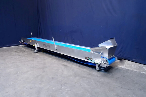 Ingrediënten mixer. Lintmixer met 2 assen. Horizontaal. Enkelwandig. Handmatig reinigbaar. Uitlaatkleppen, pneumatisch tilbaar. Gesloten deksel met een ingrediënteninlaat, handmatig. Deksel pneumatisch kantelbaar. Afmetingen productruimte: 170 x 130 x 120 cm. Inclusief invoerbandtransporteur (Karl Schnell, type 635). 2 voet van de transportband ontbreken. Afmetingen van de transportband: 670 x 120 x 100 cm.