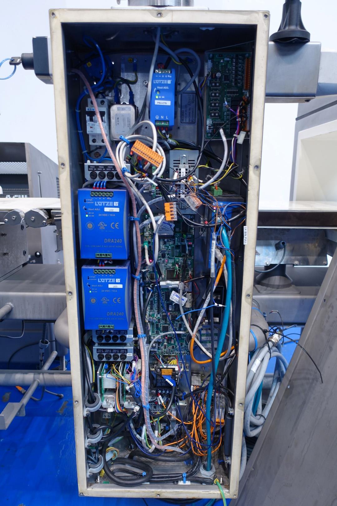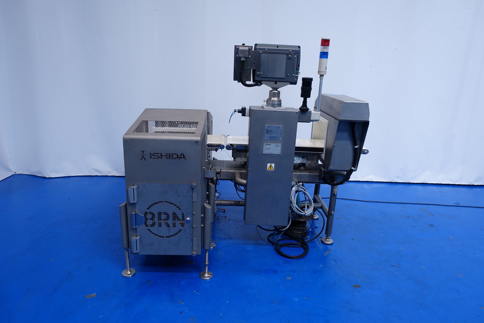 Metal detector and check weigher. Max through put, size of product on conveyor: 300x195 (wxh) mm. Max apperture size: 375x250 (wxh) mm. Max product weight 3.300 gram and min product weight: 125 gram. Including conveyor in 3 parts 180x30 (lxw) cm. Ejecting system by 2 x mechanical arm with 2 SS collection bins. Total dimensions: 180x160x160 (lxwxh) - weight: 364 kg.