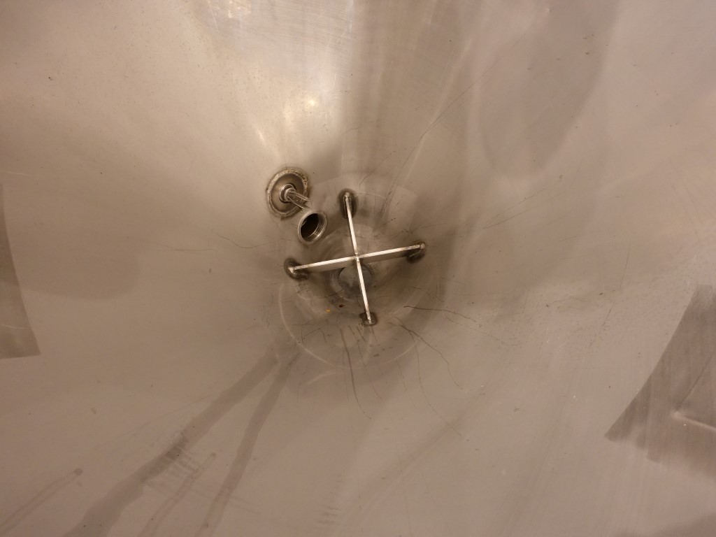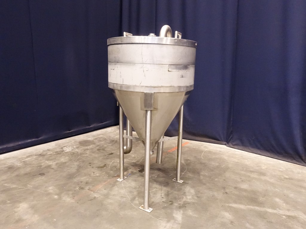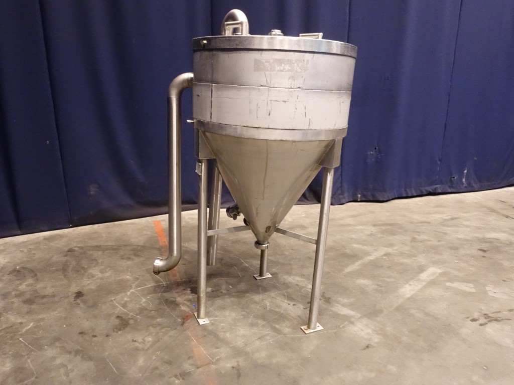Open conical hopper, open top with cover. Conical. Product outlet, 2,5'' DIN. Outlet height: 40 cm. Connectors for low level. 3 Feet. Inside dimensions of tank: diameter 82 cm, height 40 cm. Total dimensions: 100 x 100 x 100 cm.