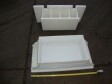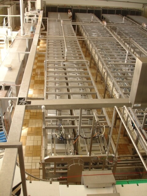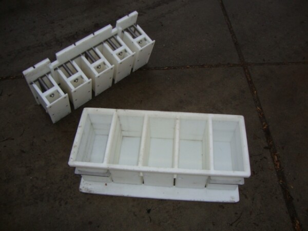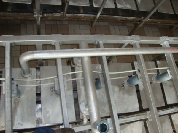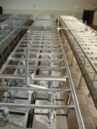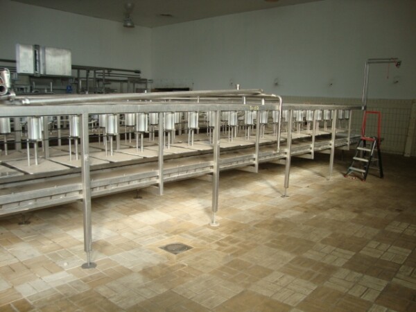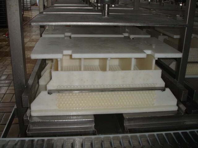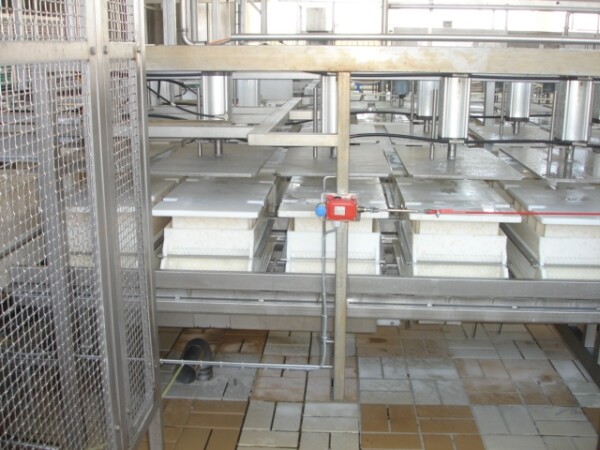 Transportband pers met pallen voor kaasvormen bestaande uit 2 rijen van 40 cilinders. totaal 80 pers plaatsen. 1 Cilinder 1 kaasvorm. Met pneumatisch invoer systeem en sproeipijp voor CIP reiniging. Inclusief 2 sets micro geperforeerde rechthoekige kaasvormen. Eerste set van 100 vormen voor standaard 'Euroblock' formaat, Elke vorm is ±15kg kaas, afmeting: 50x30x20 cm. Tweede set van 120 Multiforms. 5 rechthoekige "brood" kazen per vorm, Elke kaas ± 3 -3,5 kg . Afmeting per kaas 25x12.5x ± 10-12c. Moulds hebben veren in het deksel voor gelijke drukuitoefening. Geen bedieningspaneel.