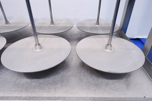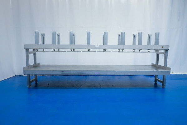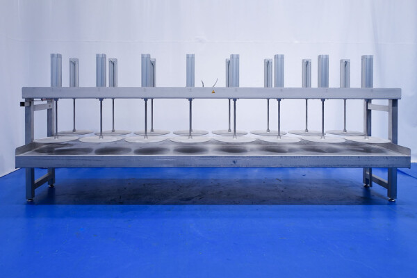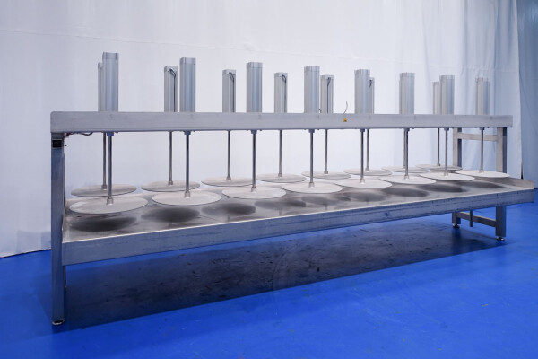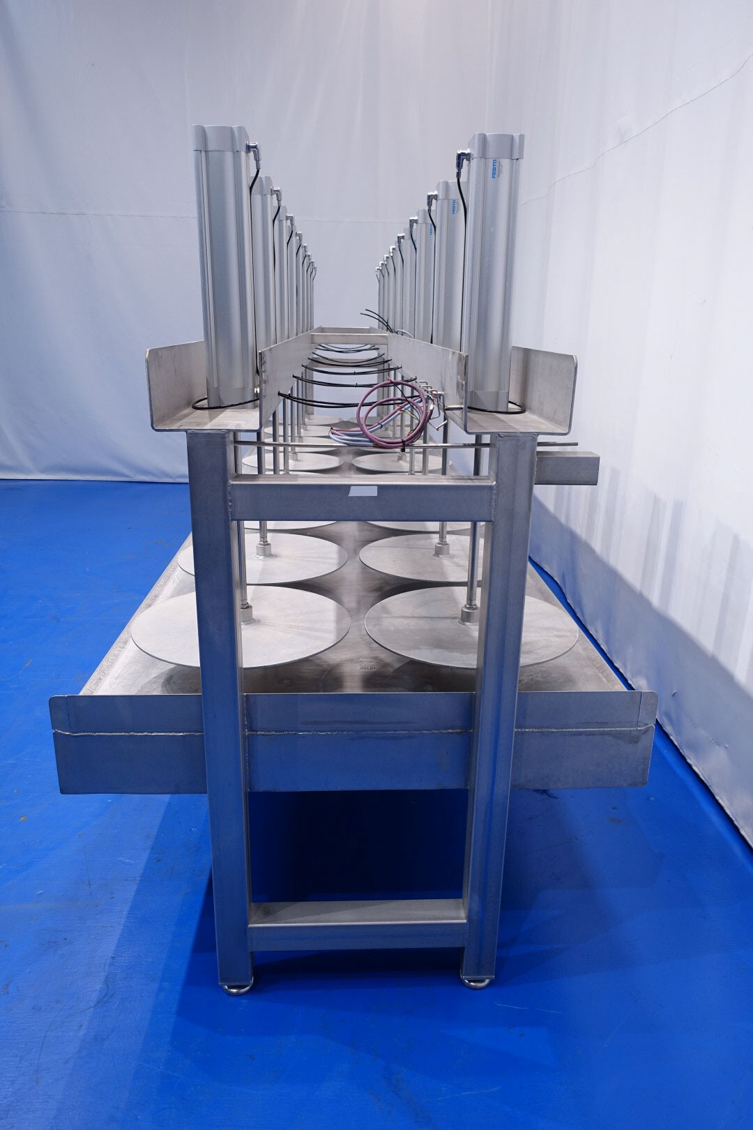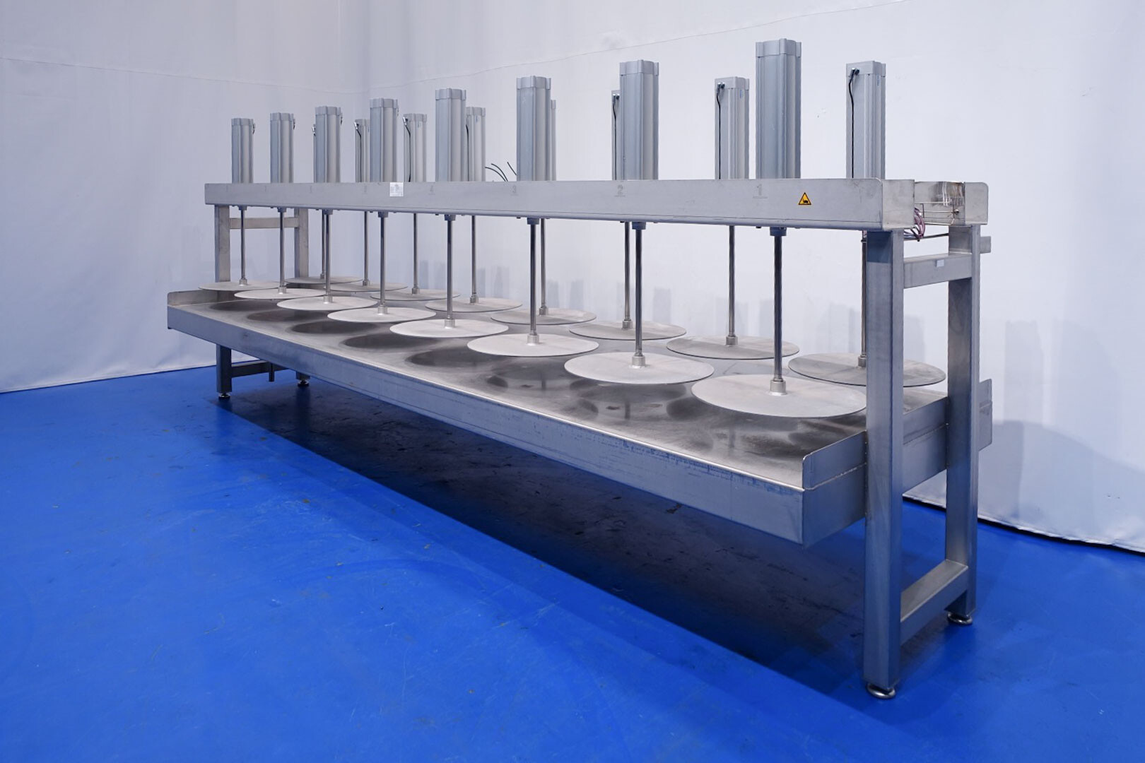 Kaaspers, met 16 cilinders. Geschikt voor semi- en grote kazen. Frame volledig van roestvrij staal met Festo aluminium cilinders. Staat: uitstekend en in werkende toestand (video beschikbaar). Tafel met verhoogde rand aan de zijkant en 2 x afvoerpunt aan de voorkant en achterkant. Met 4 x verstelbare voeten. Max druk per cilinder: 12 bar. Hoogte per plaat (cilinder in) tot tafel is 58 cm. Grootte werktafel (binnen opstaand randje) is 483,5 x 130 cm. Momenteel zonder bediening. Teken specificatie: 13014-PRS. Diameter van de persplaat: 56 cm.