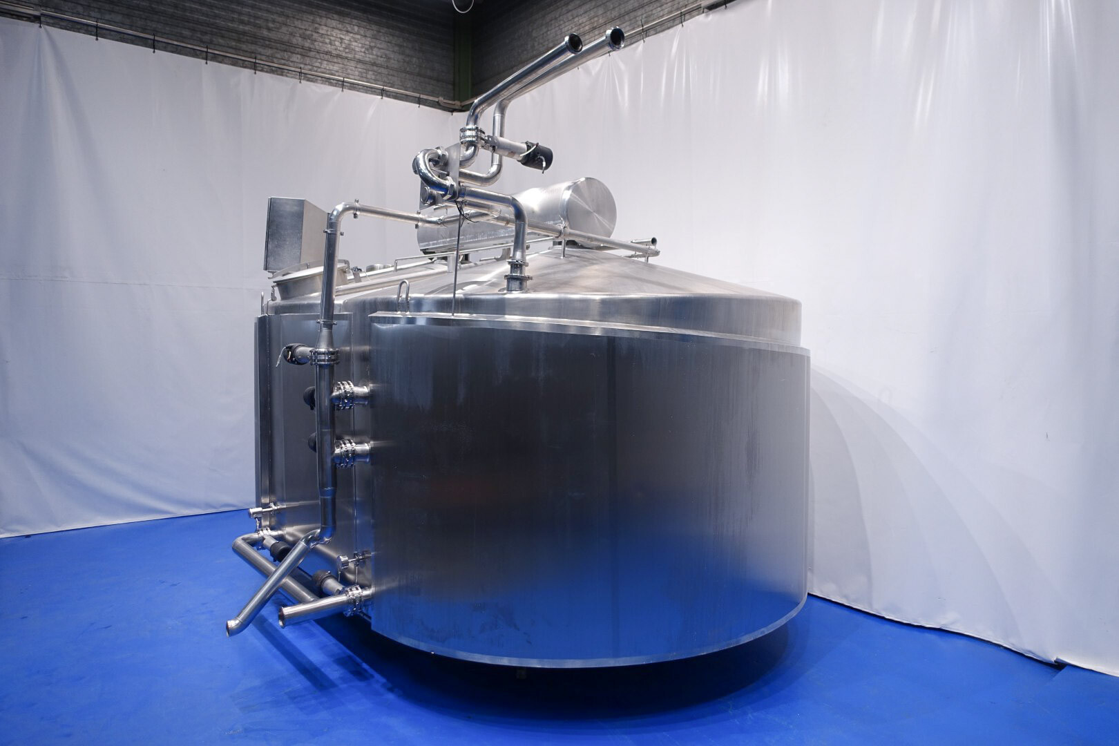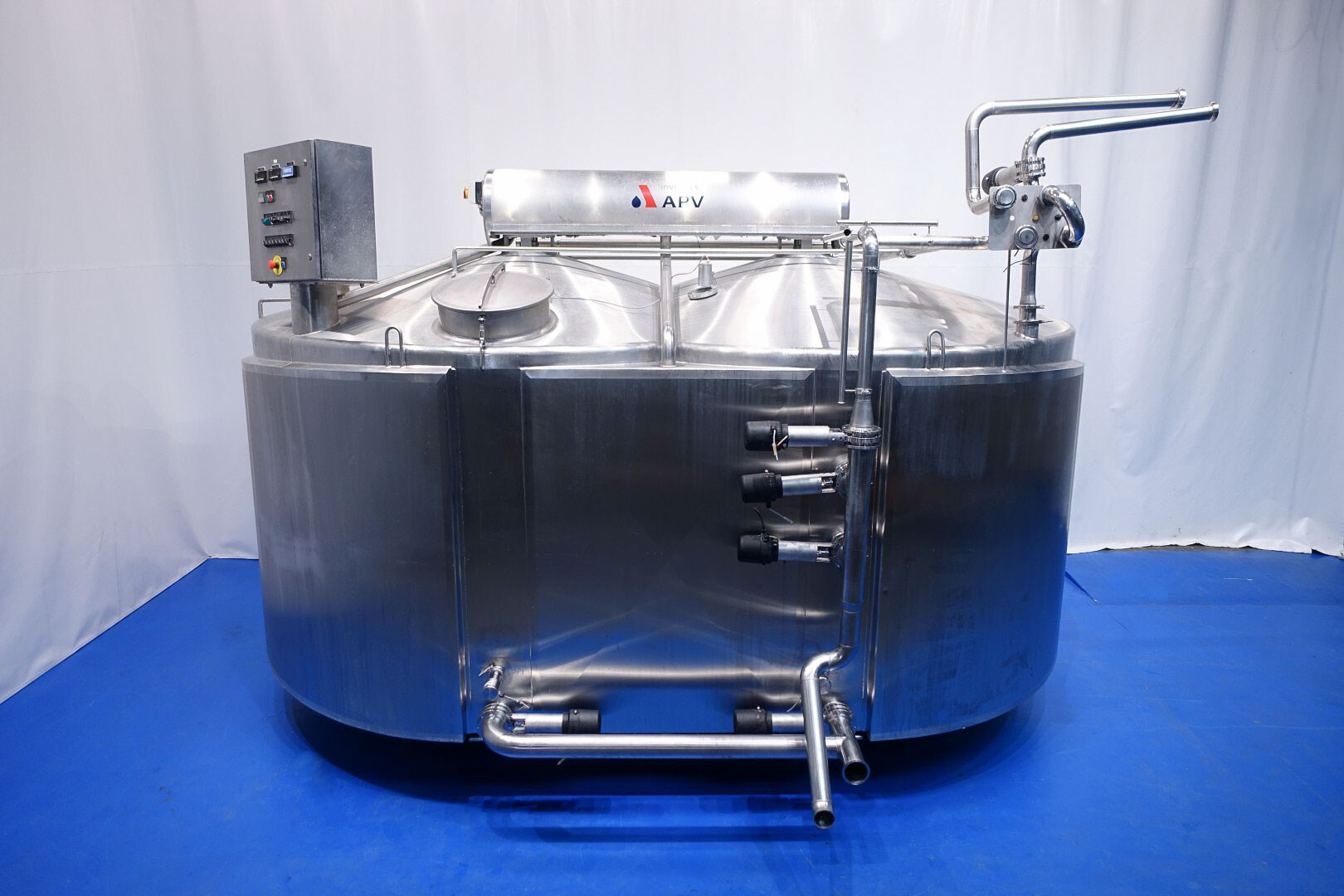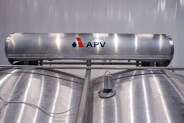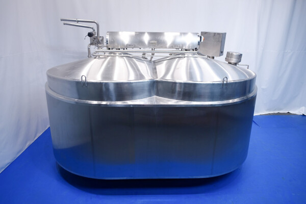 APV CurdMaster 18.000 liter kaasvat. Speciaal ontworpen voor de productie van hoogwaardige wrongel en wei. Het vat is geschikt voor de productie van de meeste soorten kaas, variërend van harde en halfharde soorten zoals Goudse kaas, Cheddar, Edam, Tilsiter etc., tot zachte/verse soorten zoals Blue Cheese en Feta en Pasta Filata. Vat is van roestvrij staal, dubbelwandig en geïsoleerd. Mangat met rooster en sensor, licht. Wei-aanzuiging via de zijkant van het vat op 75-50% van het volume. Sensoren voor druk (voor volume) en temperatuur. Ontluchter met beschermingsrooster, stoom aangesloten op de dubbele mantel om de wrongel tijdens het proces te verwarmen. 2 x uitvoer pneumatische vlinderkleppen. CIP reinigbaar door sproeiballen. Compleet met alle invoer-/uitvoerkleppen. Controlepaneel en bedieningspaneel op de kaasbak om de roersnelheid, temperatuur en wei-wrongelkleppen te regelen.