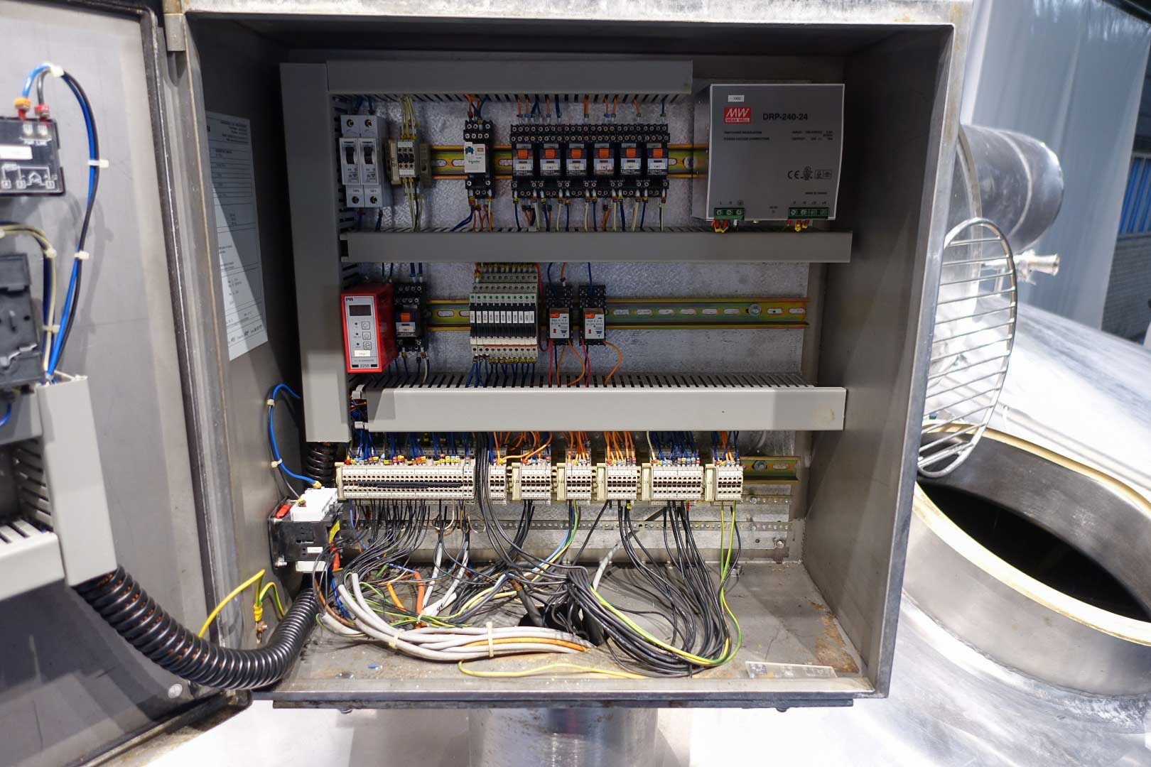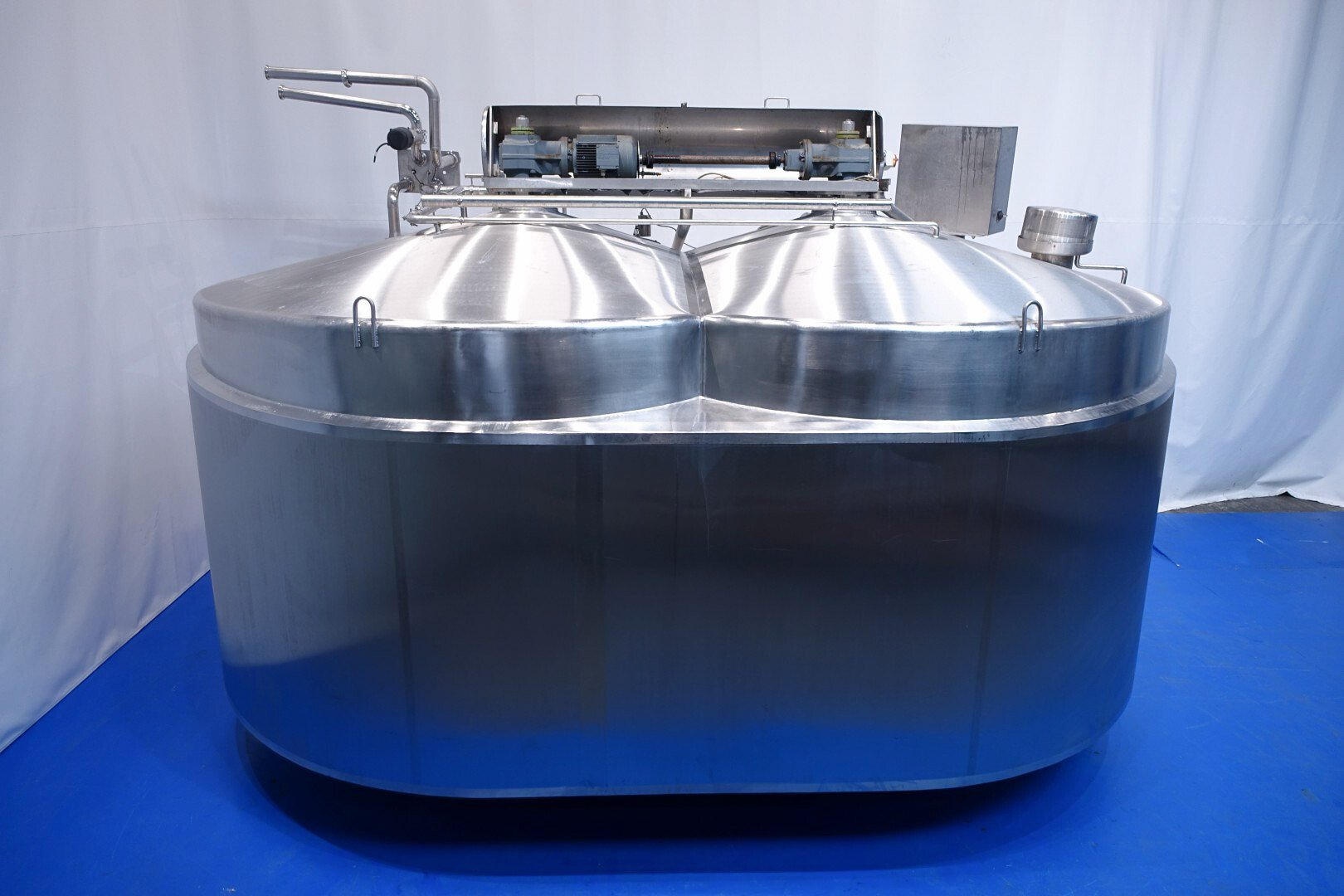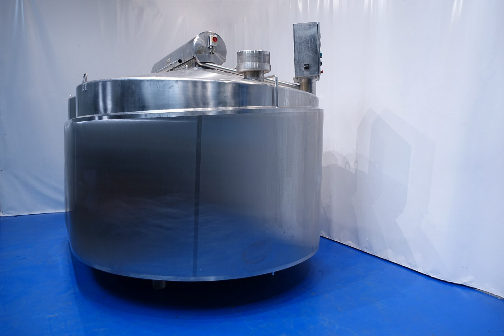 APV CurdMaster 18.000 liter kaasvat. Speciaal ontworpen voor de productie van hoogwaardige wrongel en wei. Het vat is geschikt voor de productie van de meeste soorten kaas, variërend van harde en halfharde soorten zoals Goudse kaas, Cheddar, Edam, Tilsiter etc., tot zachte/verse soorten zoals Blue Cheese en Feta en Pasta Filata. Vat is van roestvrij staal, dubbelwandig en geïsoleerd. Mangat met rooster en sensor, licht. Wei-aanzuiging via de zijkant van het vat op 75-50% van het volume. Sensoren voor druk (voor volume) en temperatuur. Ontluchter met beschermingsrooster, stoom aangesloten op de dubbele mantel om de wrongel tijdens het proces te verwarmen. 2 x uitvoer pneumatische vlinderkleppen. CIP reinigbaar door sproeiballen. Compleet met alle invoer-/uitvoerkleppen. Controlepaneel en bedieningspaneel op de kaasbak om de roersnelheid, temperatuur en wei-wrongelkleppen te regelen.