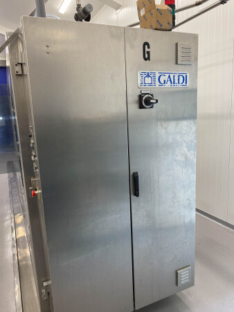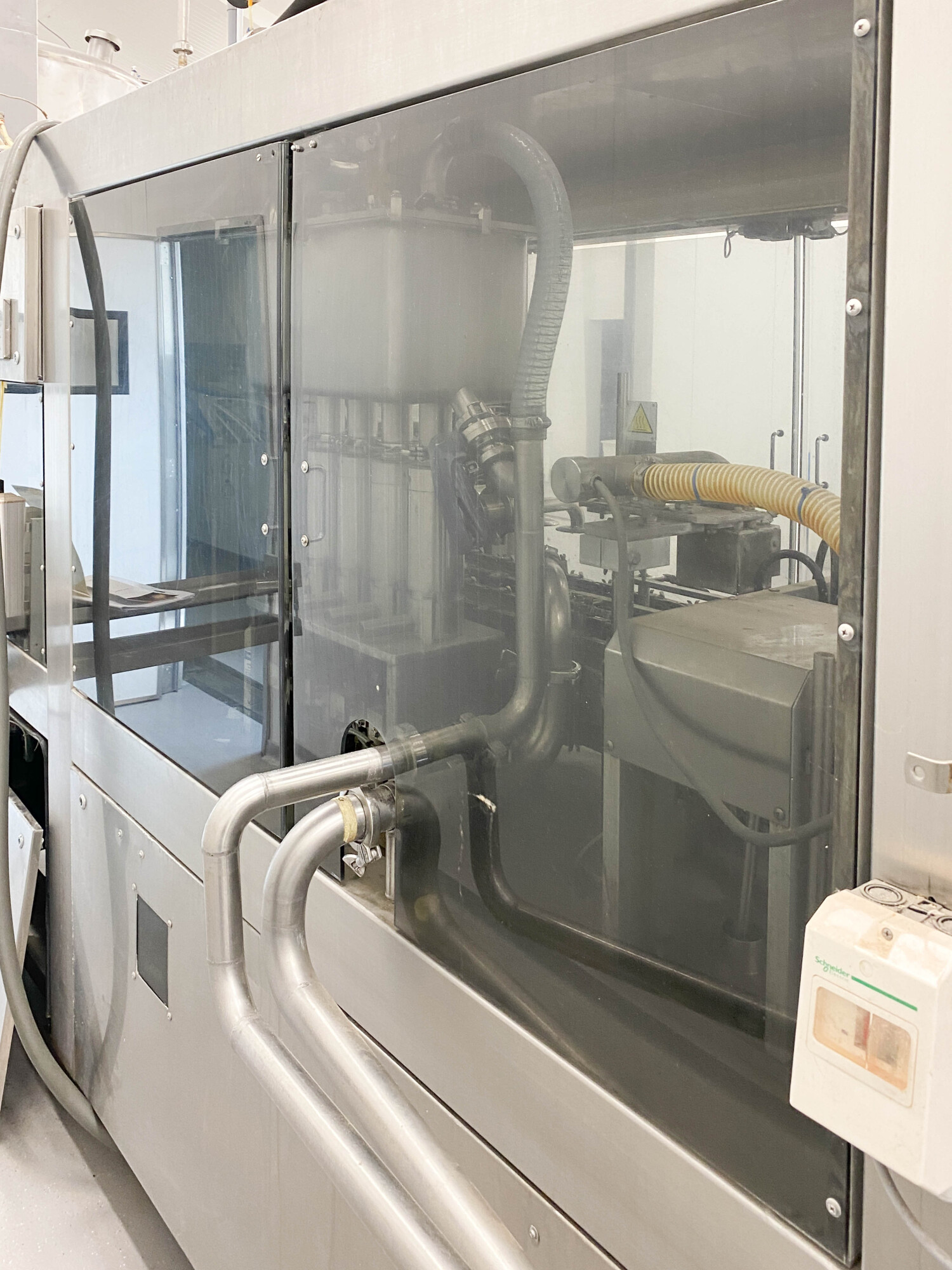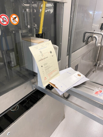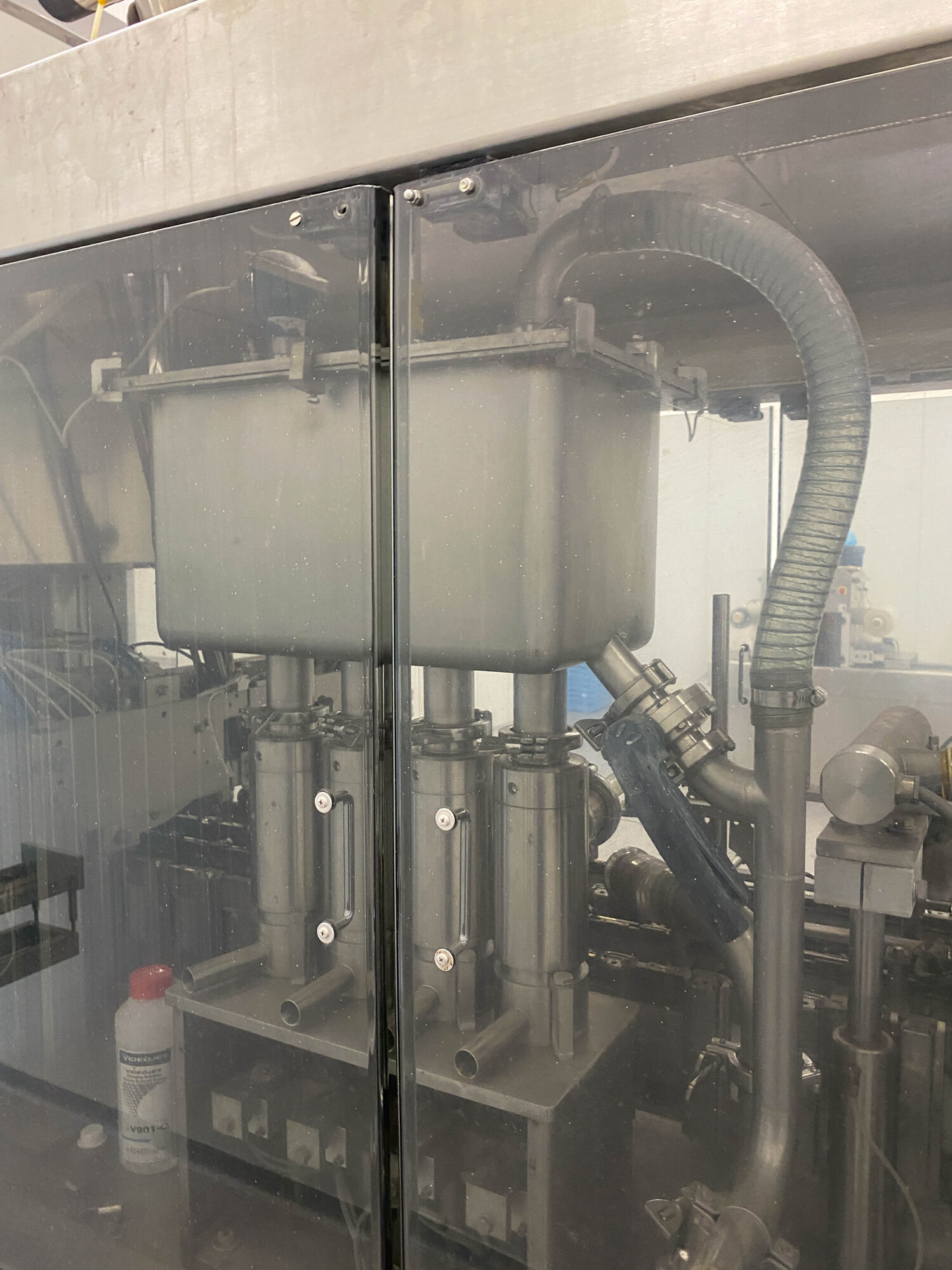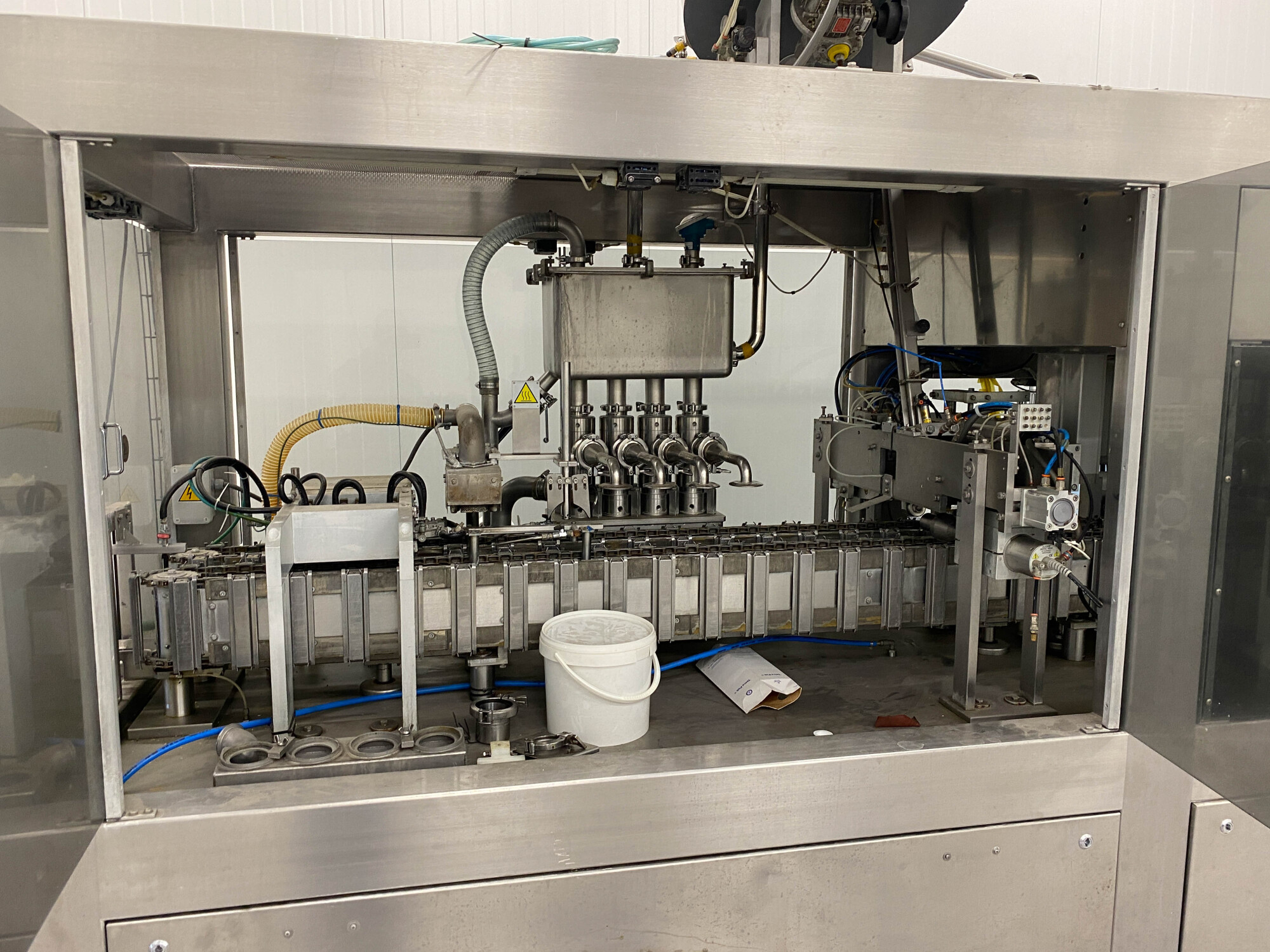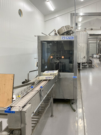 Automatische pak vulmachine, ontworpen voor het inline vormen, vullen en sealen van gable top pakken. Standaardformaat pak 70 x 70 mm., 250-1.000 ml. B-stijl dozen, 4-kops zuigervuller, CIP reinigbaar, dopapplicator model SCA machine nr.: 002SCA05 voor standaard 22 mm (Portula) tuiten, Dukane ultrasone lasser, elektrische boven- en onderverwarming, schuimzuigapparaat en uitvoertransportband. Besturing: PLC Fanuc. Inclusief doppenbunker voor dopbuffer.