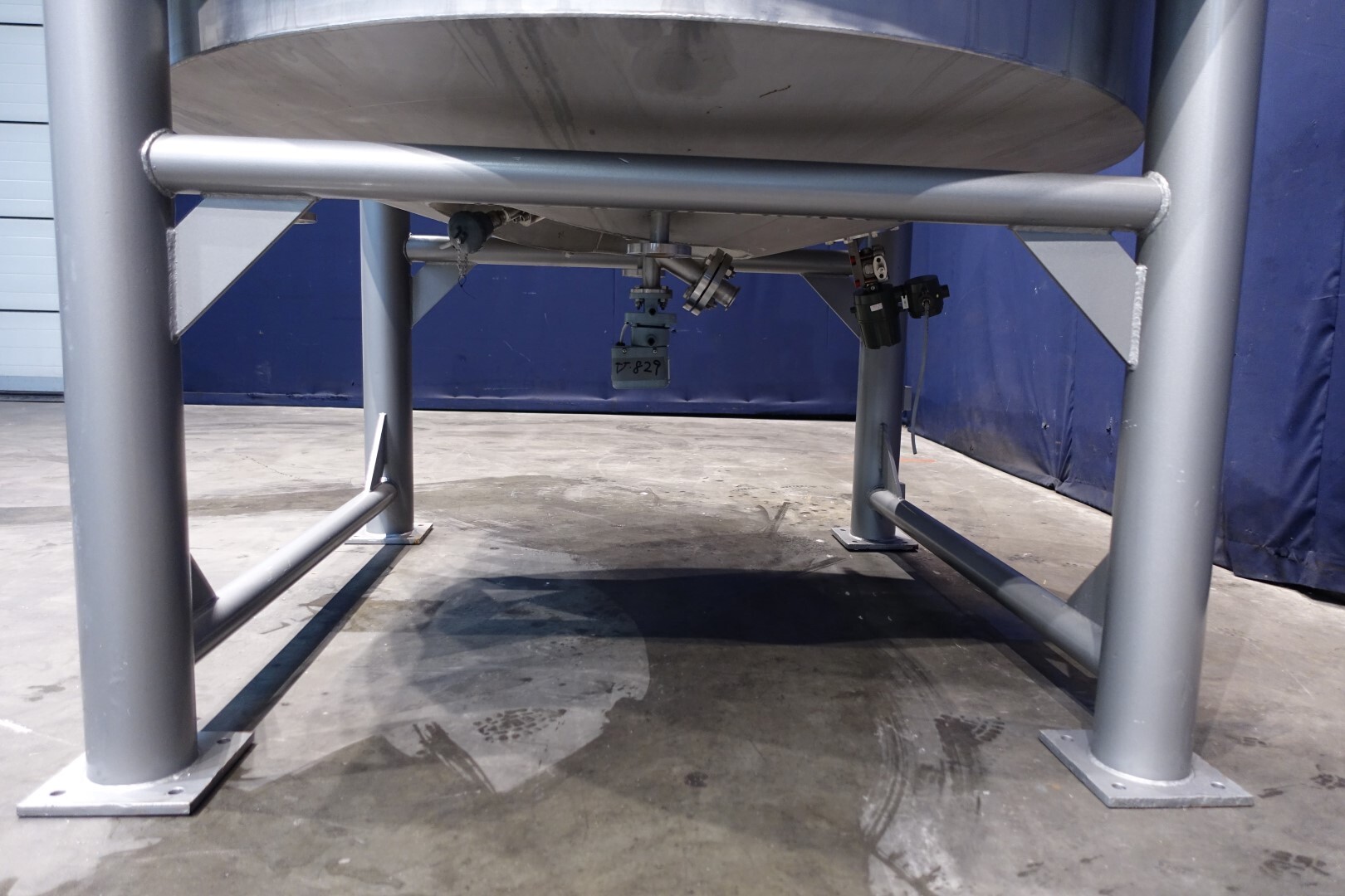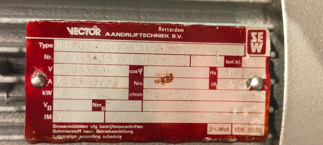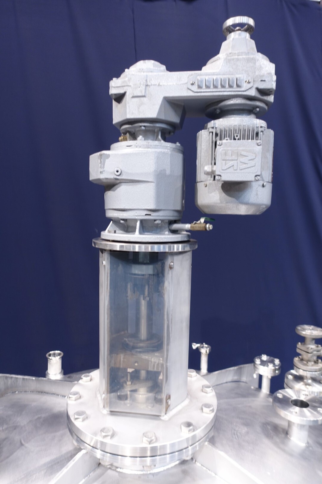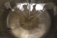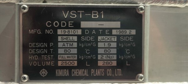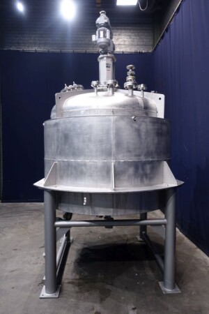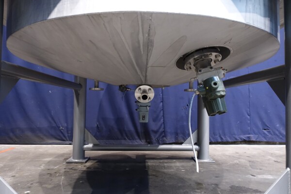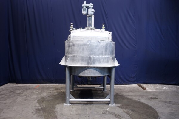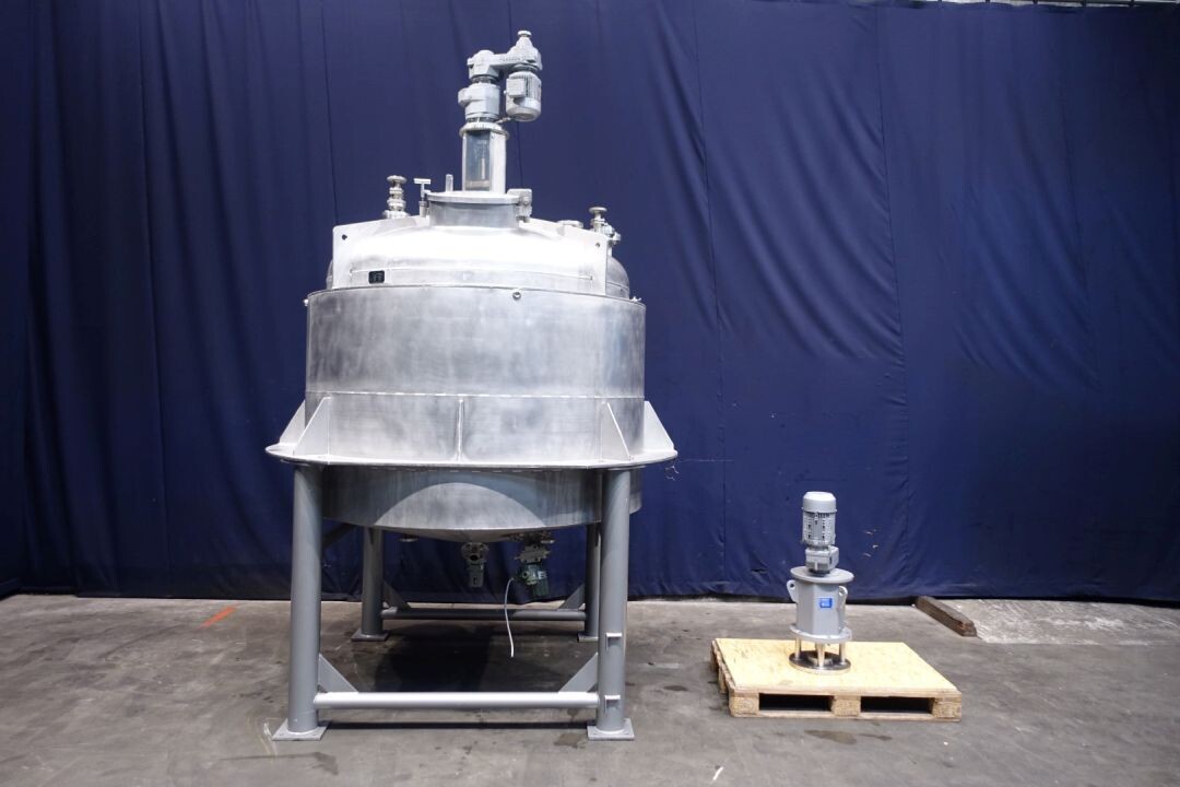 Dubbelwandige procestank, niet geïsoleerd. Aan de bovenzijde aangedreven hekroerwerk (laag toerental), in het midden geplaatst. Motorvermogen: 1,1 kW - 3,5 A, reductor met handmatige variabele snelheidsregelaar tot 3,4-29 tpm. En aan de bovenzijde aangedreven propellerroerwerk (snel toerental), uit het midden geplaatst, momenteel zonder as/roerwerk. Motorvermogen (merk Nord): 1,1 kW - 2,68 A - n1: 1.400 tpm - i 17,21 - n2: 81 tpm. Volume jas: 280 ltr - druk in jas: 1,9kg/cm2 temperatuur 80°C. Productuitlaat 2" Proefklem en uitlaathoogte: 72 cm. Inclusief pneumatische vlinder op uitlaat. 1 x Druktransmitter-sensor in bodem. 1 x Temperatuurtransmitter-sensor in bodem. 2 CIP-spuitschalen. Mangat in top rechthoekig 45x32 cm. Aan stalen frame met 4 Voeten. Binnenafmetingen tank: Ø170 cm en hoogte 135 cm. Totale afmetingen: 190 x 190 x 370 (*met oprijwerk) cm.
