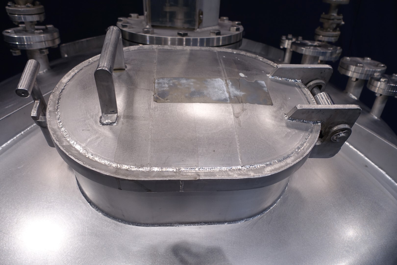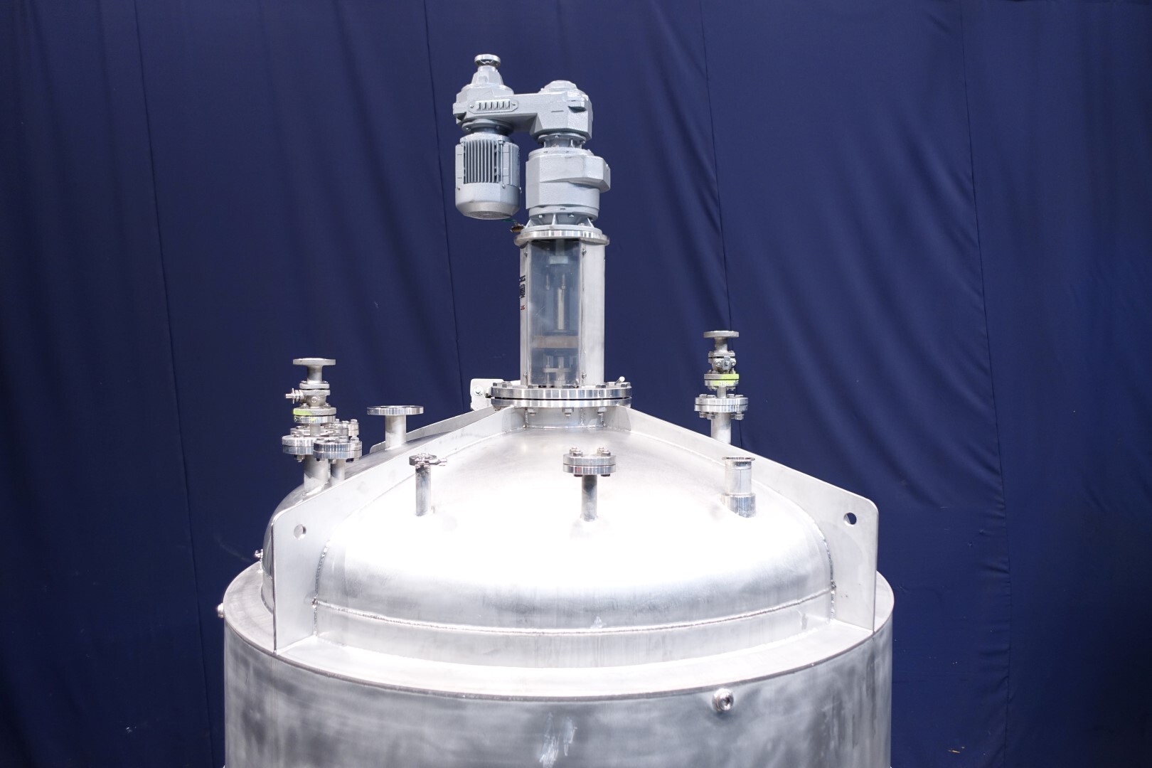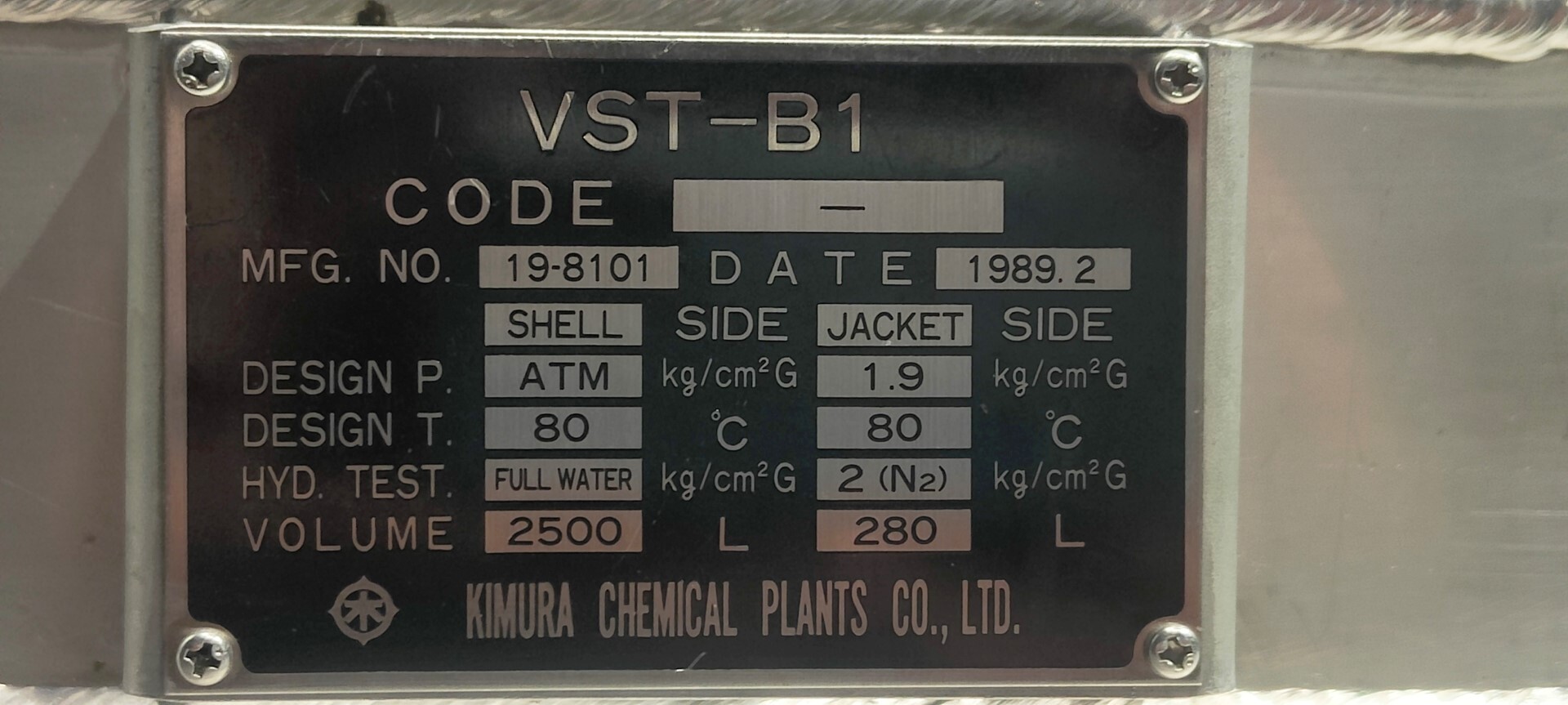 Dubbelwandige procestank, niet geïsoleerd. Aan de bovenzijde aangedreven hekroerwerk (laag toerental), in het midden geplaatst. Motorvermogen: 1,1 kW - 3,5 A, reductor met handmatige variabele snelheidsregelaar tot 3,4-29 tpm. En aan de bovenzijde aangedreven propellerroerwerk (snel toerental), uit het midden geplaatst, momenteel zonder as/roerwerk. Motorvermogen (merk Nord): 1,1 kW - 2,68 A - n1: 1.400 tpm - i 17,21 - n2: 81 tpm. Volume jas: 280 ltr - druk in jas: 1,9kg/cm2 temperatuur 80°C. Productuitlaat 2" Proefklem en uitlaathoogte: 72 cm. Inclusief pneumatische vlinder op uitlaat. 1 x Druktransmitter-sensor in bodem. 1 x Temperatuurtransmitter-sensor in bodem. 2 CIP-spuitschalen. Mangat in top rechthoekig 45x32 cm. Aan stalen frame met 4 Voeten. Binnenafmetingen tank: Ø170 cm en hoogte 135 cm. Totale afmetingen: 190 x 190 x 370 (*met oprijwerk) cm.