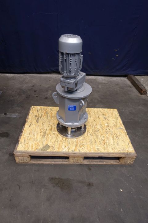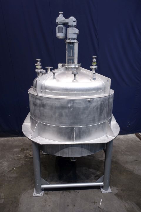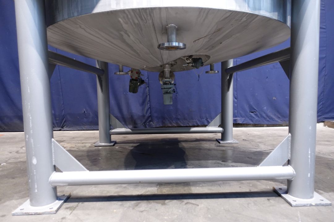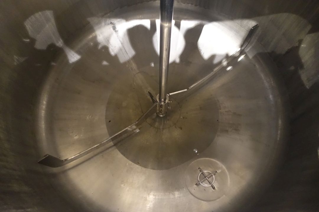 Double jacketed process tank, not insulated. Top side driven fence agitator (slow rpm), positioned in the middle. Motor power: 1,1 kW - 3,5 A, reductor with manual variable speed reducer to 3,4-29rpm. And top side driven propellor agitator (fast rpm), positioned off center, currently with no shaft/agitator. Motor (make Nord) power: 1,1 kW - 2,68 A - n1: 1.400 rpm - i 17,21 - n2: 81 rpm. Jacket volume: 280 ltr - pressure in jacket: 1,9kg/cm2 temperature 80°C. Product outlet 2" Try clamp and outlet height: 72 cm. Including pneumatic butterfly on outlet. 1 x Pressure transmitter-sensor in bottom. 1 x Temperature transmitter-sensor in bottom. 2 CIP spray bowls. Manhole in top rectangular 45x32 cm. On steel frame with 4 Feet. Inside dimensions of tank: Ø170 cm and height 135 cm. Total dimensions: 190 x 190 x 370 (*with drivework) cm. Weigth: 1.950 kg's.
