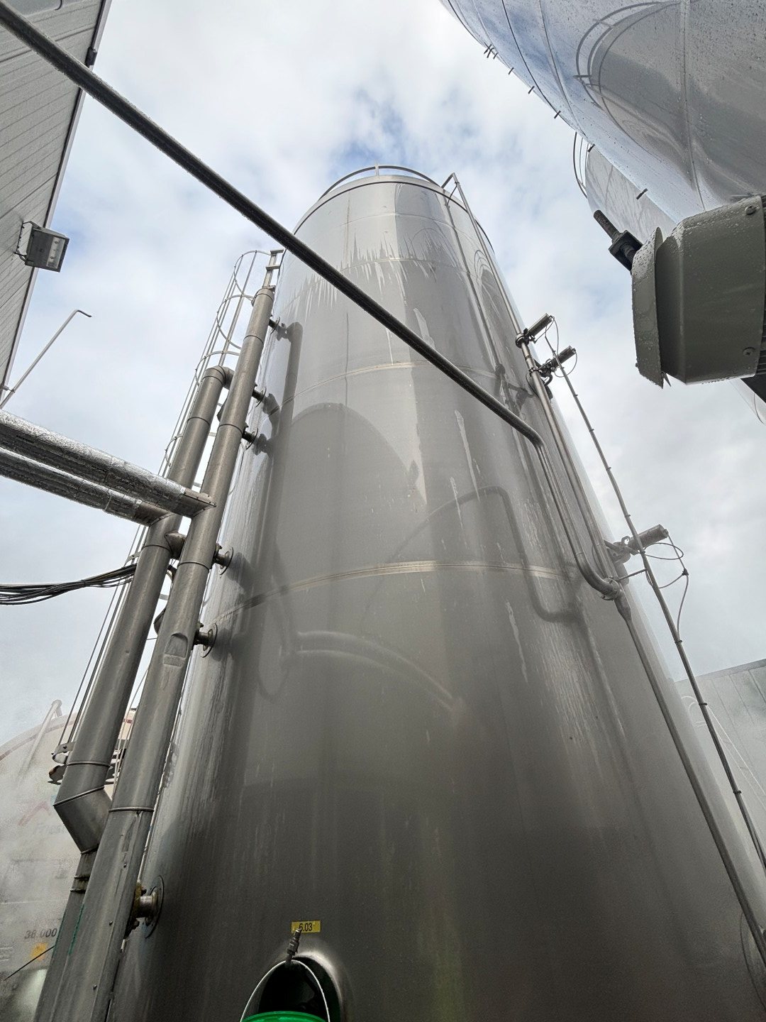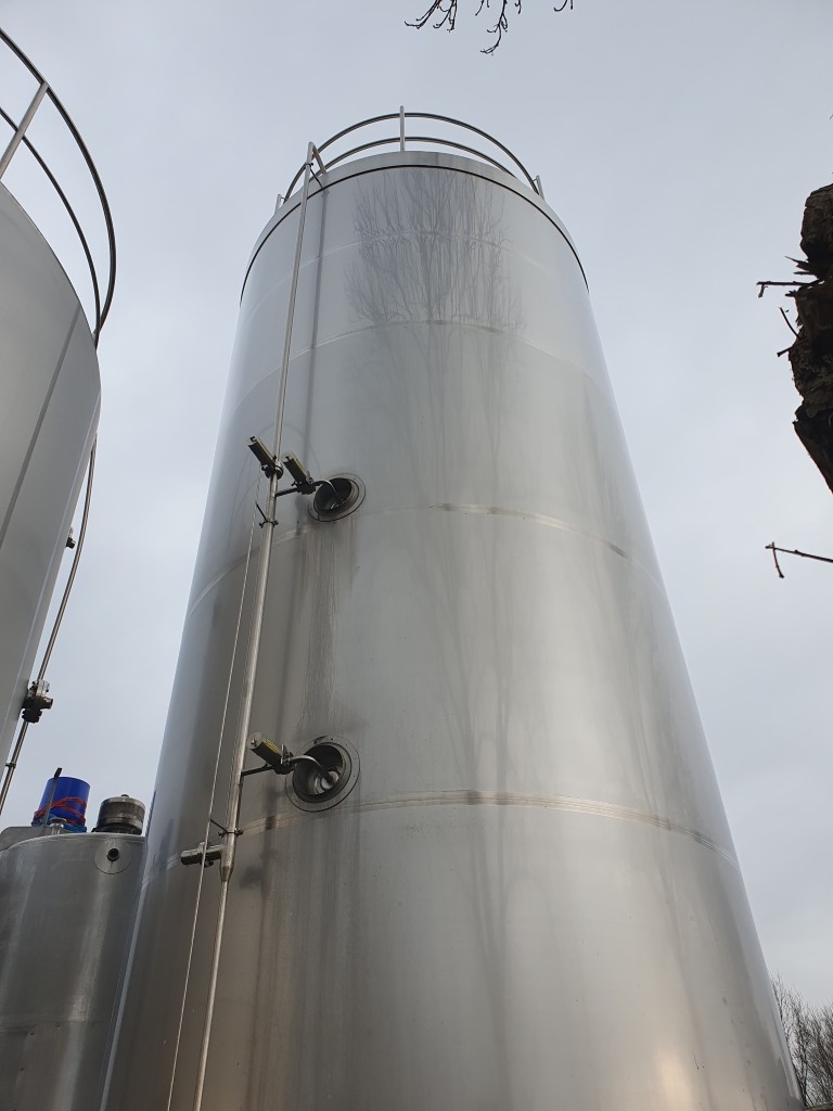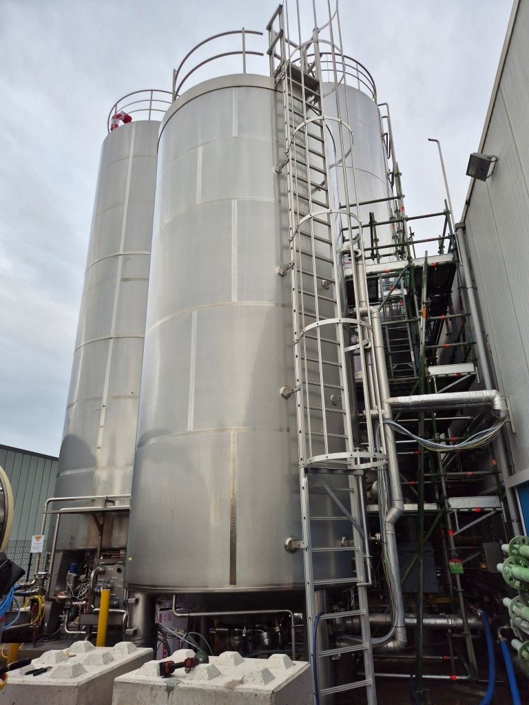 Vertical double jacketed insulated cream storage and cooling tank. Nominal volume: 40.000 liter. Design pressure: 0-0,49 bar (tank) and 4 bar (jacket). Design temperature: -10°C - 99°C (tank and jackets). Top side driven Jongia propellor agitator (centered), motor: 1,1 kW -speed: 29 rpm. Insulated, side and bottom. With 3 x cooling sections; 1 x bottom 3,6 m2 and 3 x side 10,7m2 (total 35,7 m2). Previously used for cream storage and cooling via glycol from 8°C -> 4°C in 4 hours. Product outlet pipes 2,5" with 2x pneumatic tank outlet valves. Outlet height ca. 71 cm. With cleanable sample valve. In botom 3 x sensor: temperature, pressure and level. In top level sensor, sightglass with lamp and breather. 4 CIP spray bowls (1 in top, 3 in side). Manhole in top, round Ø ca. 50 cm. 4 Adjustable feet. Inside dimensions of tank: Ø 265 cm and cylindrical heigth: 650 cm. With alu cage ladder mounted on side. Documentation inculding drawings available. Total dimensions: 295x295x920 cm - weight: 4.600 kg.