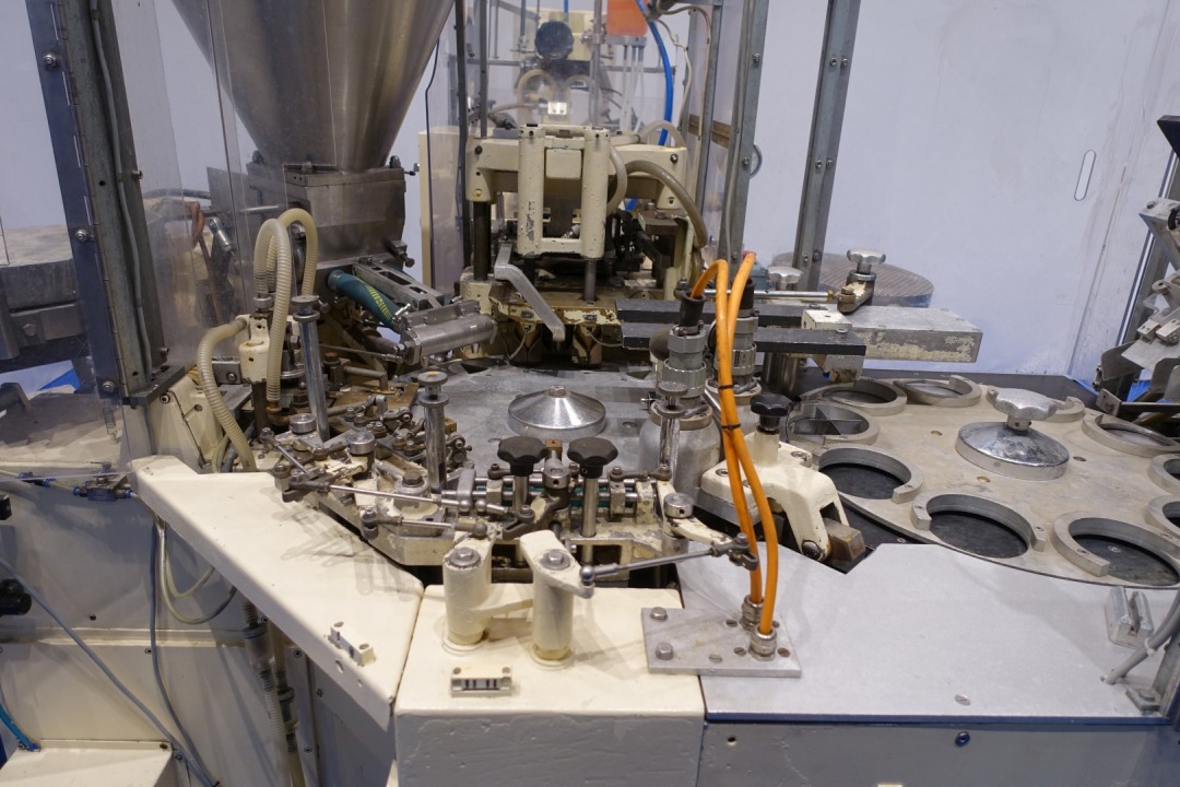 Filling, wrapping and labelling machine for triangle portions of processed cheese with automatic collecting/boxing into pre-formed carton boxes. The empty box with cover are fed in the top of the machine (no automatic infeed system of boxes). The machine opens the box, fills with the portions and closes the box. Filling machine is double head. Current format triangle portions, 17,5 and 25gram. Cluster: 8/8, Ø 109 mm, 140 /200 gram per cluster. Single strip easy opening system (tear cell / Tircel) for inserting of red tape into a packed portion for easy opening of the portion. Capacity: 240 portions per minute. Double jacketed hopper of ± 100 liter with agitator. Product consistency warm, semi-liquid, filling temperature 75-90 °C. Label application with cold glue tank. Including control panel. Casing by doors with stainless steel frame and polycarbonate windows. Total dimensions: ca. 350x300x220 (lxwxh) cm - weight: +/- 2.700 kg. Currently without box infeed system.