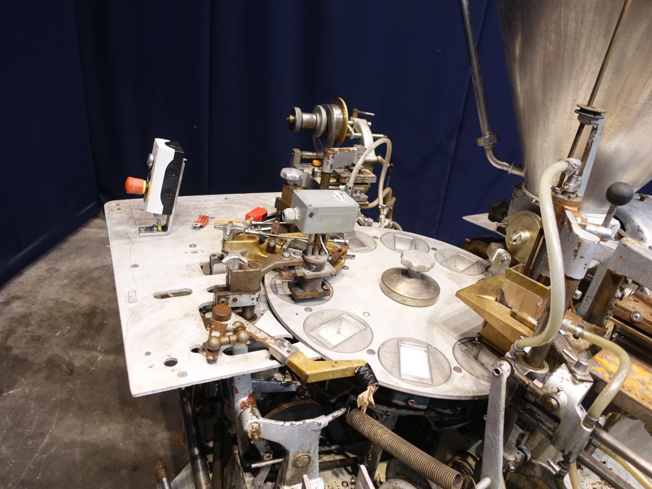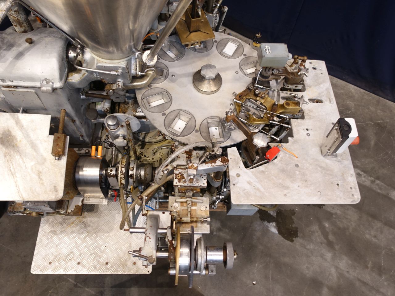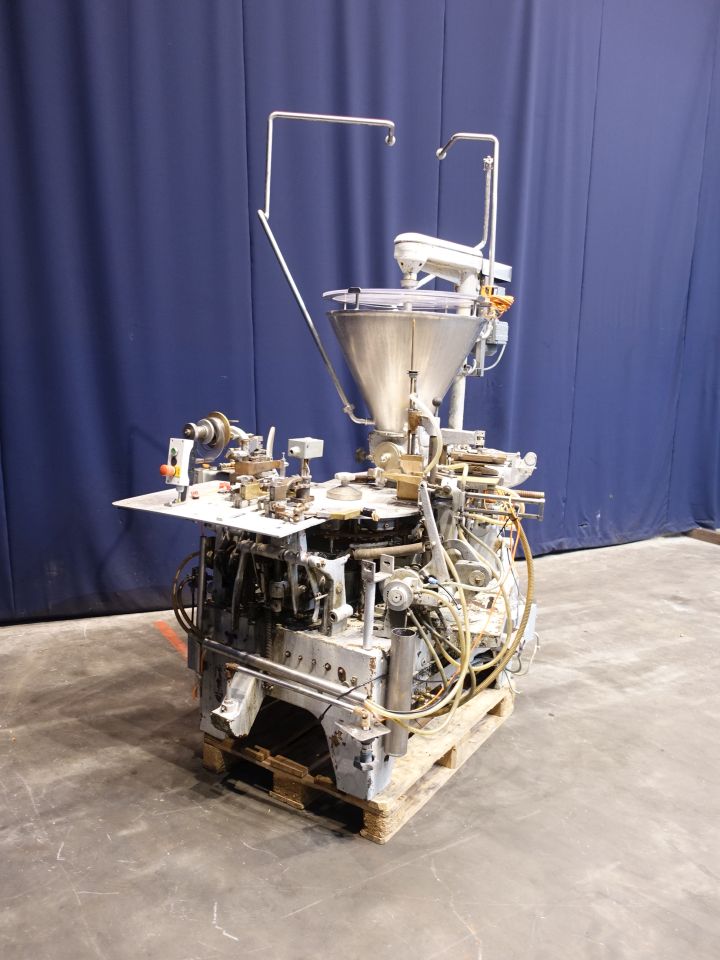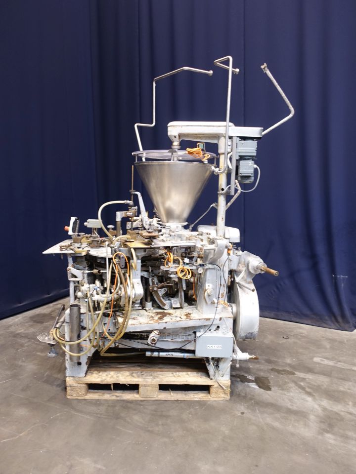 Automatic filling and wrapping machine for processed cheese or cream cheese. Liquid hot fill. 10 Step turn table. Current format: 100 gram, ± 50 x 80 x 26 mm. Feeding by double jacketed hopper with agitator. Bottom foil forming, filling, top foil cutting and placing on product, heat sealing and outfeed arm to conveyor. STN14385 + STN14386 have been running together in the same factory. The following parts are used for both machines, but will be sold with STN14385: several transport conveyors, collector to collect by 6 pieces from 2 conveyors to 1, control panel, vacuumpump, pallet-elevator for easy putting boxes on pallet (by hand). Total dimensions Kustner machine: 240 x 320 x 250 cm. Has been running together with STN14386, STN14387 and STN14388.
