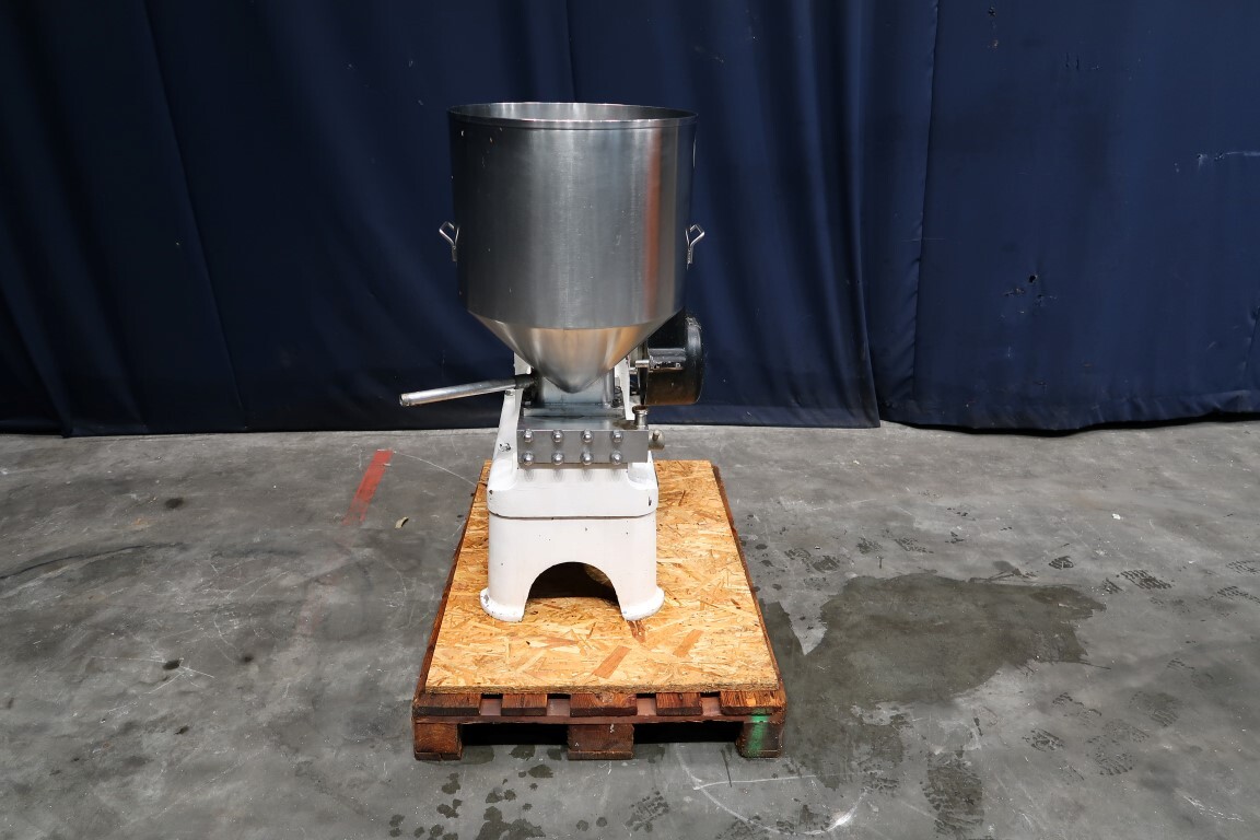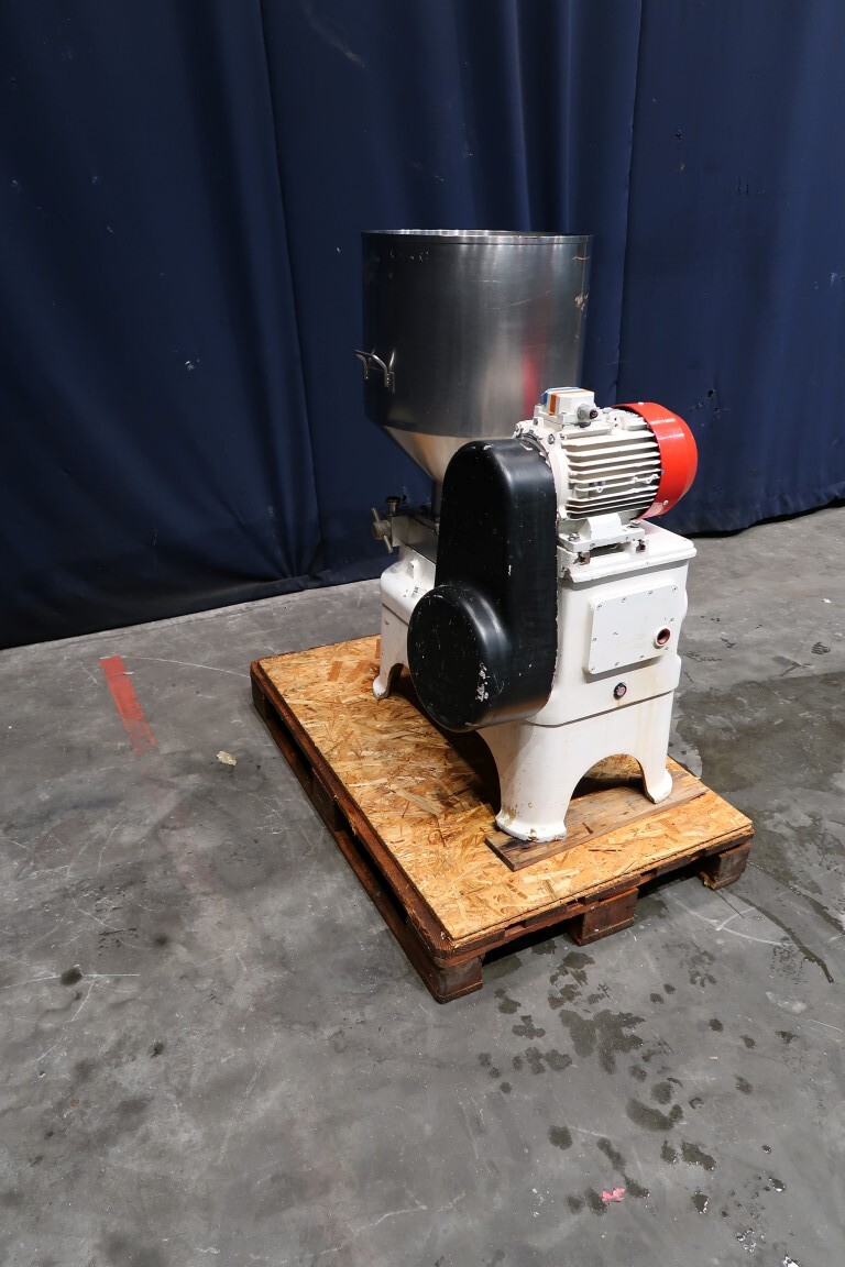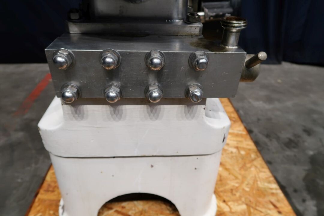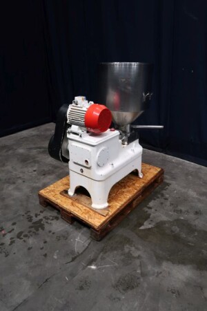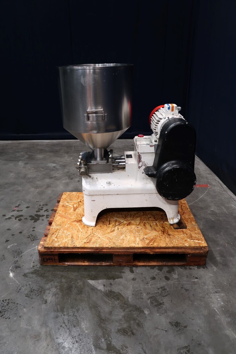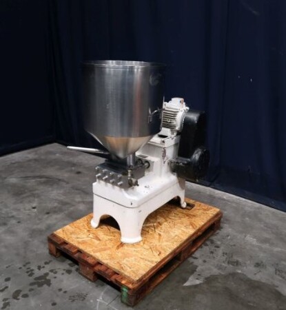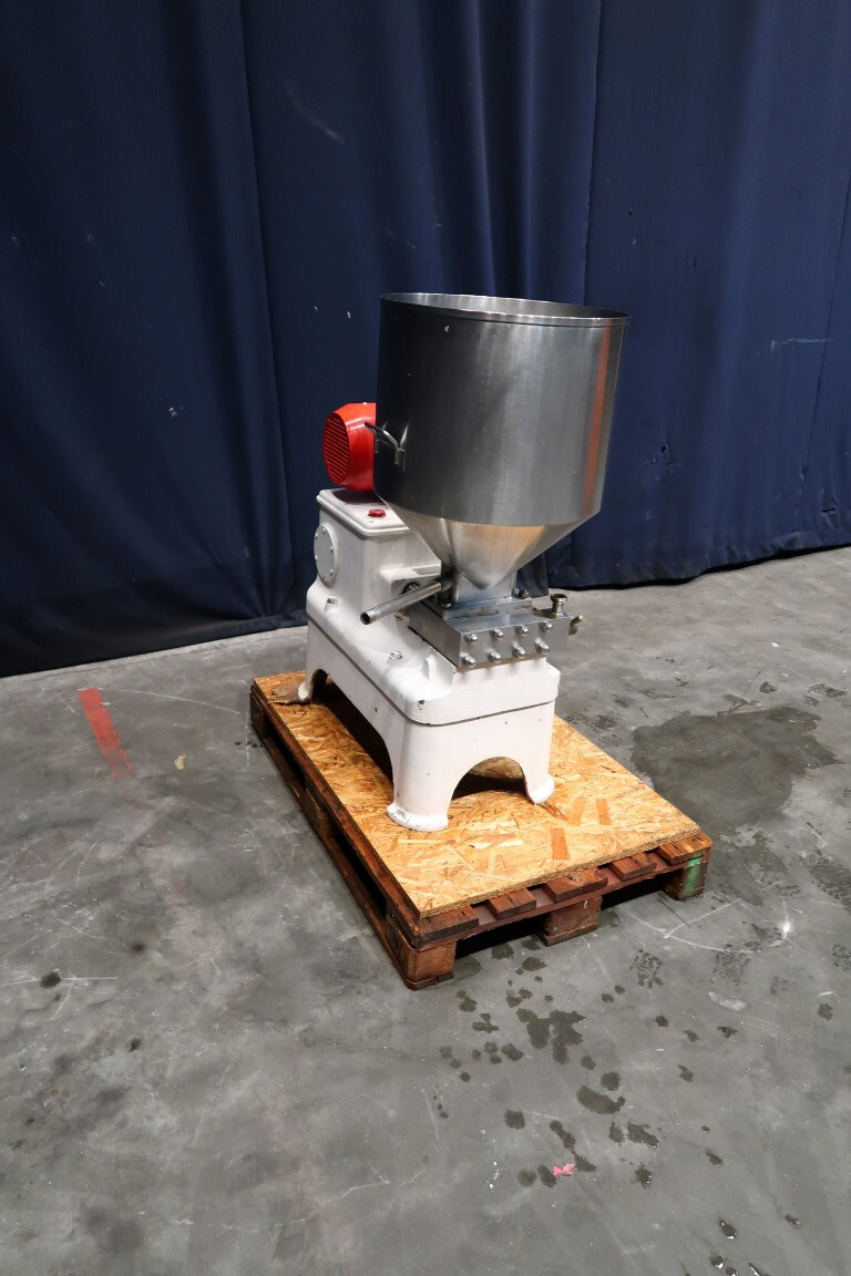 Speciale kwark gladmakende homogenisator, met obturatorbehuizing, speciale schroeftype homogenisatiekop, op verzoek te vervangen voor een min of meer gladder resultaat, 3 zuigers, zuigerdiameter 40 mm. Aansluitingen: invoertrechter, inhoud: 80 ltr. Motorvermogen: 4 kW werkdruk 85 bar.