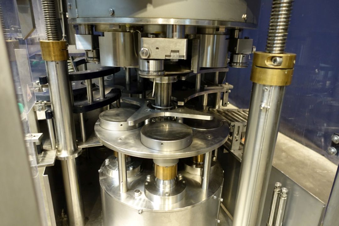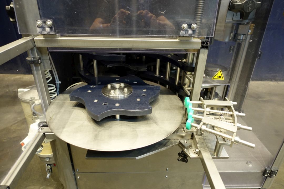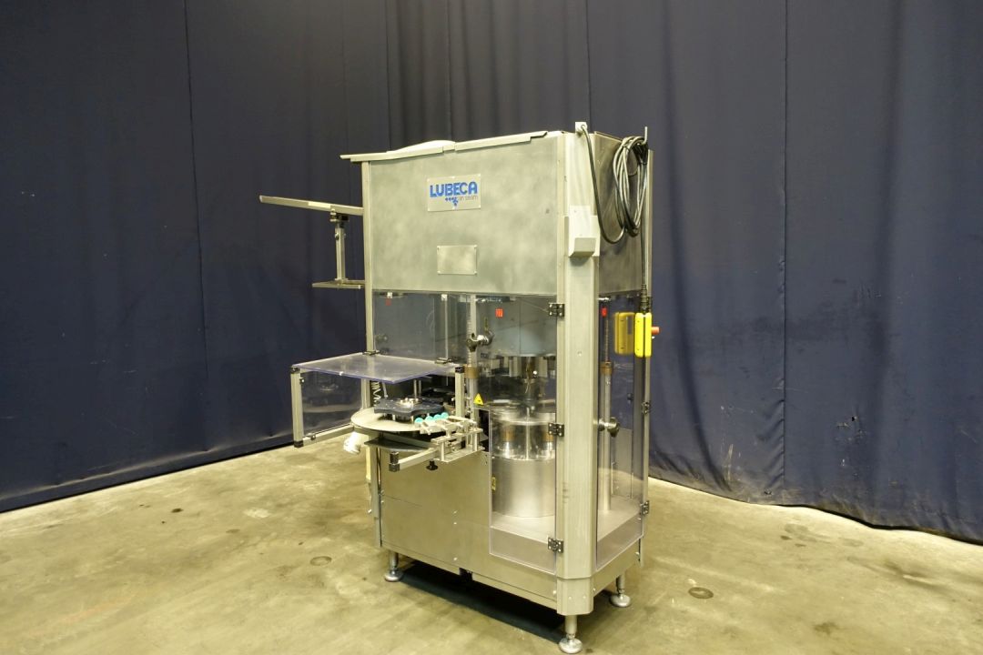 Metal Can closing, seaming machine. Stand-alone and fully automatic. Suitable for seaming lids onto cans, equipped with 4 seaming stations. Working principle: The incoming cans are synchronized to the machine by a specially constructed infeed gear-wheel. An electro-pneumatic system manages the required feed of lids as required (“no can –no lid”). After separation of the lid in the lid magazine, it will be fed to the transfer point of lid & can via the lid/can transfer turret. During its cam-controlled upward movement the filled can receives the lid, which was laid out in a special lid slide. Can and lid are clamped between lifter plate and seaming head.The can is seamed by a start roll and finish roll while the cans are rotating during the seaming process. After the seaming process, the cans are handed over to a outfeed conveyor. Can diameter: 127 mm. Range of can diameter according brochure: 99-153 mm and height 20-250 mm.Electrical: 400 V - 50 Hz - 3,5 kW. Total dimensions: 130 x 120 x 240 cm. Machine is without control panel!