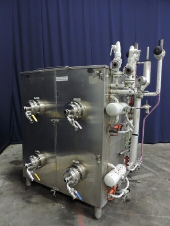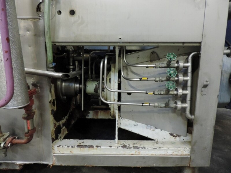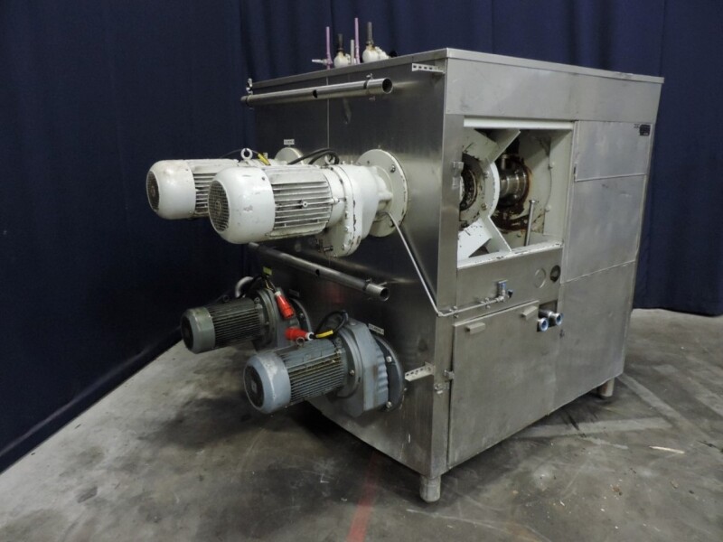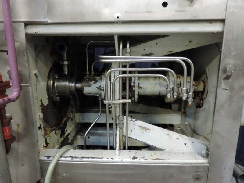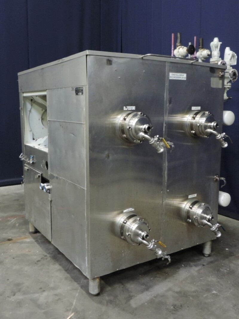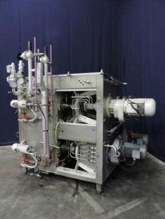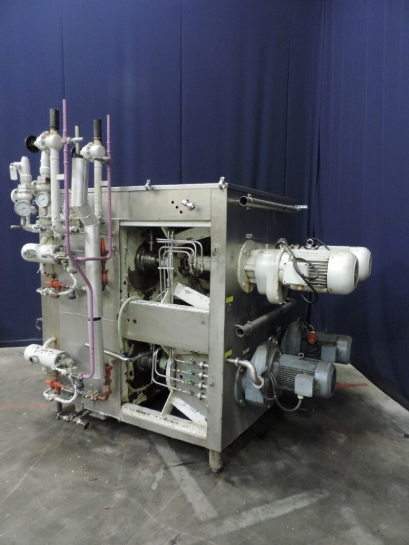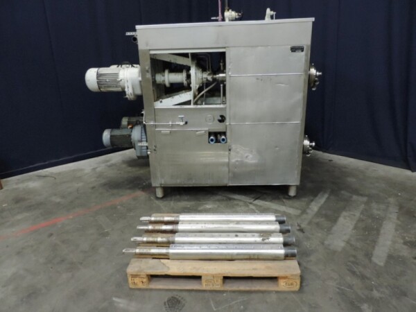 Kristallisator - Geschraapte warmtewisselaar voor margarine of shortening. 4 productcilinders aangedreven door 4 onafhankelijke motoren, 2x 5,5 kW + 2x 7,5 kW. Cilinder: Ø 120 mm, lengte 820 mm, koeloppervlak per cilinder 0,62 m². Druk productzijde: 20 bar. Koelmedium: ammoniak (NH3) - druk servicezijde: 18 bar - temperatuur -20 / 45°C. 2x Onafhankelijke ammoniaksystemen inclusief ammoniakregelventielen. Inclusief 4 reserve rotoren en handleiding voor reserve onderdelen. Exclusief de schakelkast en besturing.