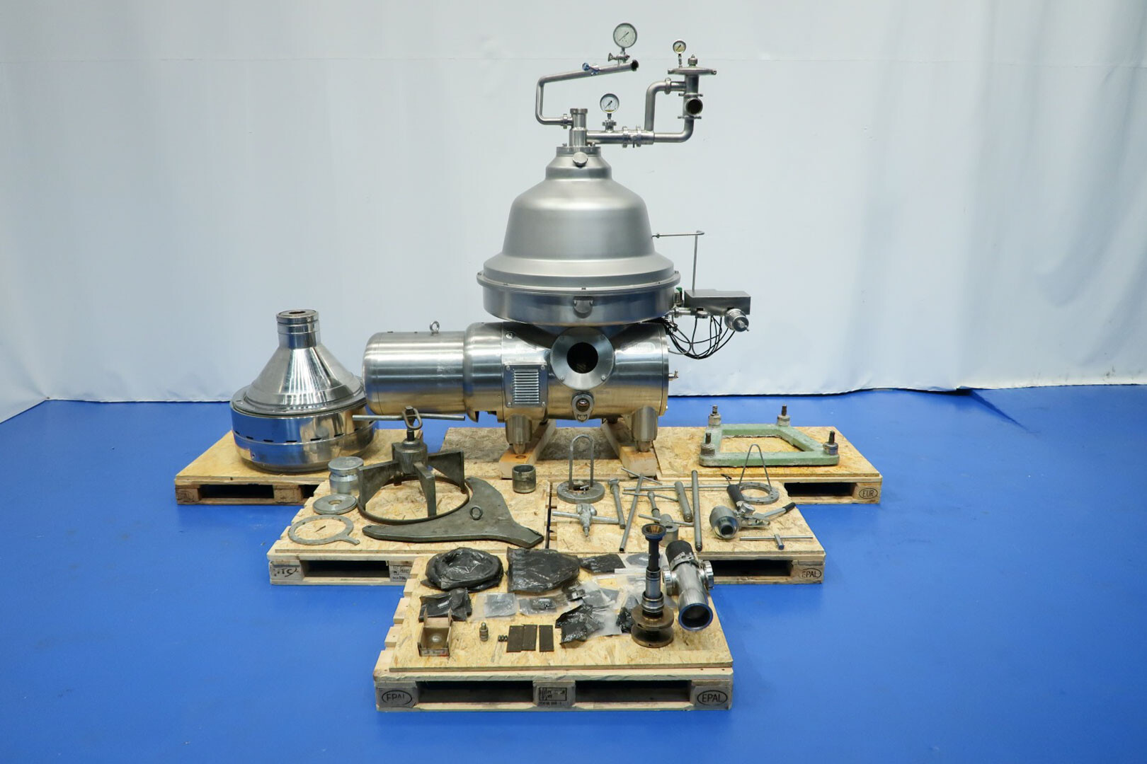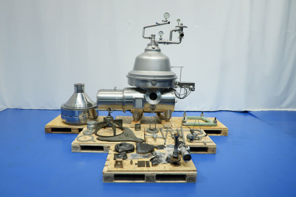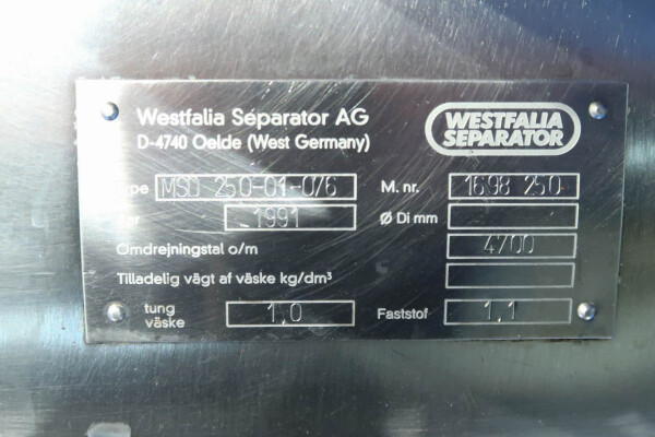 De Westfalia MSD 250-01-076 melk skimmer is ontworpen voor hoge efficiëntie en betrouwbaarheid in de zuivel verwerkende industrie. Het is een hoogwaardige schijfstapelseparator die zich onderscheidt door zijn zelfledigende werking. De scheidingskom maakt een efficiënte scheiding van vloeistoffen en vaste stoffen mogelijk, met vloeistofafvoer via een dubbele grijper, wat zorgt voor een betrouwbare en continue lediging tijdens het gebruik. Met een maximale trommelsnelheid van 4700 tpm en een doorvoercapaciteit van 30.000 liter per uur is deze separator ontworpen om te voldoen aan de eisen van grootschalige melkverwerkingsbedrijven. De melkafschuimer is zelfreinigend. Inclusief kom, motorkap, frame, pneumatisch tegendrukventiel voor melk, monsterventiel op de uitgaande room en OWM. (flowindicator voor uitgaande room kan worden gemonteerd.) Motor 37 kW – 72 A – 1475 tpm – 50 Hz. Tevens inbegrepen: dubbele CPM (Tetra model D60) met vloeistofkoppeling, een set gereedschap en reserveonderdelen. De documentatie omvat de gebruiksaanwijzing en de onderdelenlijst.