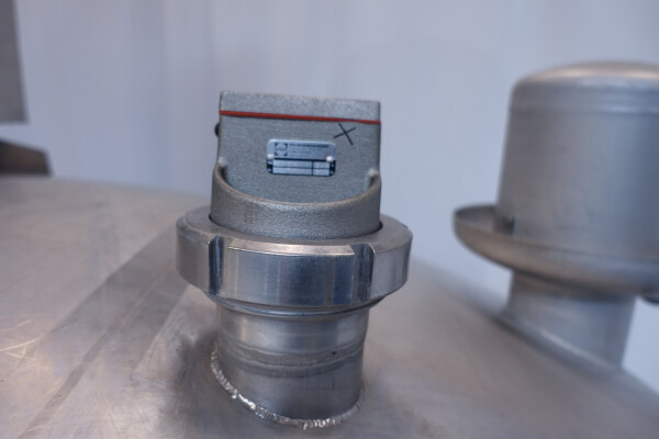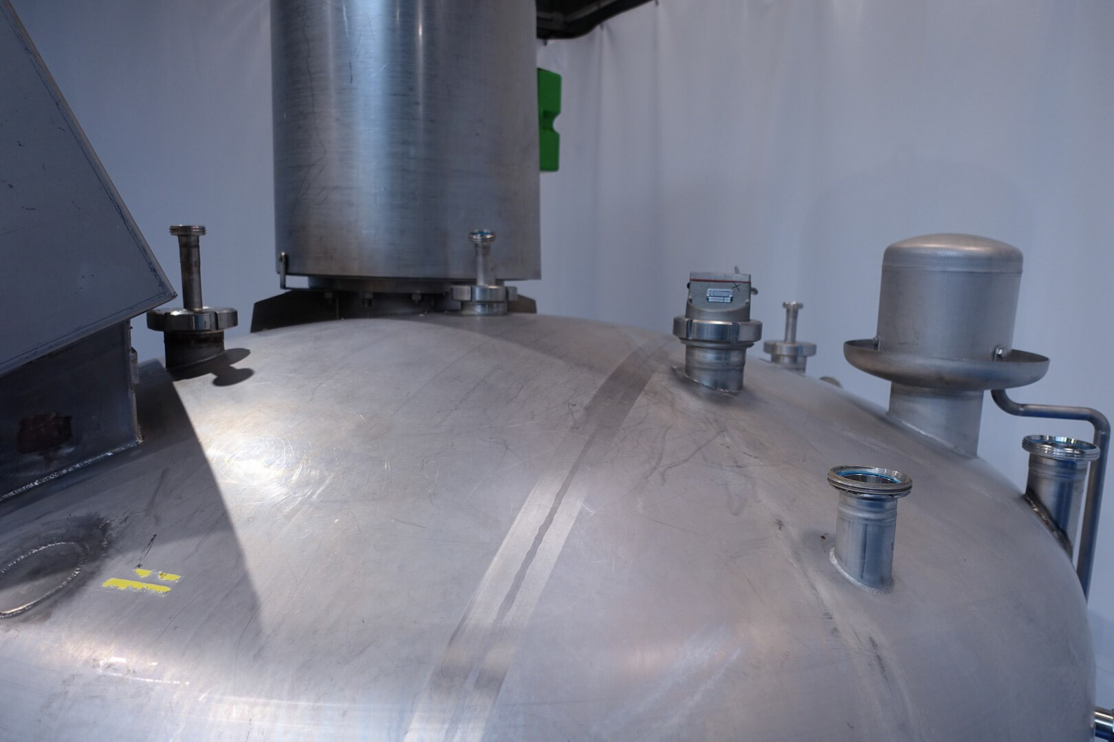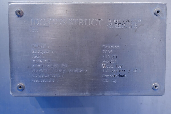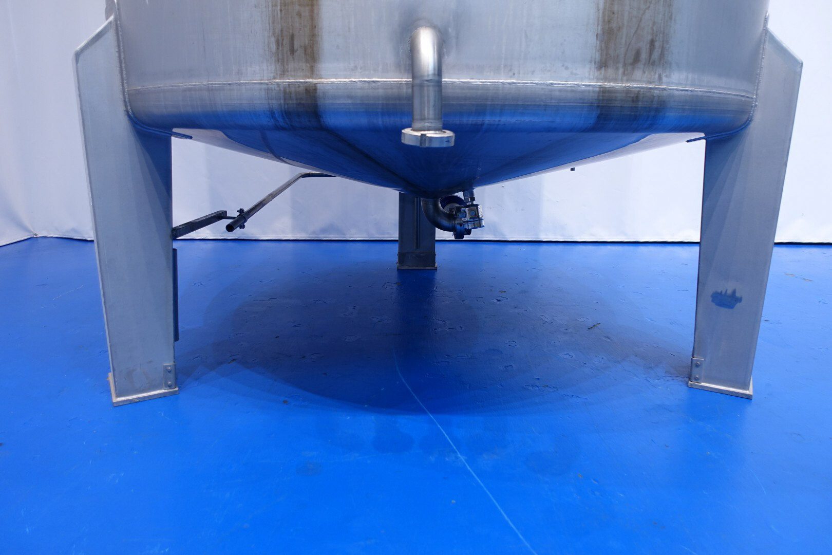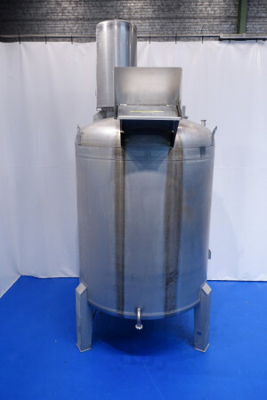 Mix and powder dissolving tank with extreme powerfull agitator on top with toothed disk dissolver 45kW. Lamp on top of tank. Product outlet 1 x DN80 Din. Outlet height: 41,5 cm. Including 1 x Pneumatic outlet valve. With sensors: 2 Level sensor. Breather and1 CIP spray ball in top. Rectangular manhole/product-infeed in top: 62x36 cm, special design so bags can be cut and opened at the manhole with gas cylinder. 3 Adjustable feet on loadcells. Inside dimensions of tank: Ø 200 cm and cylindrical height 225 cm.