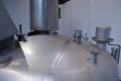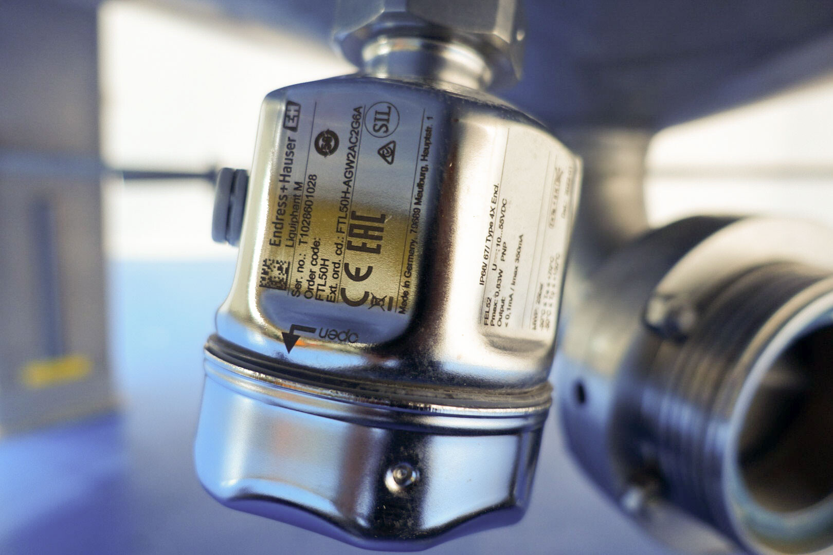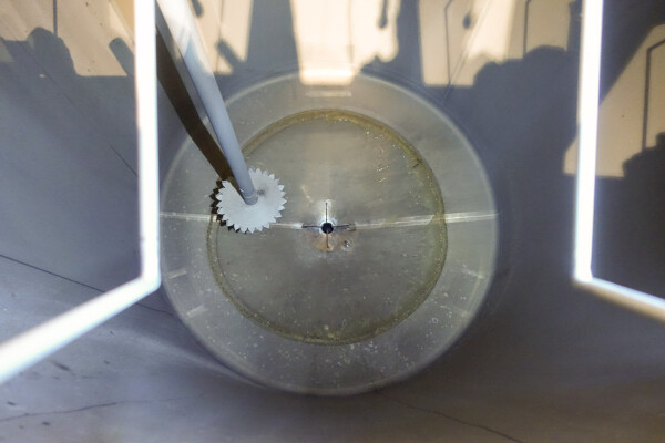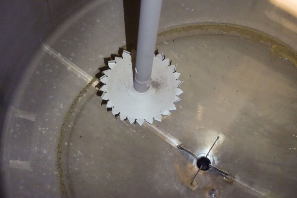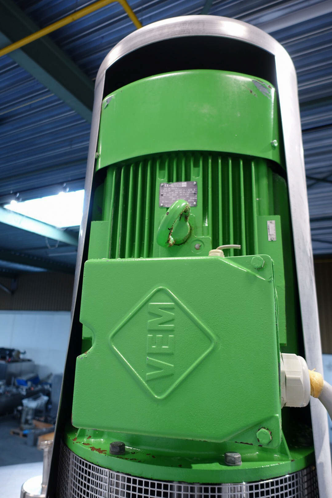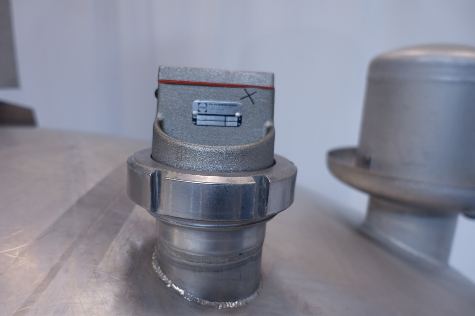 Mix and powder dissolving tank with extreme powerfull agitator on top with toothed disk dissolver 45kW. Lamp on top of tank. Product outlet 1 x DN80 Din. Outlet height: 41,5 cm. Including 1 x Pneumatic outlet valve. With sensors: 2 Level sensor. Breather and1 CIP spray ball in top. Rectangular manhole/product-infeed in top: 62x36 cm, special design so bags can be cut and opened at the manhole with gas cylinder. 3 Adjustable feet on loadcells. Inside dimensions of tank: Ø 200 cm and cylindrical height 225 cm.