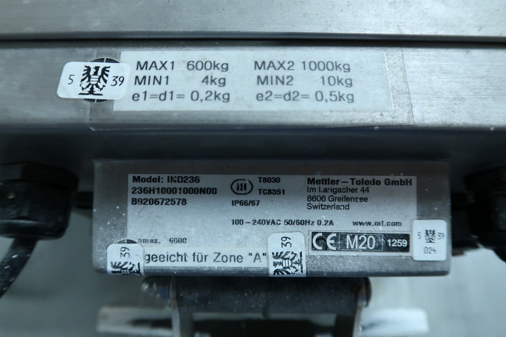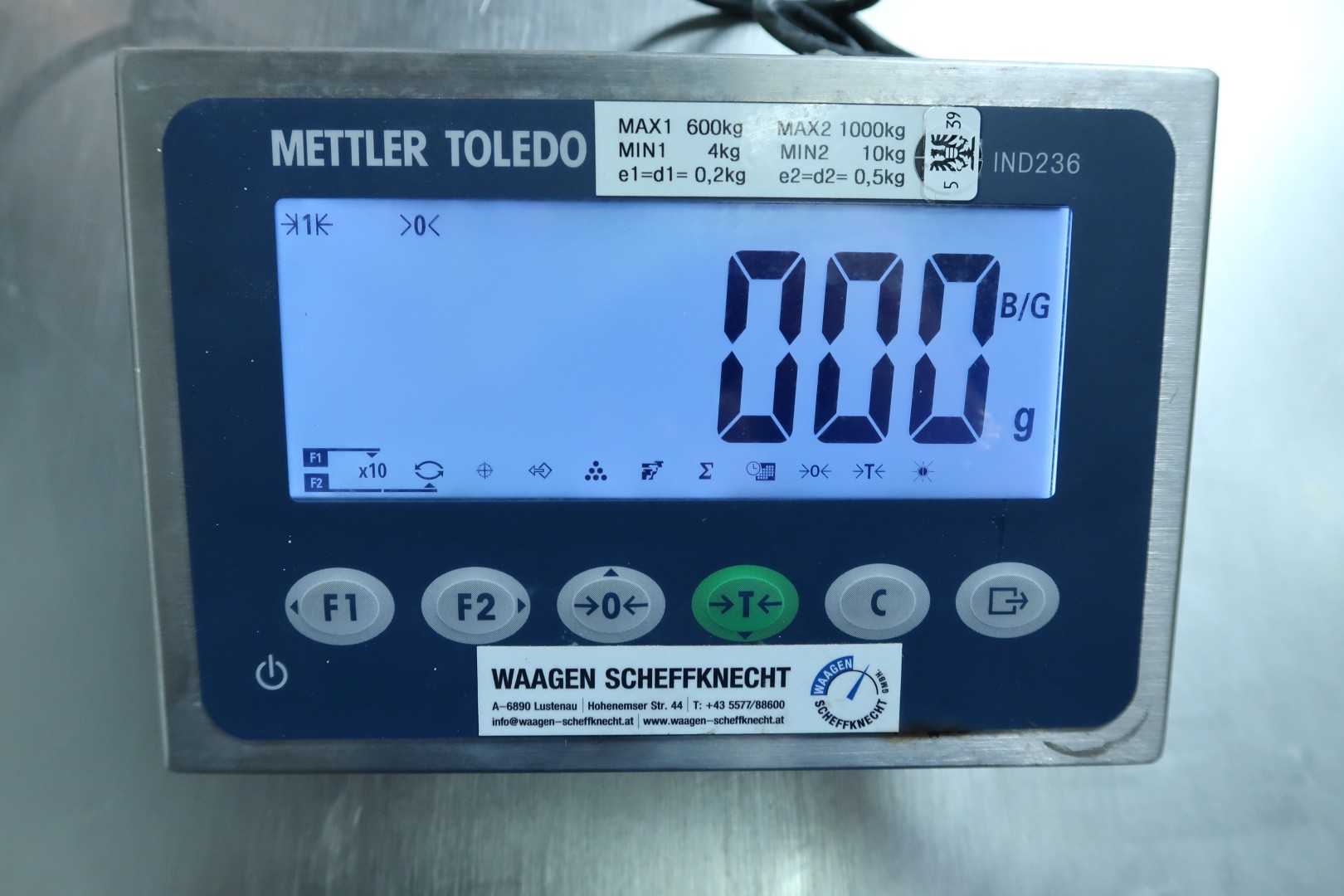 Floor weighing scale, stainless steel pallet platform to be mounted in the floor with display. Dimensions of weighing platform: 125x125 (lxw) cm. Thickness 10 cm, previously mounted in factory floor. Weight: 120 kg.