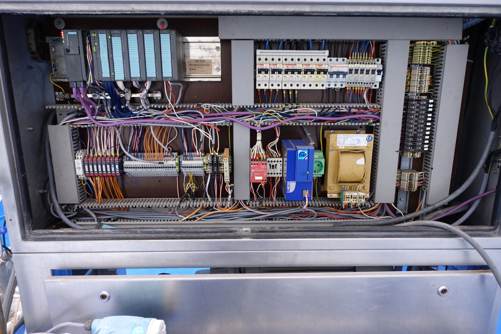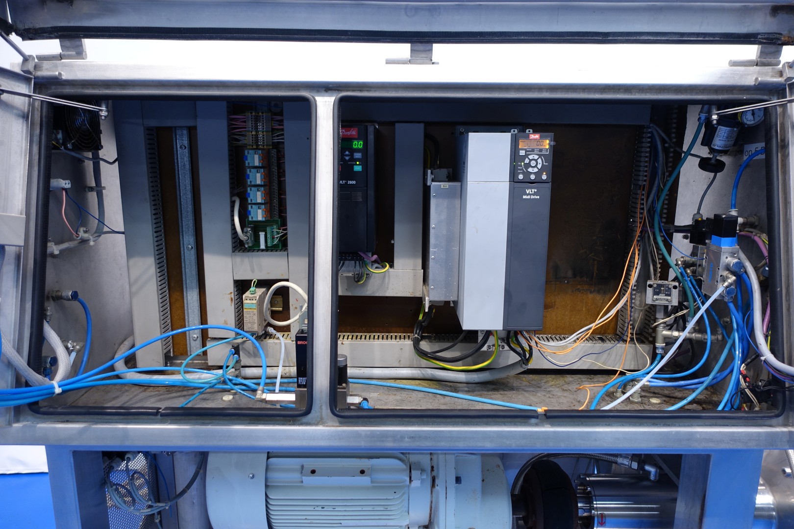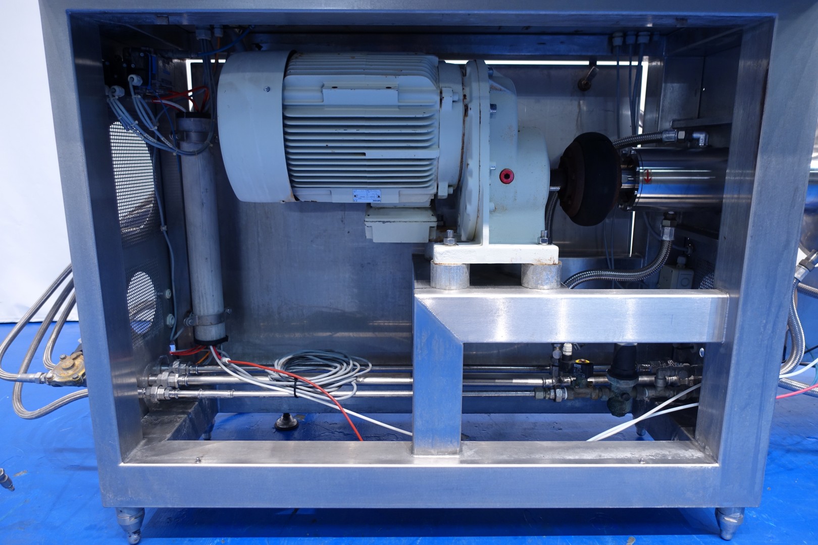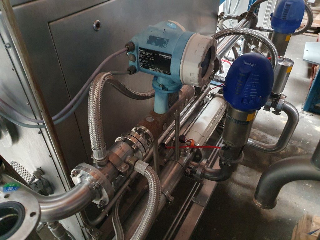 Continuous aerating machine, Double jacketed head. Pressure: max 10 bar. Main motor 18,5 kW, variable speed with frequency converter make: Danfoss. Including: E&H Mass (kg/h) Flowtransmitter, temperture sensor on inlet and outlet, stopvalves, counter pressure valve, aseptic design with steam filter, water condensate unit for aseptic seal water, drain valve on the head. 1.120 Pins in the stator and 1.080 pins on the rotor (40 pieces missing). eccentric screw feed pump make: Monopump, model: 52L42AS115/G6BP Dresser with pneumatic bypass valves, double jacketed piping. Control panel with PLC Siemens Simatic S7-300 and Siemens touch screen control panel, controls . Controls of the spead head and feed pump, Gas control valve and gas flow indicator. Total dimensions: 310x130x180 (lxwxh) cm - weight: 954 kg.
