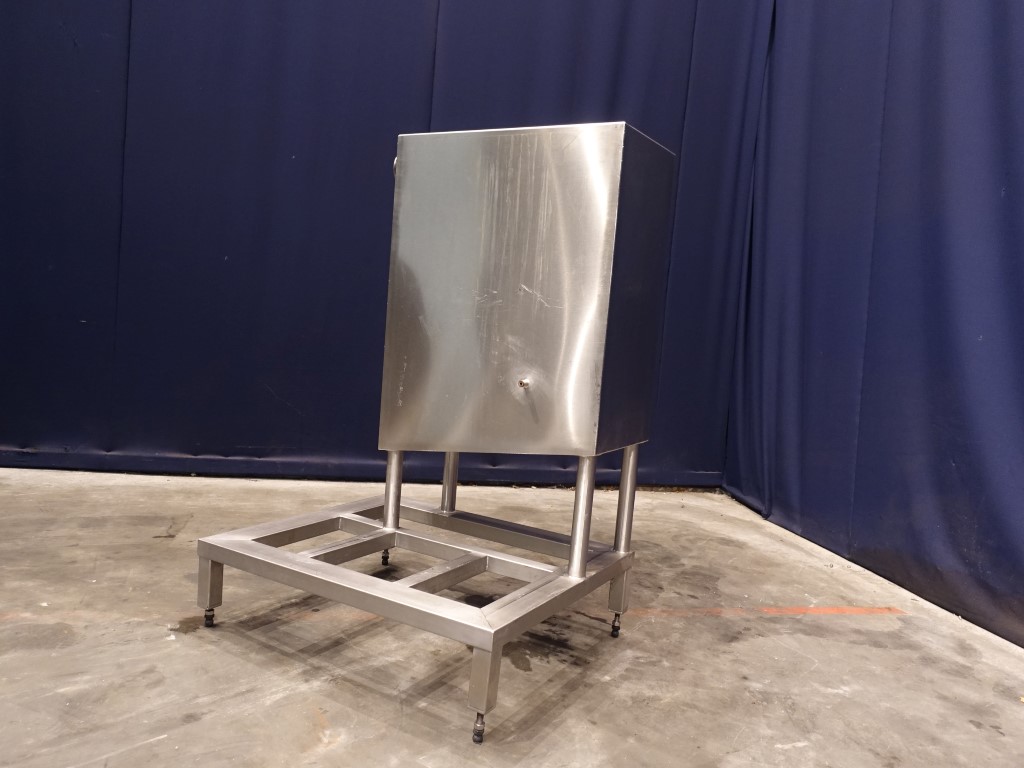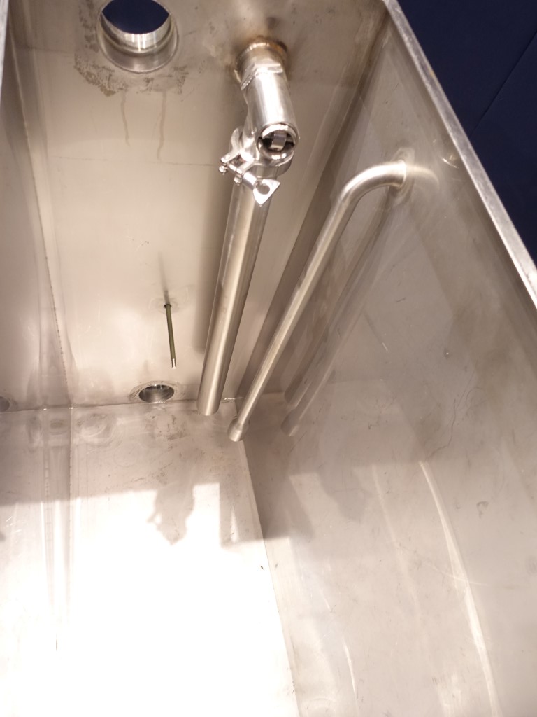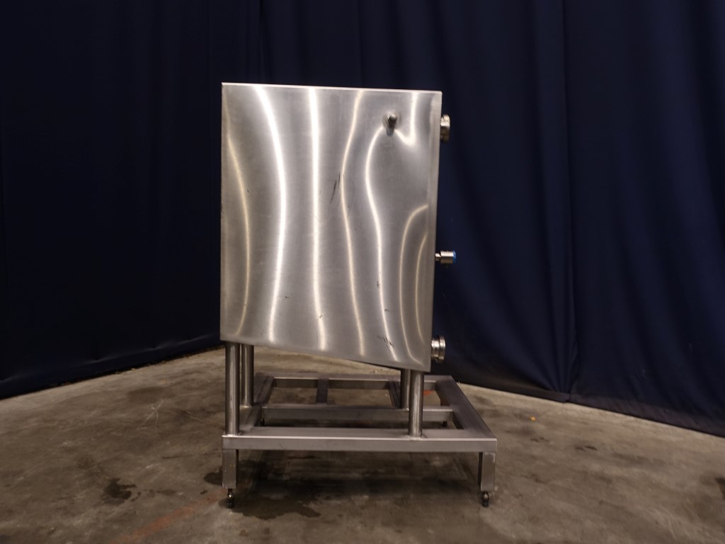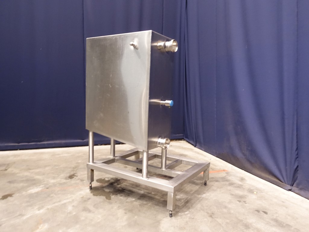 Level tank with total open top. Flat to the side. Product outlet DN80. Connector for temperature sensor. 4 adjustable feet. Inside dimensions 38 x 75 x 70 cm. Total dimensions 110 x 90 x 150 cm.