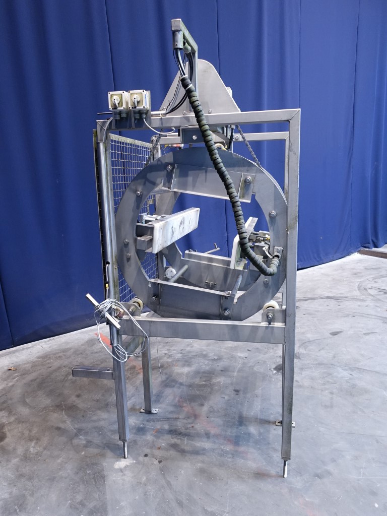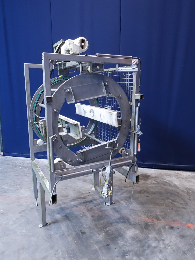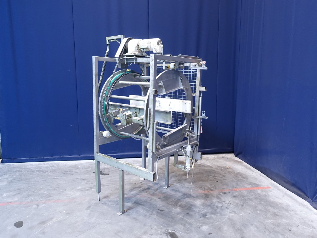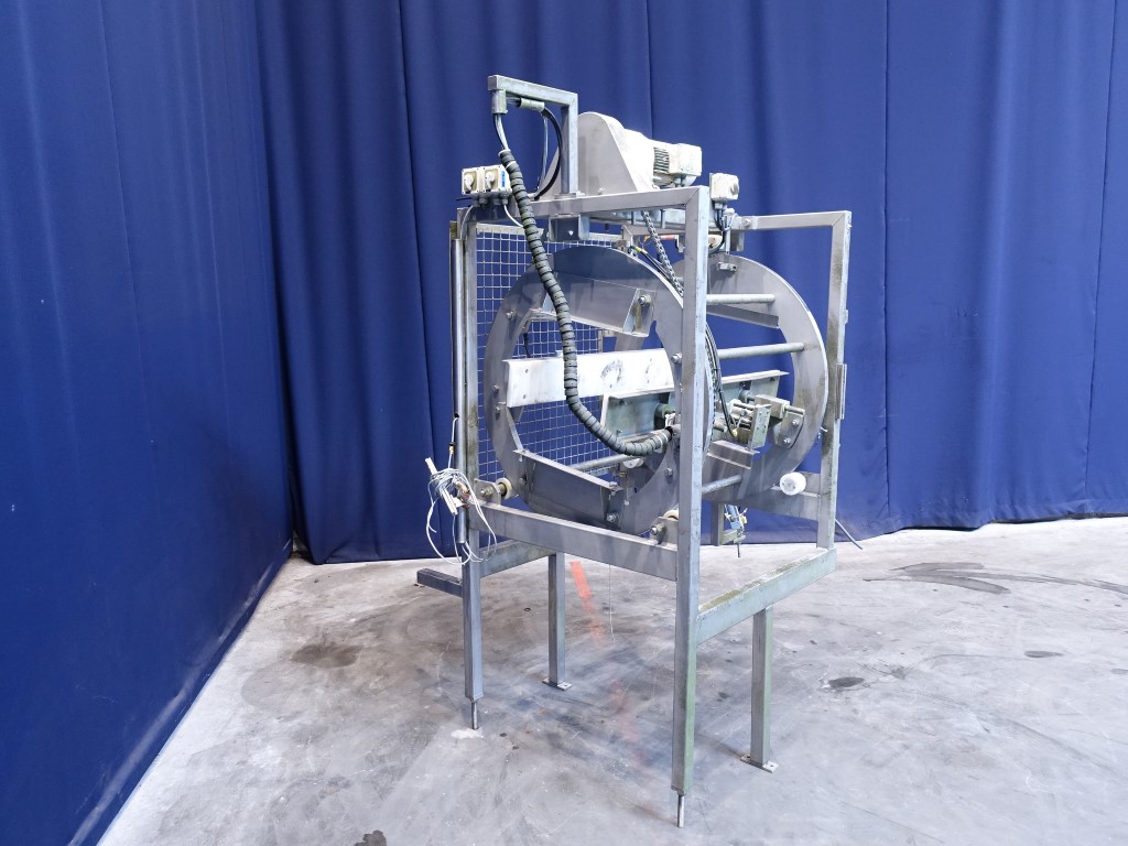 Incomplete cheese turning device. Without conveyors. Rotating: 180°. Motor: 0,75 kW - 2,2 A - 220 rpm. Total dimensions: 140 x 170 x 230 cm.