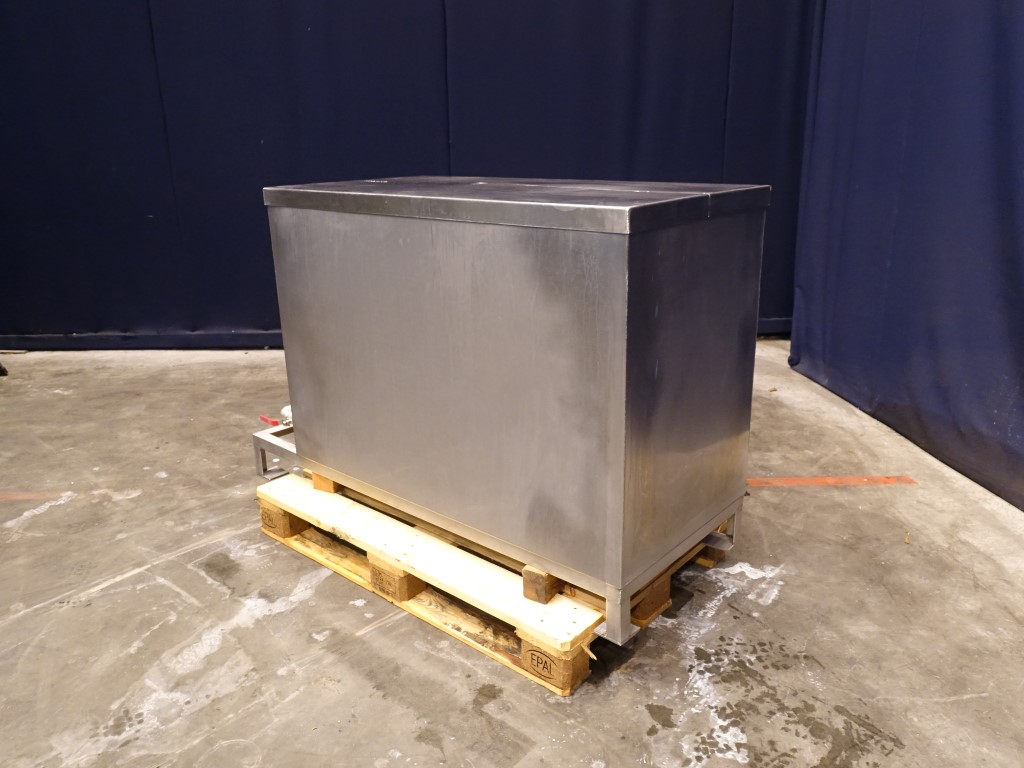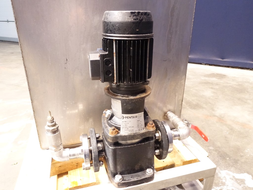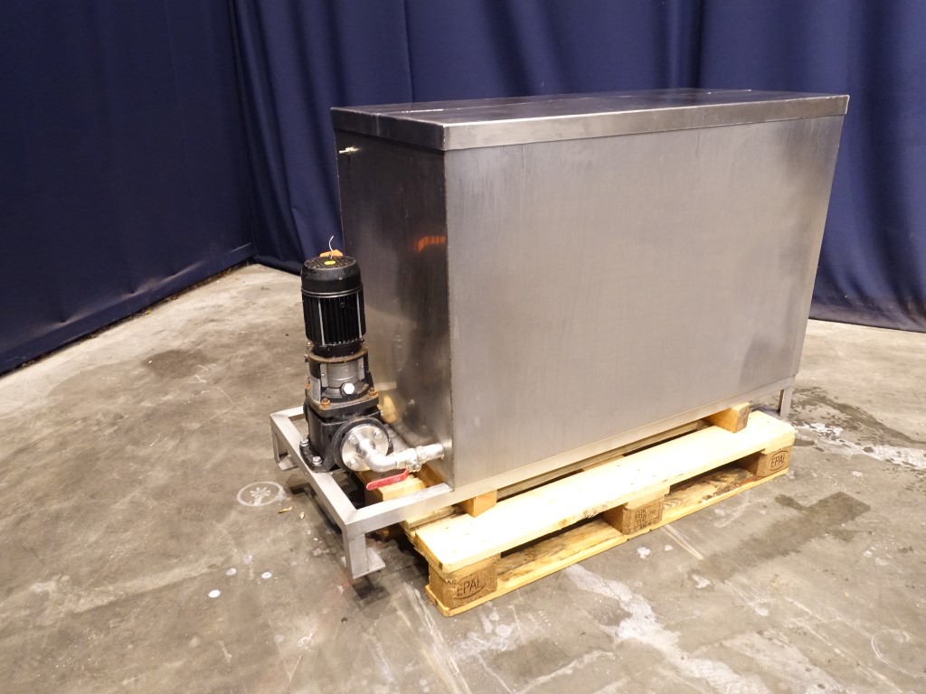 Leveltank. Open top with cover. Outlet flat to the side. Including Pentair centrifugal pump, type: PVM 1-2F, capacity: 0,7-2,4 m3/h, max. 25 bar, motor: 0,37 kW - 1,4 A - 2850 rpm. Frame mounted. Inside dimensions of tank 59 x 119 x 80 cm. Total dimensions: 150 x 65 x 100 cm.