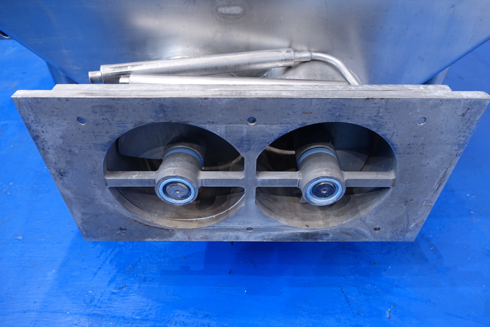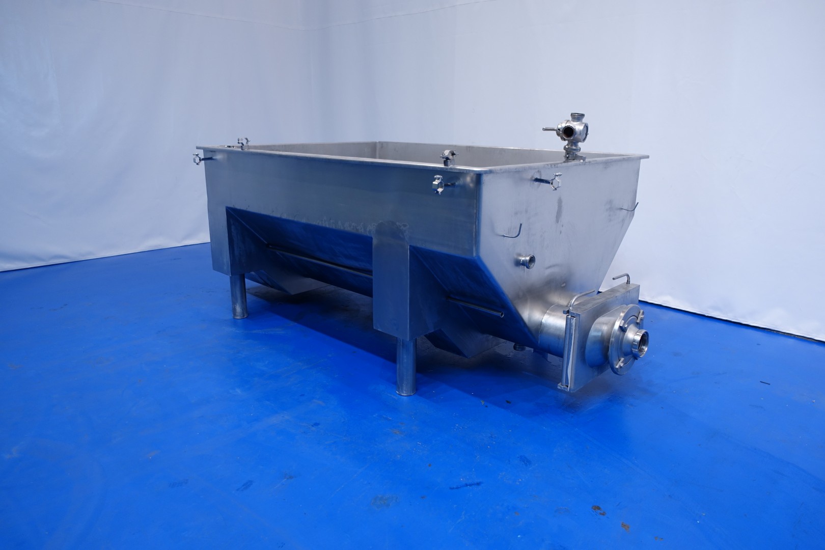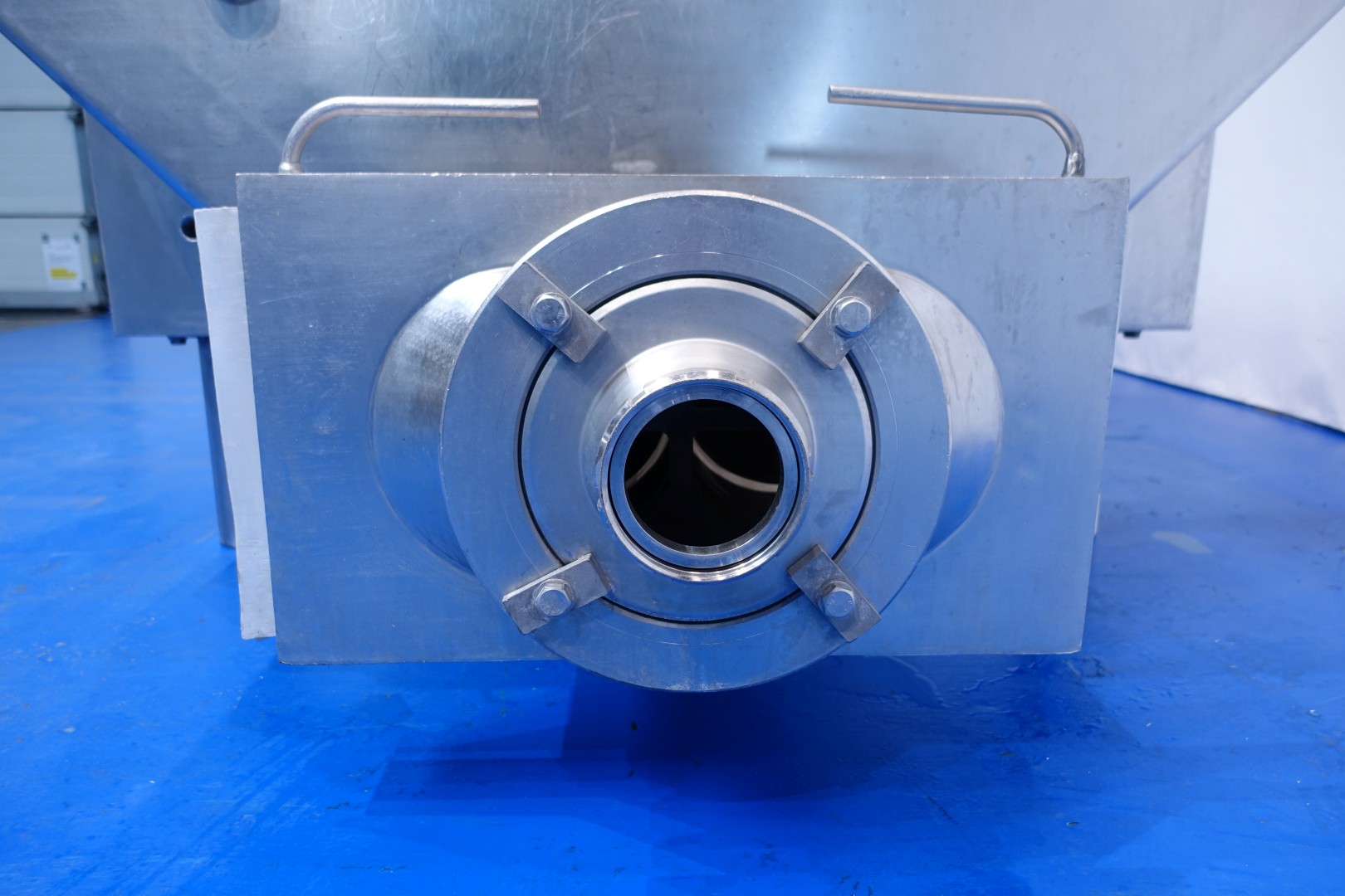 Open butter buffer tank (butter silo). 2 Augers with 1 motor with reductor. Motor 2,2 kW - 5,4 A - 950 rpm - 50 Hz. Reduction 1/30. Connections, butter outfeed 1 x 4" SMS for butterpump. Length of the augers +/- 246 cm. Total outside dimensions: 325x170x144 (lxwxh) cm. Weight: 886 kg. With simon Freres oscillating outfeed butterpump (STN15692) model S150, 3kW- 940rpm/n2: 67rpm, Gummi lobe, connections 4", SMS (last picture), weight pump 274kg