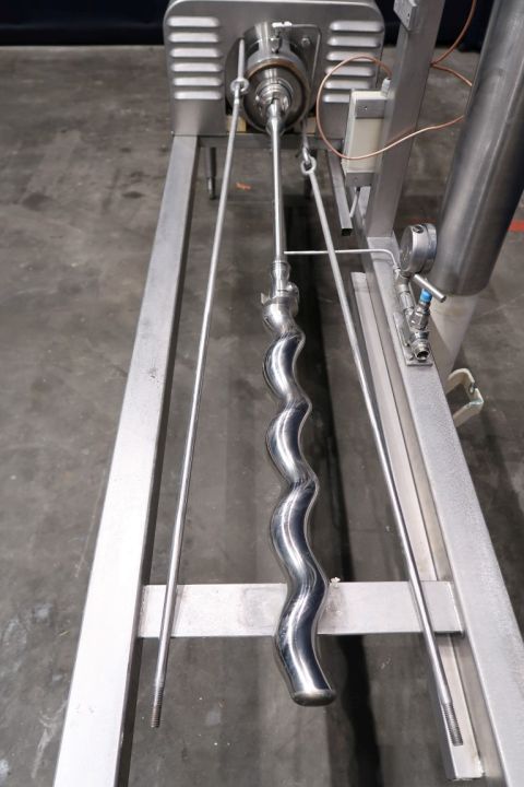 Screw / mono pump. Stator diameter: 100 mm. Rotor diameter 35 mm. Rotor length 450 mm. 4 Windings. Current motor: 1,5 kW - n1 1420 rpm - n2 = pump speed 50 rpm. Stainless steel cover over electric motor. Frame mounted, housing for by-pass valve (actuator missing), flow transmitter between flanges (unknown brand). Connections: 2'' DIN/2,5'' SMS.
