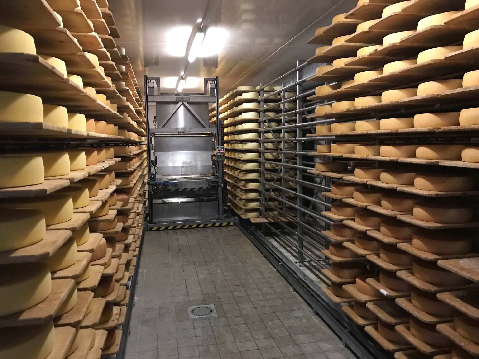 Cheese storage rack system. Previously used for cheese shelves of 105x31,5 cm. 14 layers inbetween rack uprights or per bay. 32 rack uprights available with beams/racks and mounting material. Was placed in 4 rows with 7 bays. Currently dismantled, can easily be assembled and/or adjusted to desired conditions (between certain parameters). Originally placed in storage room with automatic cheese storage system (STN15798). Other cheese storage rack system under STN15799 also available.