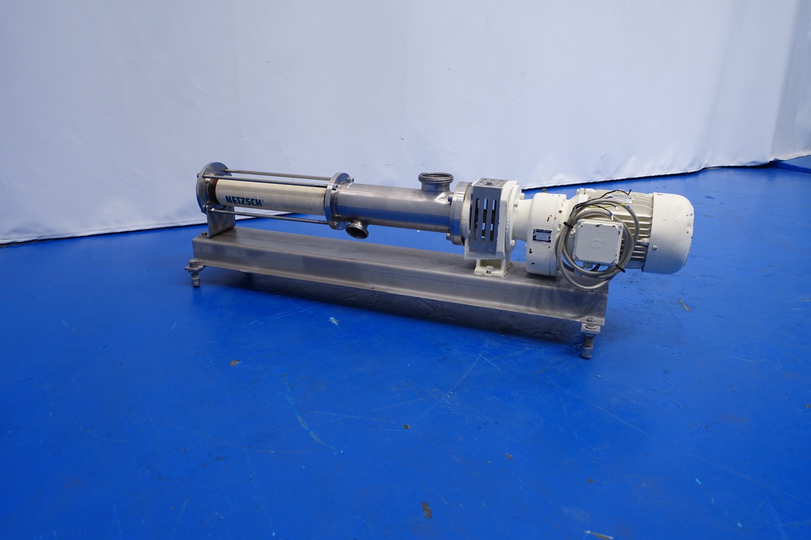 Mono pump - progressing cavity pump. Stator diameter 40 mm. Stator length 55 cm. 4 Windings on SS rotor. Pressure 5 bar. Current motor: 4,5 kW - 8,3 A - n1 1.445 rpm - i = 3,96 - n2 359 rpm (pump speed). On SS frame mounted. Connections: (In) 3" Din / (Out) 4" Din - bypass 2" Din. Total dimensions: 160x35x45 (lxwxh) - weight: 120 kg.