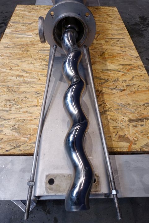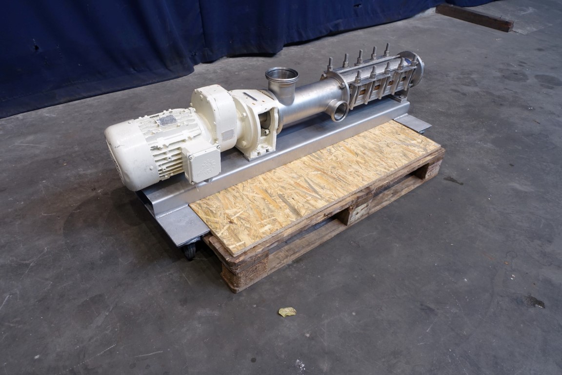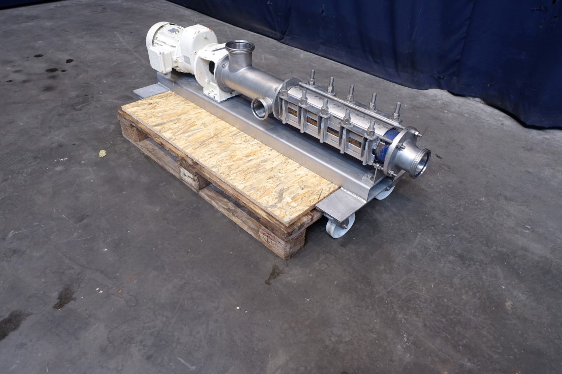 Eccentric screw pump. Stator diameter 55mm. Stator length 550 mm. 4 Windings. Max pressure 10 bar. Current motor: 4 kW - 8,6 A - n1 1,450 rpm - i = 10,34 n2 = 133rpm pump speed.