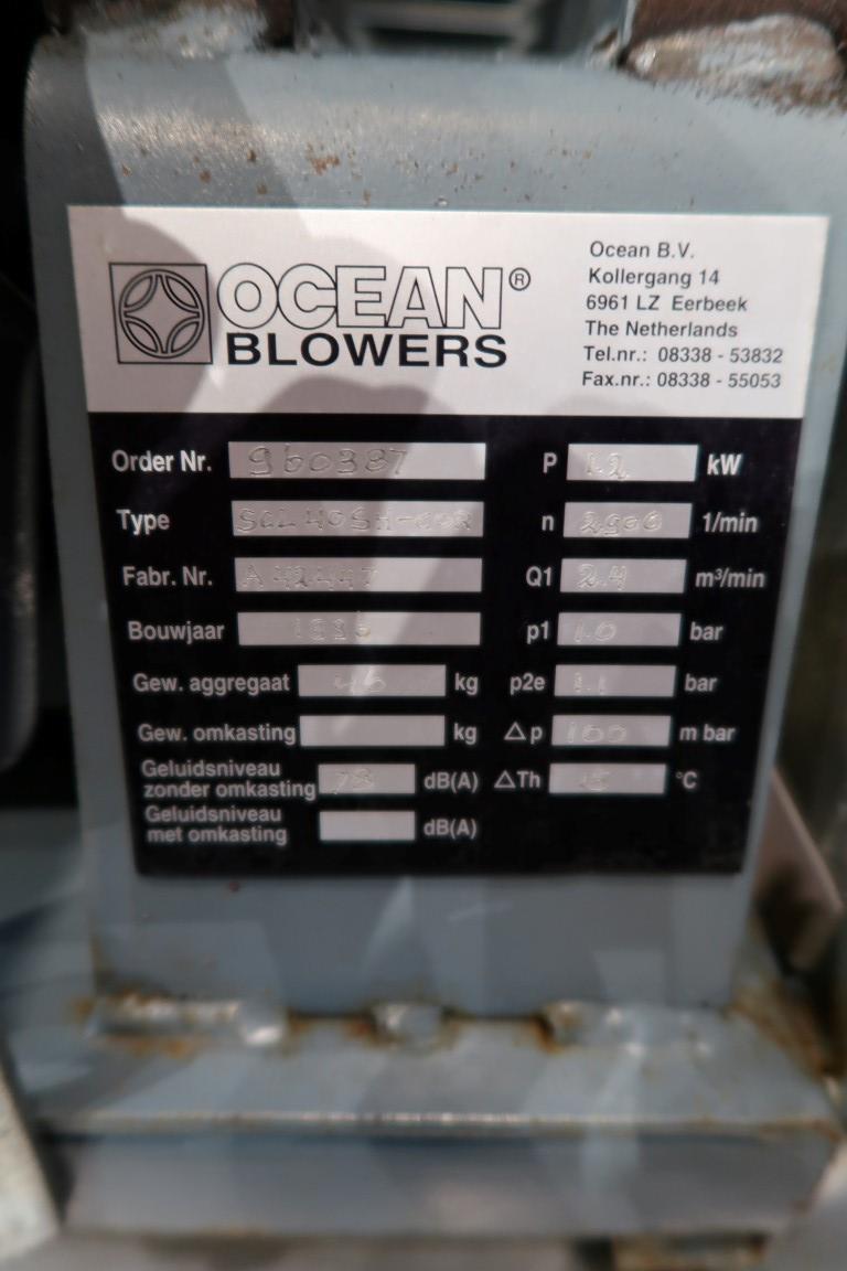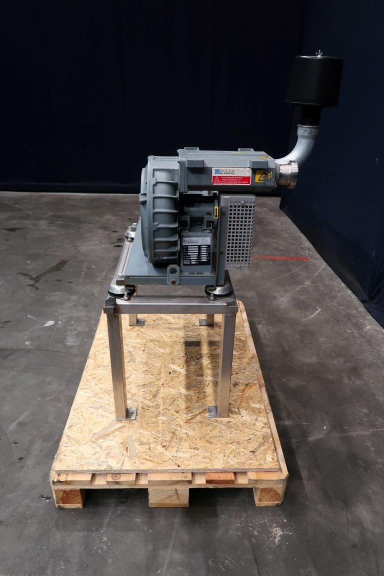 Blower. Motor: 1,2 kW - 2900 rpm. Capacity: 2,4 m3/min. Pressure p1: 1,0 bar - p2e: 1,1 bar - Delta p: 100 mbar. Weight 46 kg. Sound level: 78 dB(A).,