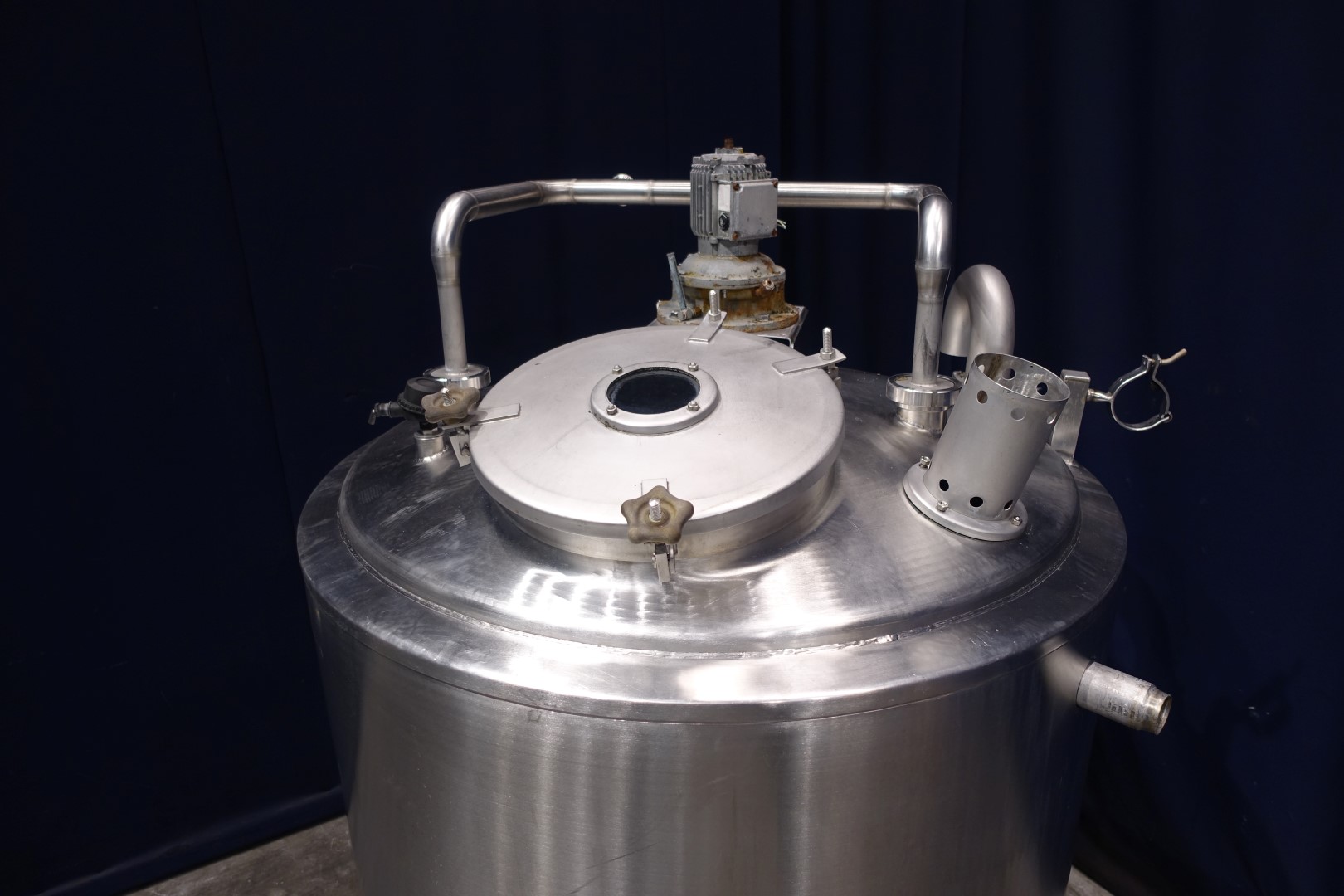 Double jacketed process tank. Topside driven blade agitator, shaft with two paddle blades. Motor power: 0,37 kW - n1: 1360 rpm - i - agitator speed n2: 72 rpm. Product outlet with manual butterfly valve 2" DIN and outlet height: 20 cm. 1 x Temperature sensor. Breather 180° bent pipe. 2 CIP spray bowls, one high and one low, Cip connection 2 x 3" DIN bypas to 1 x 2" tryclamp. Input pipe on top 1 x 2,5" Din. Manhole in top, round, diameter 44,5 cm. Sightglass in manhole lid. Lamp on top of tank. 3 Adjustable feet. Inside dimensions of tank: Ø 110 cm and height 160 cm. Total outer dimensions: 130 x 130 x 230 cm.