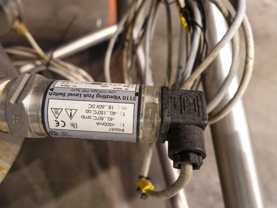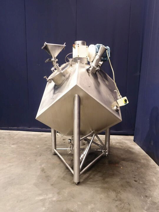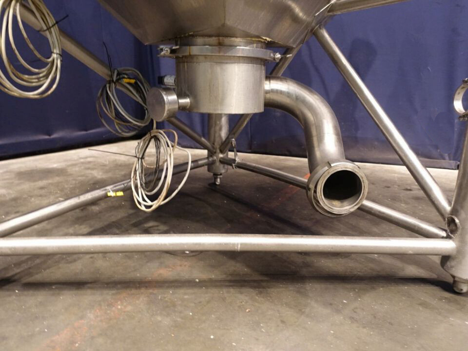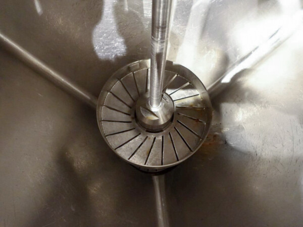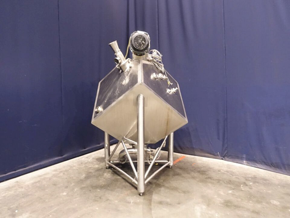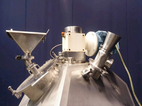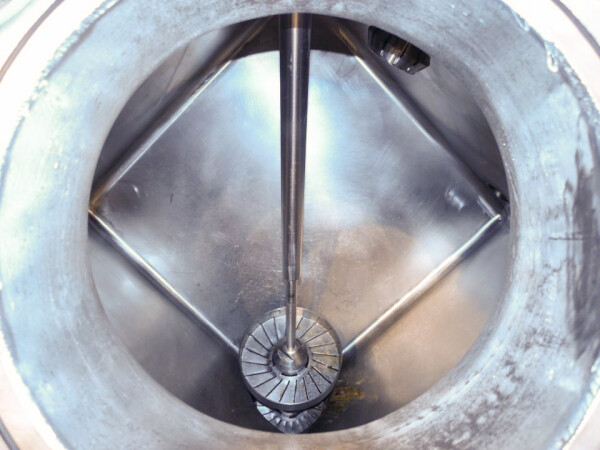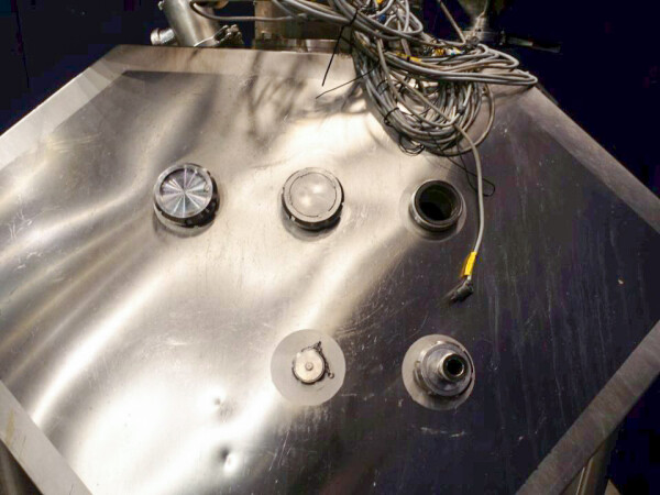 Poederoplosser op weegcellen. Van boven aangedreven mengroerwerk voor het oplossen van poeder. CIP reinigbaar met 5 sproeibollen. Het poeder wordt gedoseerd via de inlaat bovenop en onder het 'paraplu'-vormige roerwerk wordt de vloeistof geïnjecteerd. Hierdoor is er een minimum aan stof in de mixer. Werktemperatuur: 0 / 95 °C. Werkdruk: -1 / +1 bar. Uitlaataansluiting: 4'', DIN, uitlaathoogte: 25 cm. Meerdere ingrediënteninlaten bovenop. Mangatdiameter 45 cm. 3 verstelbare poten met 1 weegcel