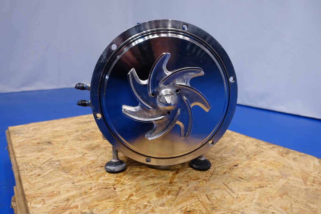 Sanitary centrifugal pump. Version: KAM-CC-2-0550-S1-AF. Power: 5,5 kW - 10,1 A -2.930 rpm - 50 Hz. Impellor diameter: 175 mm. Flushed seal. Capacity at 2,5bar 12,000ltr/h at 3,8bar 8,000ltr/h. Connections In 2,5" Din - Out 2,5" Din. Total dimensions: (lxwxh) 73x31x44 cm - weight: 152 kg.