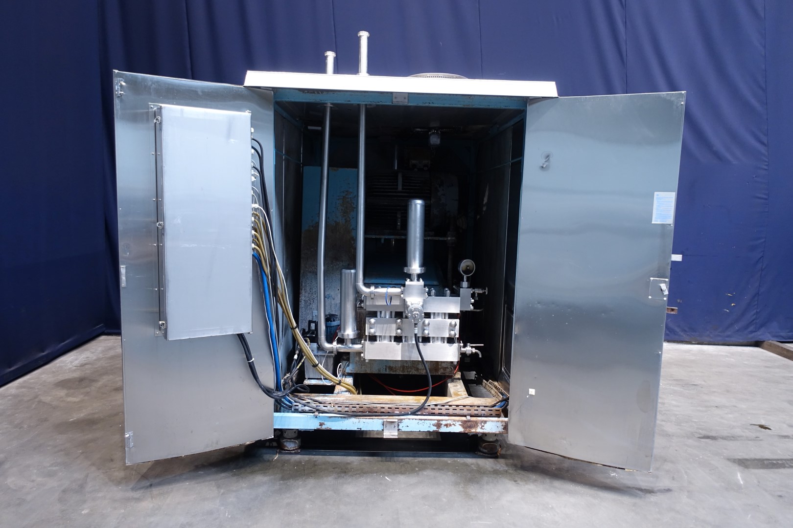 High pressure homogeniser. 1 Stage with hydraulic pressure control (automatic regulation). 3 Pistons, piston diameter: 63 mm and stroke: 80 mm. Stainless steel cladded in sound-insulated cabinet <80dB (A) (Rannie Blue Top Milieu). Connections: 2 x 2" Din. Current motor power: 90 kW - 166 A - 1.480 rpm - 50 Hz - 3x380 V. Maximum working pressure in current configuration with this 215 bar. Amount of cooling water, 200 l/h - lubricating oil 80 ltr - hydraulic oil 4 ltr. Fan for cooling of main motor is fitted on top of the cabinet. Integrated control panel no mcc or cpu. 1 x Pressure Manometer and 1 x drain tap. Circulation pump, flowswitch and external PHE on cooling water. Pulsation demper on inlet and outlet. Total dimensions: 230x162x248 (lxwxh) cm - weight: 3.650 kg. With operation manual and parts list.