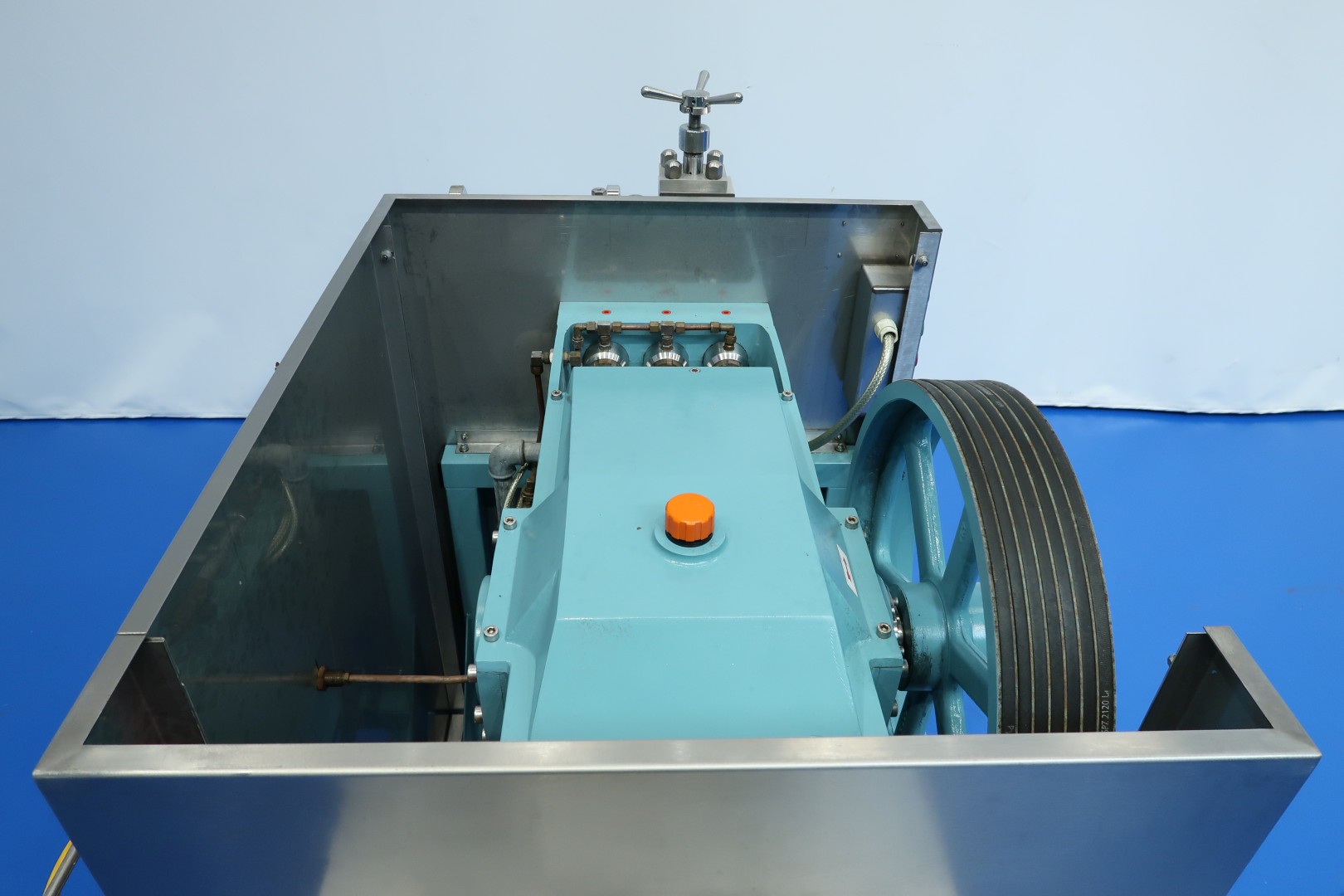 Mobile laboratorium homogenizer. With manual pressure control 1st and 2nd stage and pressure gauges. Piston diameter 12 mm - stroke 51 mm. Motor: 7,5 kW - 15,3 A. Maximum pressure : 1.000 bar. Overpressure valve. Control panel on rearside of machine with frequency converter for variable speed. Total dimensions: 160x100x134 (lxwxh) cm - weight: 520 kg.