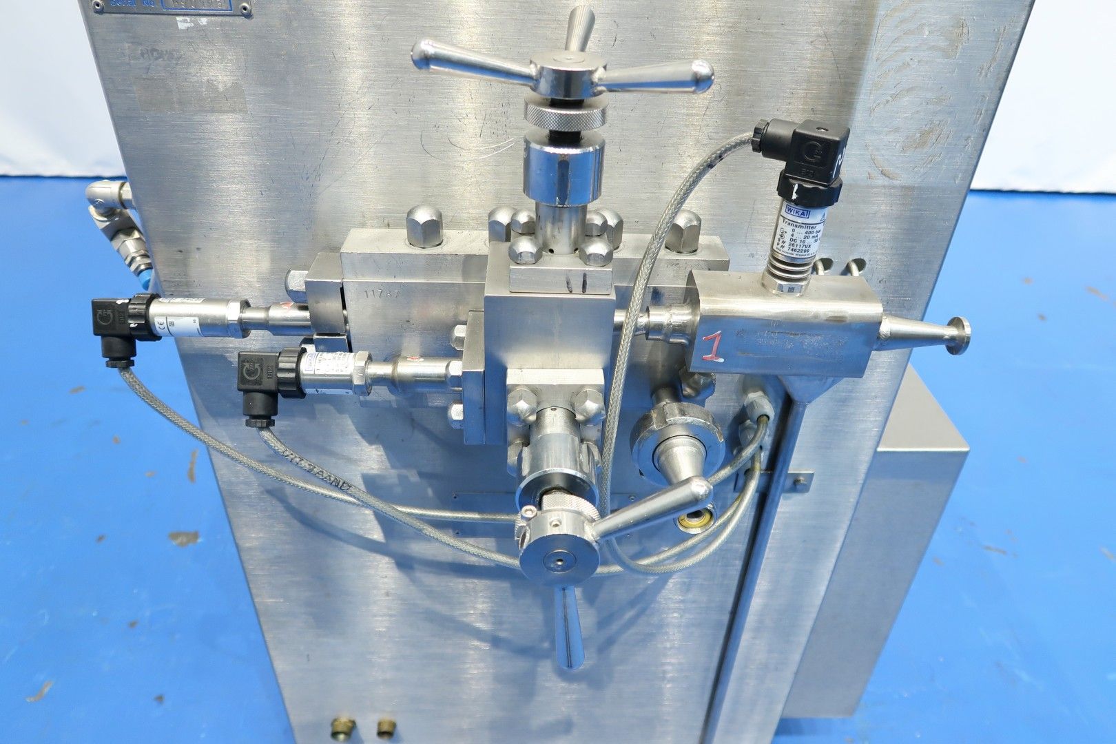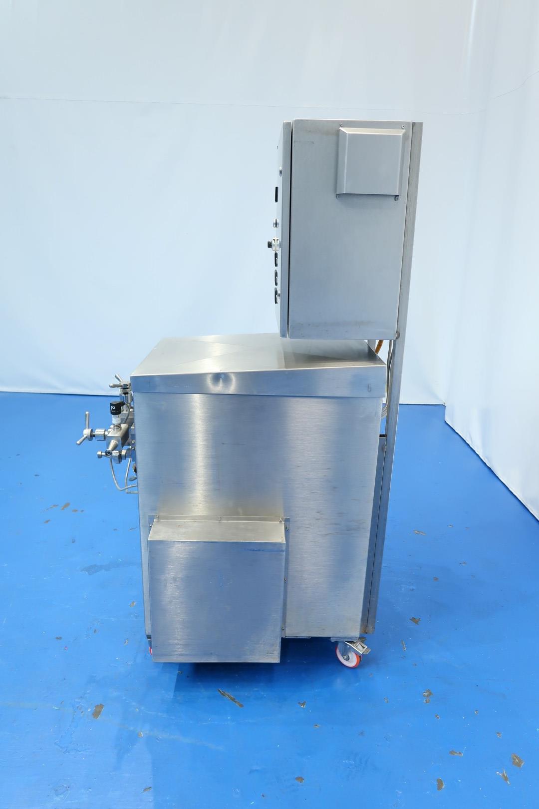 Pilot Homogenizer, laboratorium, 2 stage. Manual pressure control 1st and 2nd stage. Piston diameter 16 mm - stroke: 50 mm. With 2 pressure sensors, pressure indication via display. Motor: 4 kW - 8,2 A - 1.440 rpm. Operational contol panel with frequency convertor directly on frame. Speed manual adjustable via control panel and rpm indication via display 10-200ltr/h. pressure up to 375 bar. Documentation available. Total dimensions: 110x70x180 (lxwxh) cm - weight: 307 kg.