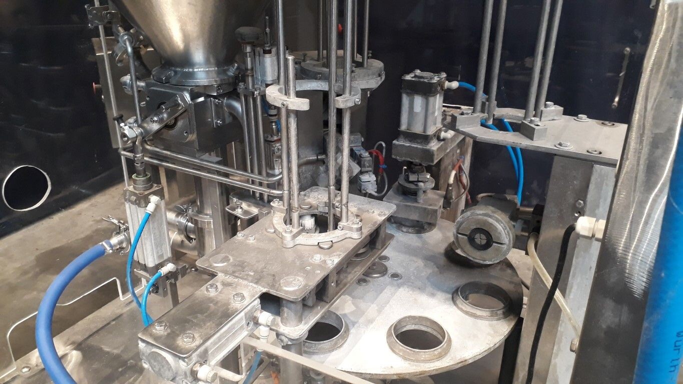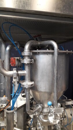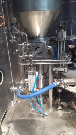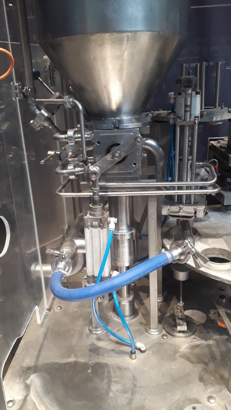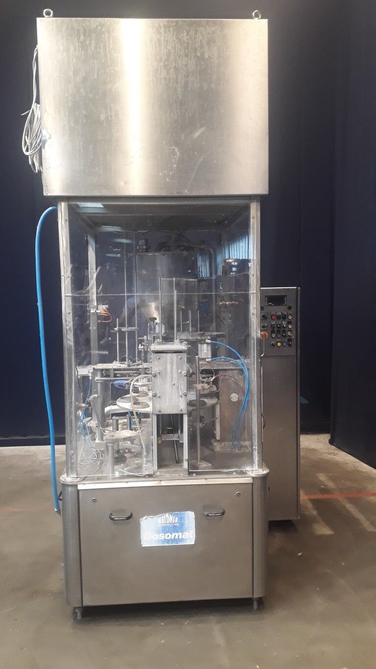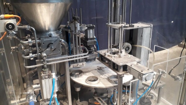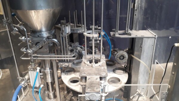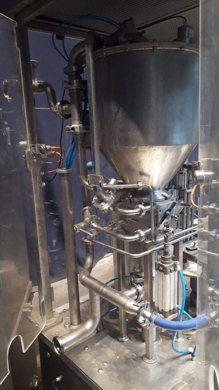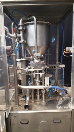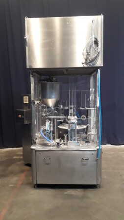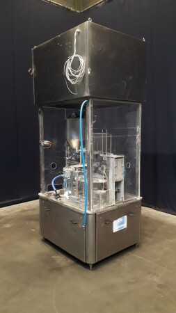 1-kops rondloper, beker vulmachine. Beker maat (rond): 95 mm. Stations: ontstapelen van bekers, detectie indien geen beker, hoofddoseur (150 - 500 ml) voor vloeibare viscose producten. 3 verschillende vulmonden beschikbaar voor verschillende viscositeiten. Inclusief trechter (CIP reinigbaar). Seal opleggen door vacuüm, hitte sealing en druk deksel. Met uitvoerband. Machine heeft plexiglas veiligheidsdeuren (1 deur ontbreekt). Machine is in een “clean” uitvoering met een Hepa steriel luchtsysteem met ventilator bovenop de machine. Besturing: Siemens, model: S5 en HMI. Documentatie aanwezig. Video van een testproductie met water op onze website. |