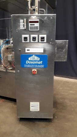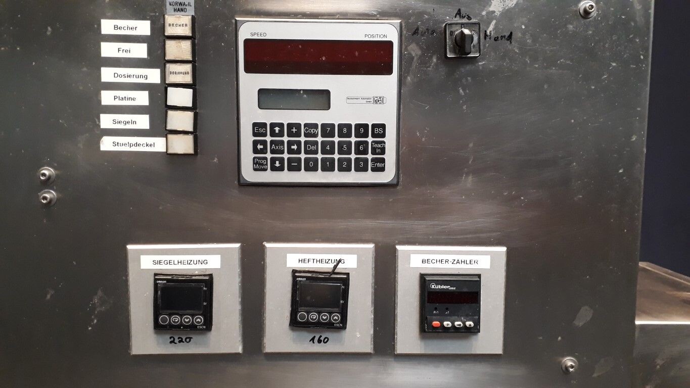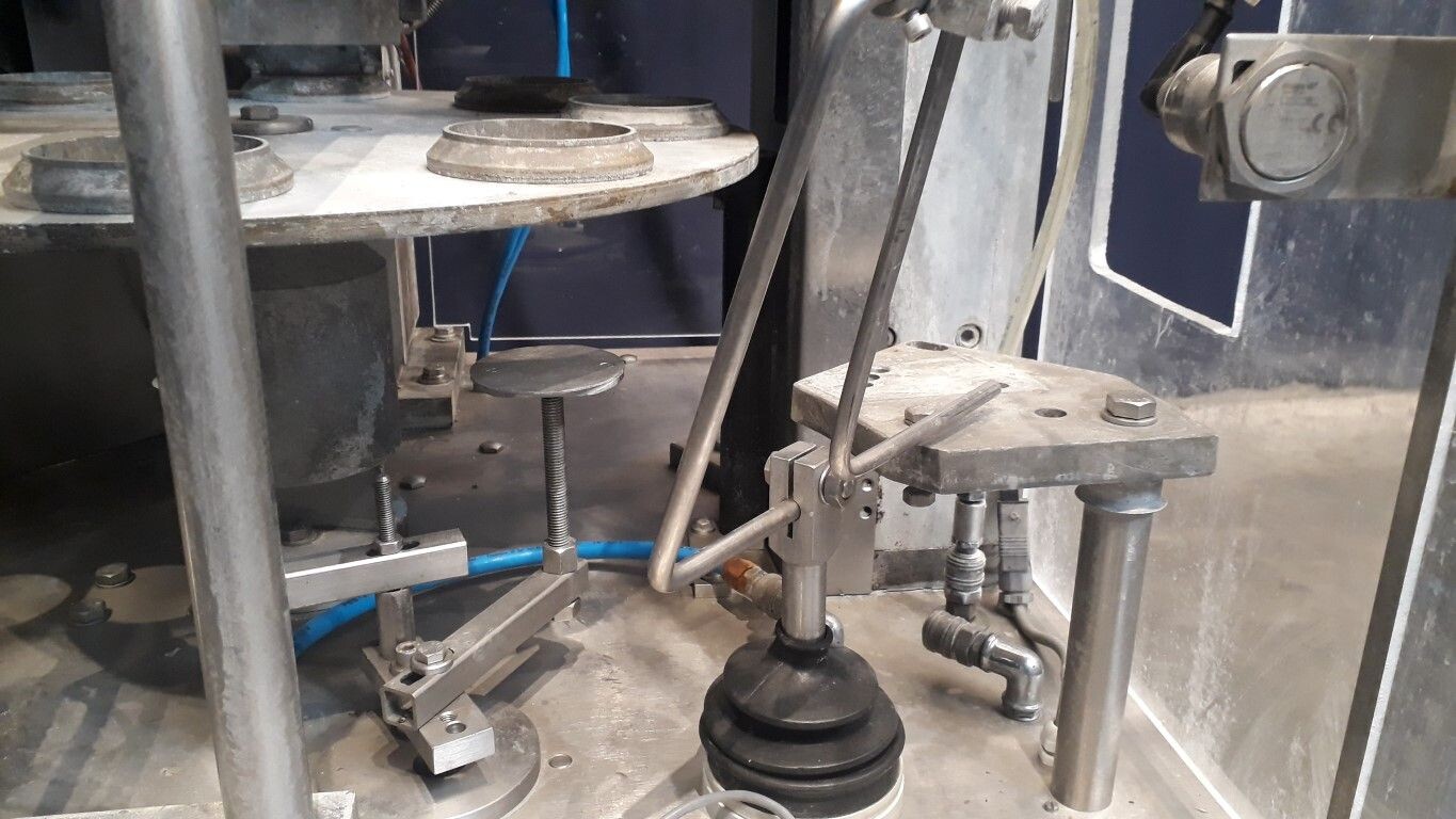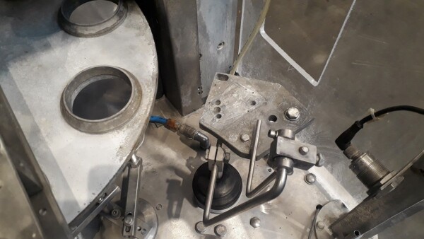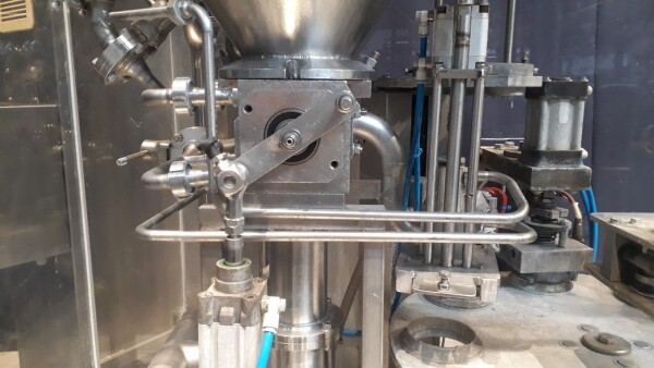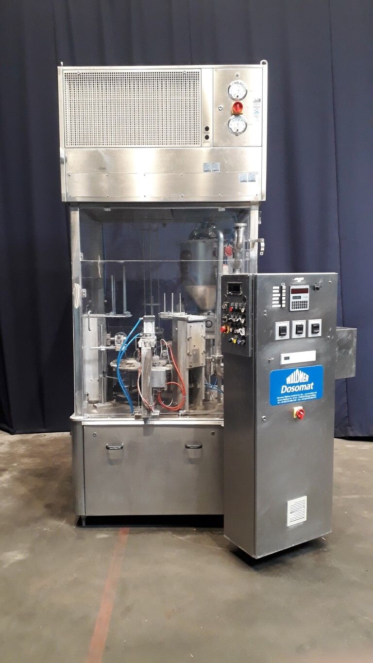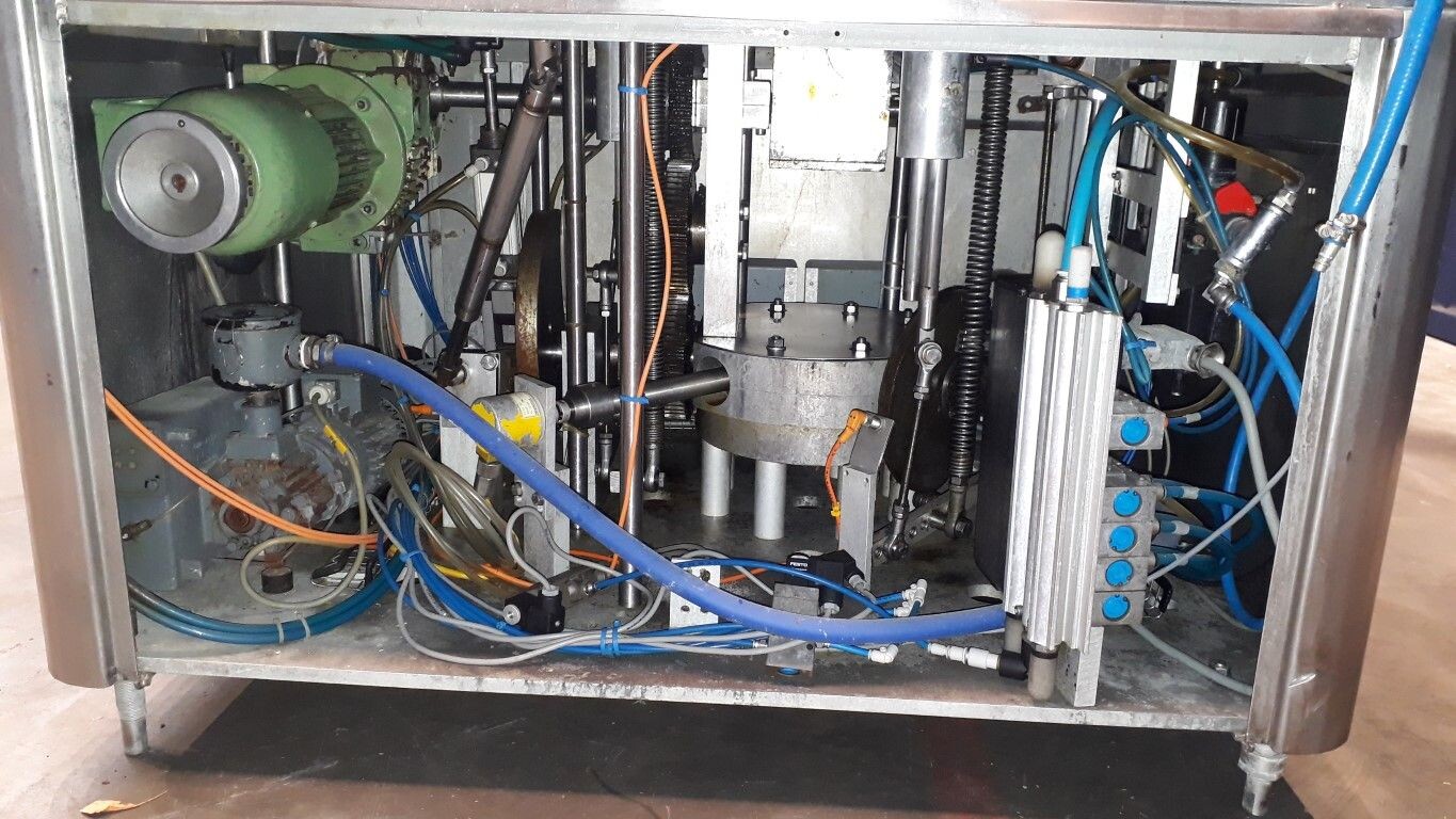 1-kops rondloper, beker vulmachine. Beker maat (rond): 95 mm. Stations: ontstapelen van bekers, detectie indien geen beker, hoofddoseur (150 - 500 ml) voor vloeibare viscose producten. 3 verschillende vulmonden beschikbaar voor verschillende viscositeiten. Inclusief trechter (CIP reinigbaar). Seal opleggen door vacuüm, hitte sealing en druk deksel. Met uitvoerband. Machine heeft plexiglas veiligheidsdeuren (1 deur ontbreekt). Machine is in een “clean” uitvoering met een Hepa steriel luchtsysteem met ventilator bovenop de machine. Besturing: Siemens, model: S5 en HMI. Documentatie aanwezig. Video van een testproductie met water op onze website. |