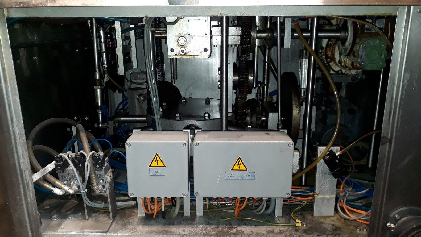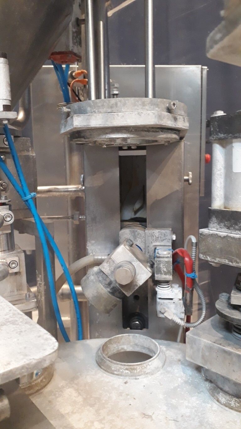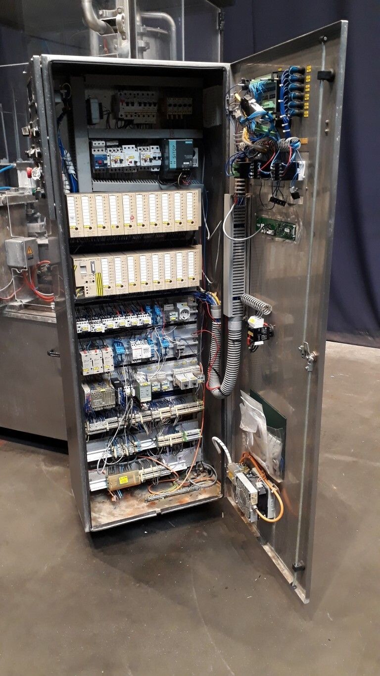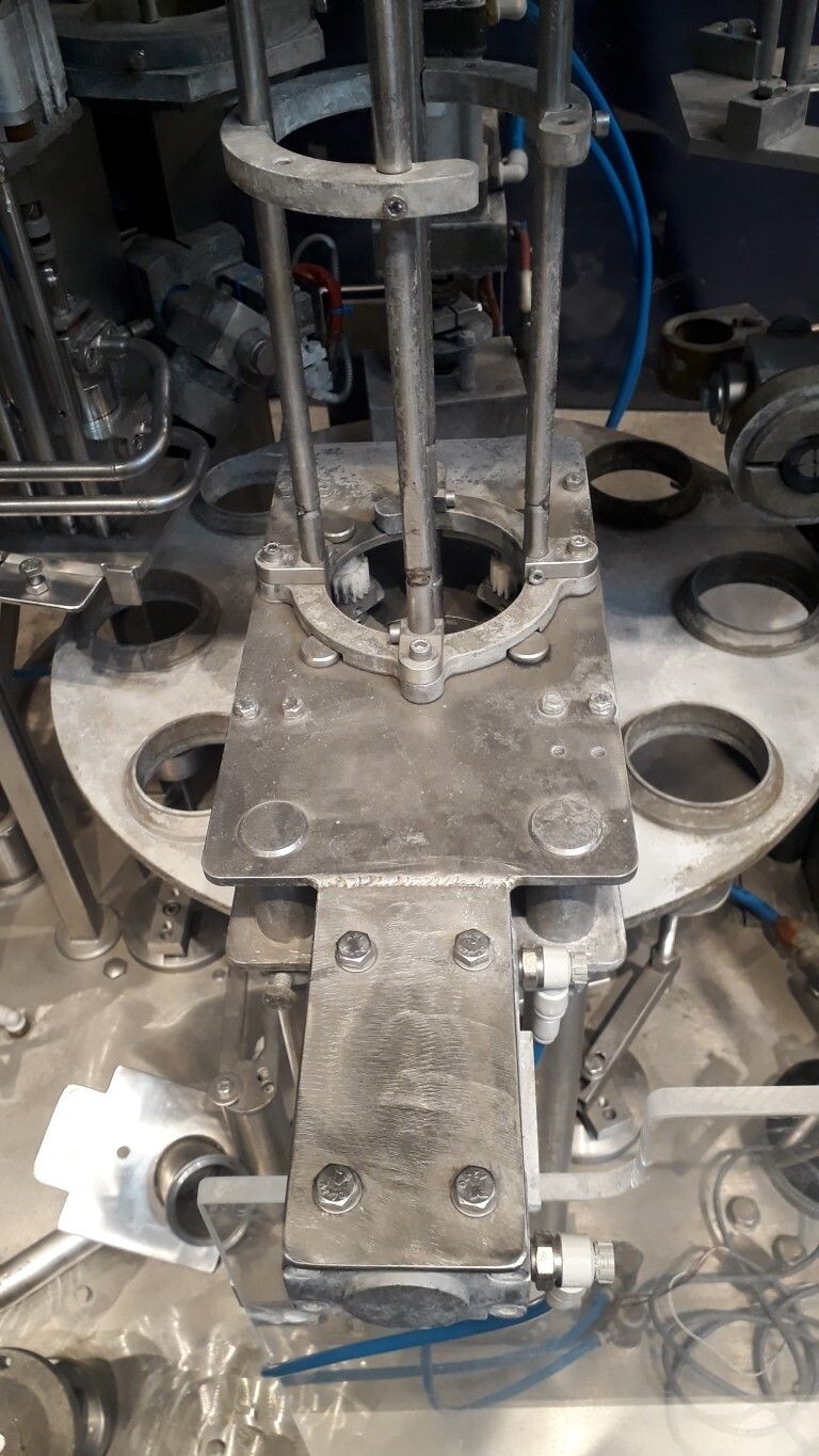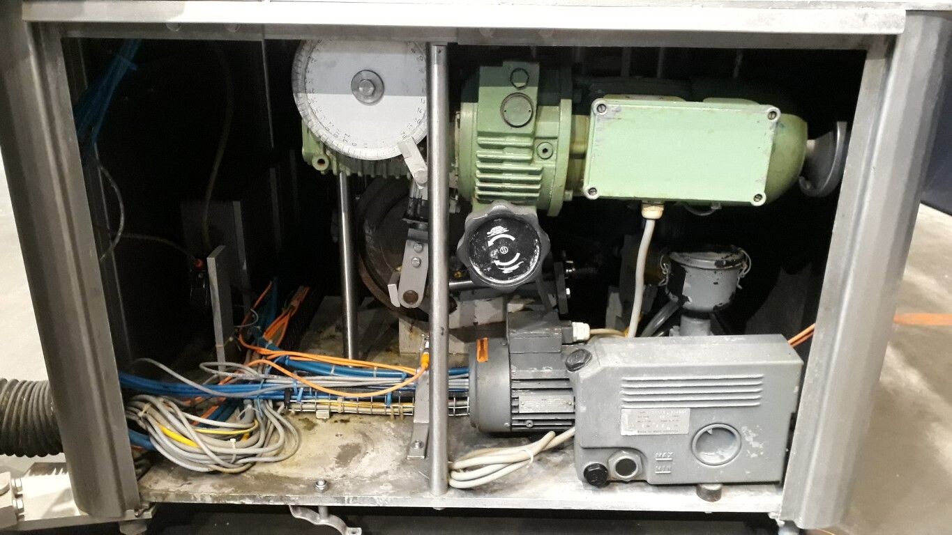 1-kops rondloper, beker vulmachine. Beker maat (rond): 95 mm. Stations: ontstapelen van bekers, detectie indien geen beker, hoofddoseur (150 - 500 ml) voor vloeibare viscose producten. 3 verschillende vulmonden beschikbaar voor verschillende viscositeiten. Inclusief trechter (CIP reinigbaar). Seal opleggen door vacuüm, hitte sealing en druk deksel. Met uitvoerband. Machine heeft plexiglas veiligheidsdeuren (1 deur ontbreekt). Machine is in een “clean” uitvoering met een Hepa steriel luchtsysteem met ventilator bovenop de machine. Besturing: Siemens, model: S5 en HMI. Documentatie aanwezig. Video van een testproductie met water op onze website. |