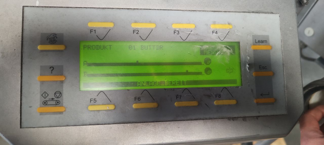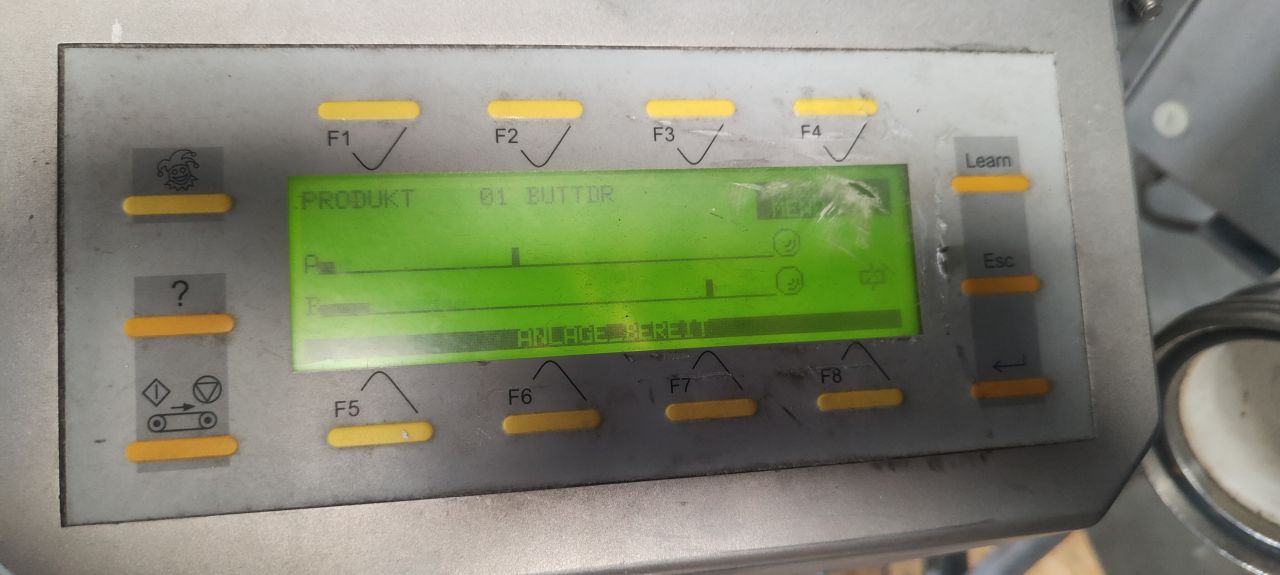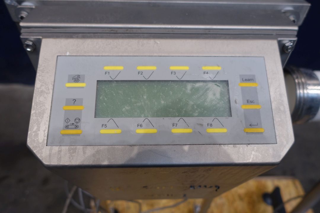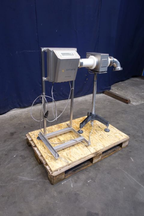 Inline metal detector in working condition. Through put, size of product maximum Ø 73 mm. 2 x Conncetion DN80 Din. Outer dimensions lxwxh 87 x 70 x 110 cm. Mat.-No.: BO-6152312000W-0025. Ord.-No.: 1100197712-10. Capacity depends on product.