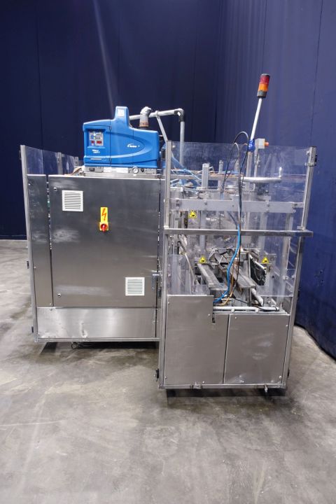 Fully automatic packer, to pack butter packs in an Carton type: American folding box. Operates fully automatically and all principal movements are mechanically driven. Used for 250gr bricks of foil 100 x 75 x 35 mm packed / and wrapped. Maximum box dimensions 330 x 220 x 230 cm. Current dimensions of the box/plano: 300 x 200 mm. Layout of the box 4x2x2 layers = 16 packs of 250 gram per carton = 4kg / carton. Capacity = max. 15 cartons per min. = max. 240 packages per min on input, 2 lanes. Nordson Problue 7 hotmelt glue unit with 3 glue points. Controls Siemens S5 PLC. Has been running together with Benhil 8362 foil packing and wrapping machine (STN15200). Total machine dimensions: 440 x 185 x 220 cm.