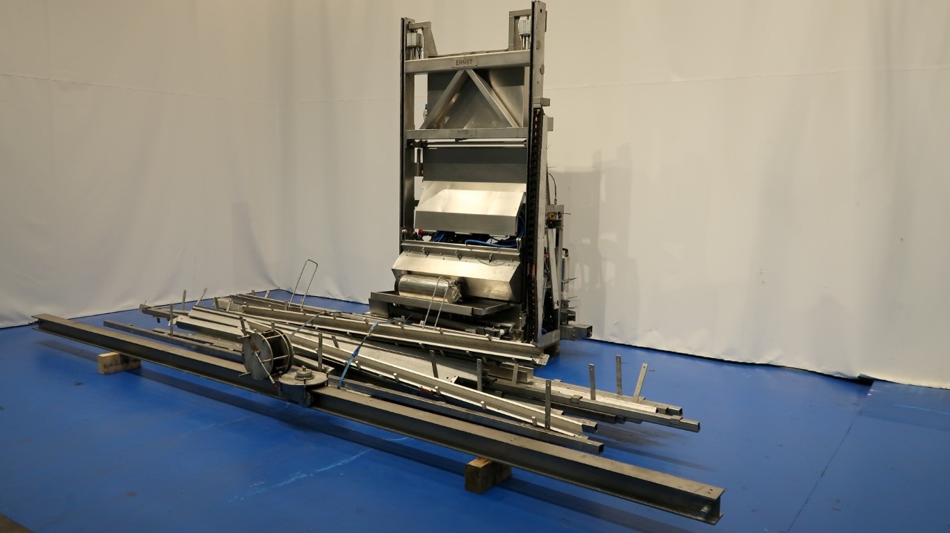 Cheese coating, turning and shelve stacking robot. To automatic handle cheeses in a maturing room. The unit takes shelve from the rack, coats the cheese (turns) and put the shelve back in the rack. Also without coating used to fill the racks with cheese. The robot moves forward through the ile of the maturing room and this safes heave labour. For round cylindric cheeses of 6kg round 30cmx 10cm height (variations possible). Both wooden and plastic boards can be processed. This robot was used for wooden cheese shelves (105 x 30.5 cm) Approximately 2200 cheese shelves are available (under STN15789). The movements are electrically and pneumatically driven, Compact design, user-friendly, consistent spreading quality, brush duration and the amount of spreading fluid can be adjusted. There is an option to choose between circulation or single spreading. Turning the cheeses has a positive effect on the aging process. During the spreading process, the board can be replaced. The operation is made possible through a simple control panel. A cheese change option is available. In- and out-feed programs are selectable. Modern PLC control for process monitoring and fault reporting. The capacity is approximately 100 boards per hour and with Siemens Simatic S7 controls. The robot worked together with a stainless steel racking system and cheese shelves (4x) 1280 x 50 x 255 cm (available under STN 15799 and STN15836). And also the complete climate control is available. (STN15810)"