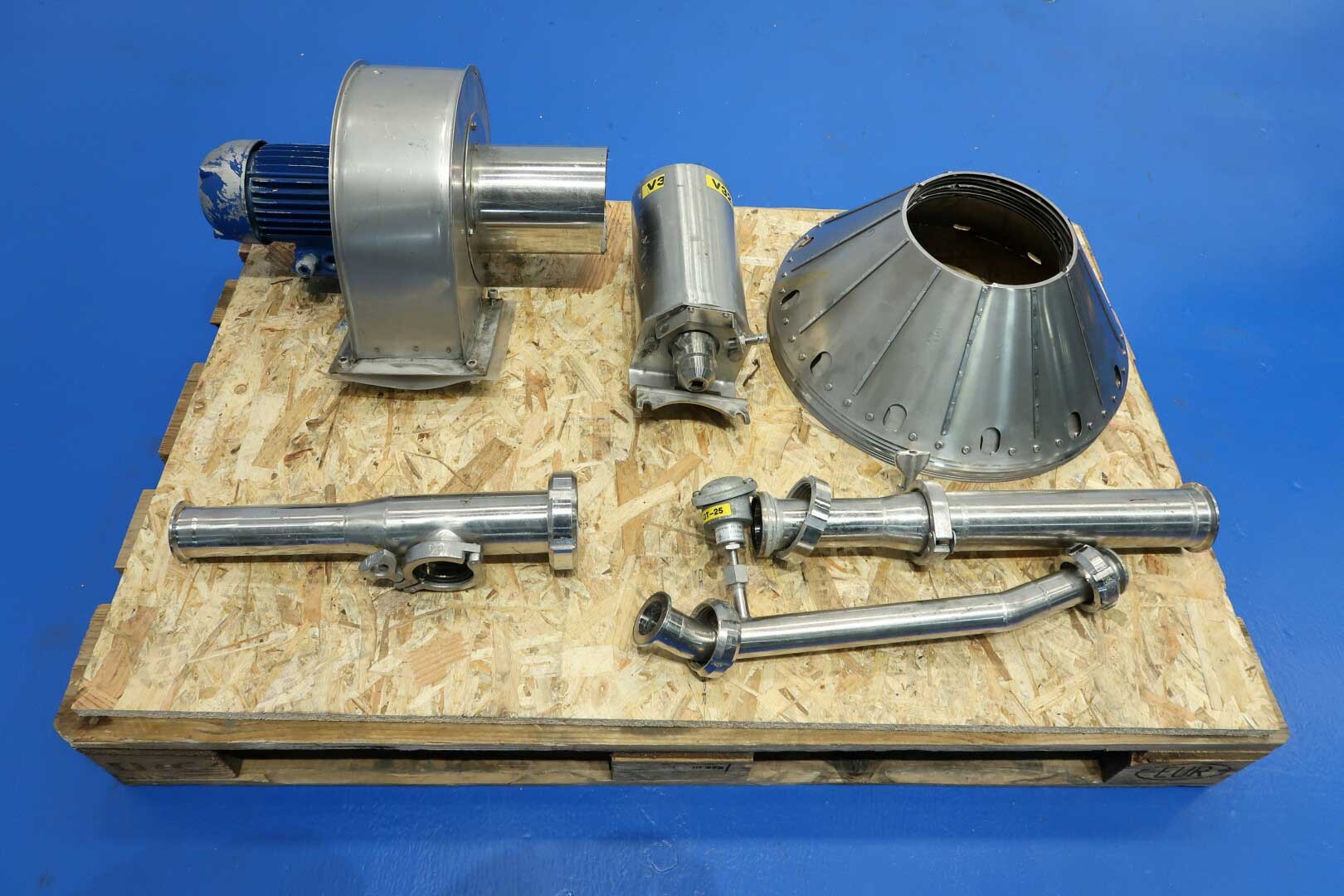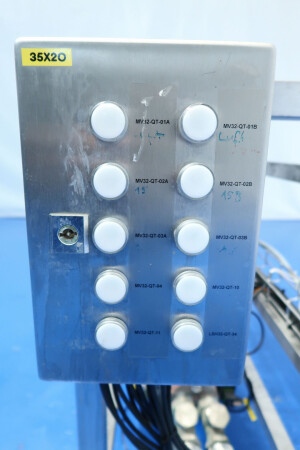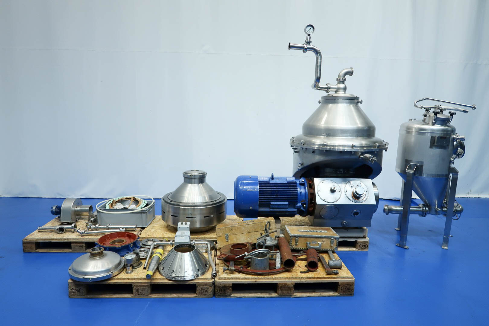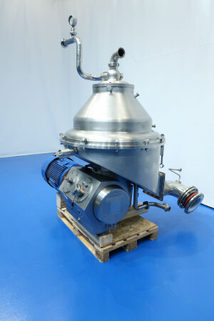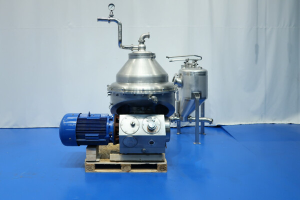Zelfreinigende nozzle-separator met 12 nozzles, ontworpen voor de efficiënte productie van verse kaas, kwark, Griekse yoghurt, skyr en labneh. De separator heeft een invoercapaciteit van 5.000 tot 9.000 liter per uur, afhankelijk van het eiwitgehalte aan de inlaat en het gewenste drogestofpercentage aan de uitlaat, met een productopbrengst tot 3.000 kg eindproduct (maximaal 20% droge stof). De machine concentreert gefermenteerde magere melk in een verhouding van circa 2,2–3 liter invoer tot 1 liter concentraat. De trommel draait met een snelheid van 4.160 tpm en heeft een slibruimte van 25 liter. De installatie wordt geleverd met een kwarkopvangtank met een trechtervolume van 195 liter, uitgerust met twee niveausensoren en één temperatuursensor voor nauwkeurige procesbewaking. Het systeem is gemonteerd op een skid met geïntegreerde watermodules (OWM) en wordt aangedreven door een 37,0 kW motor voor betrouwbare en continue werking. Bij de levering inbegrepen zijn een complete gereedschapsset (lijst beschikbaar) met ringsleutel en een pressing tool, alsook een uitgebreide set reserveonderdelen met een extra waaierpomp en een hoofdas. De documentatie omvat een handleiding en onderdelenlijst in het Engels en Duits. Niet inbegrepen zijn het basisframe, het dubbele filter en de besturingsunit