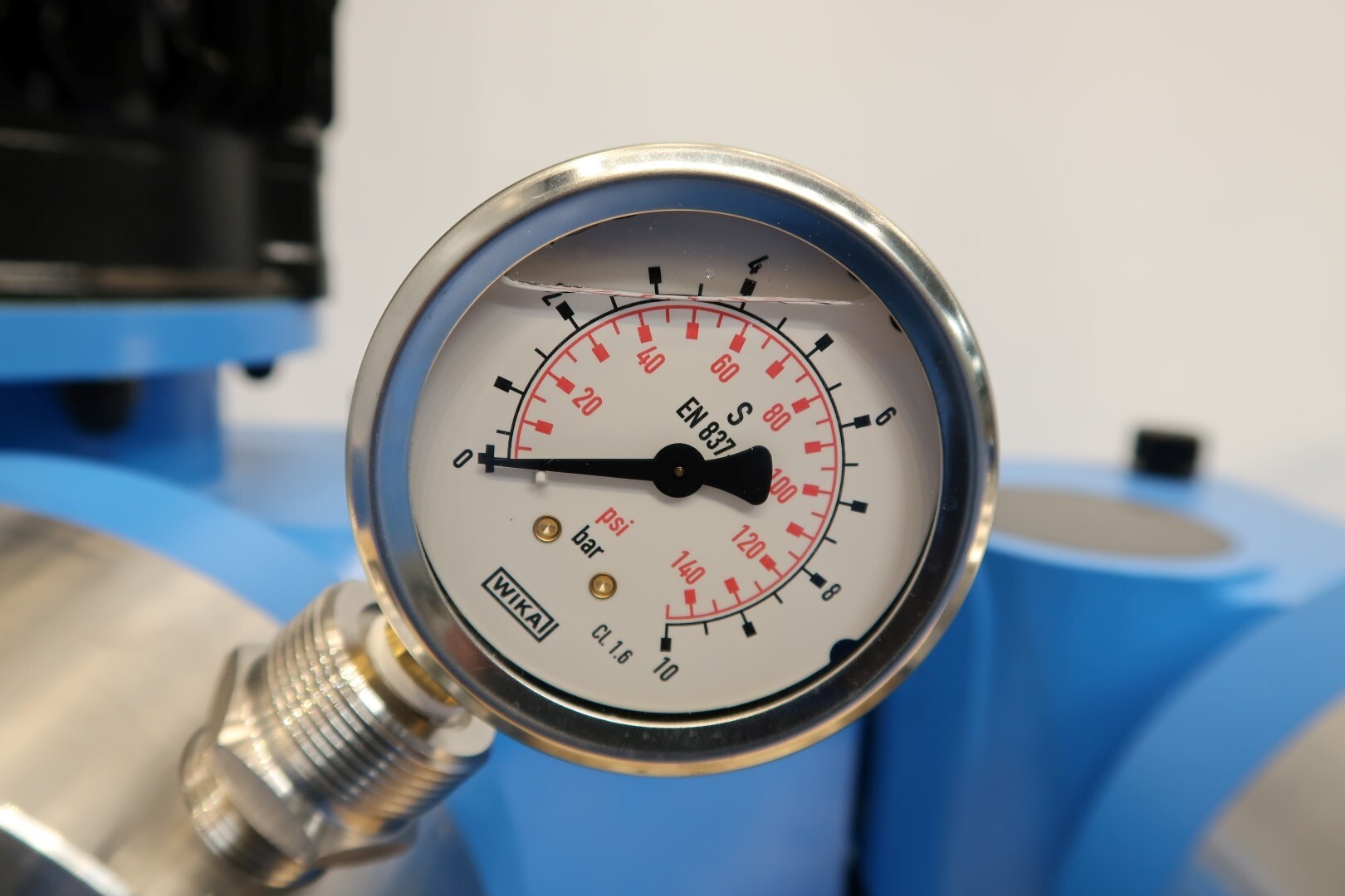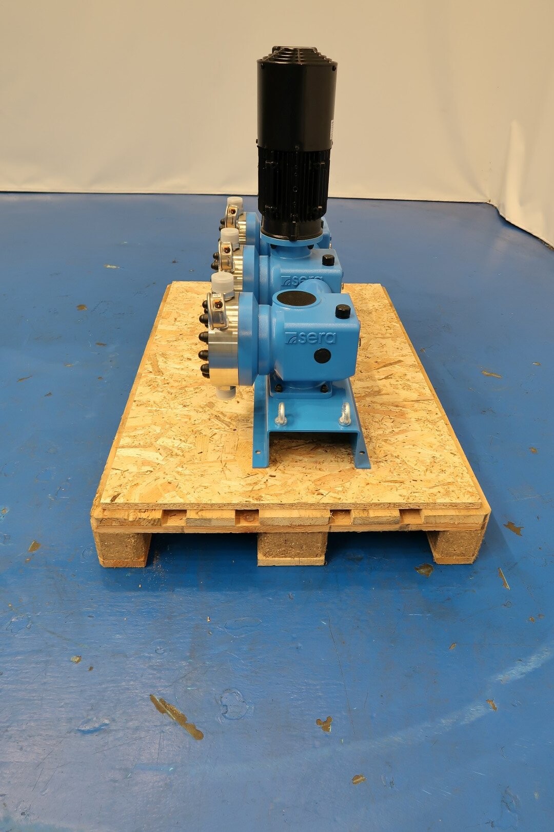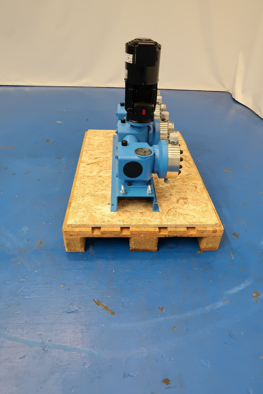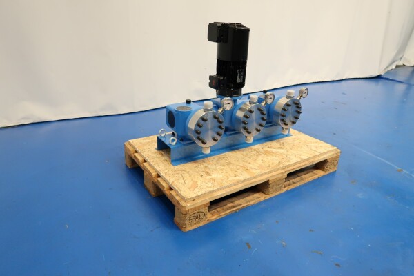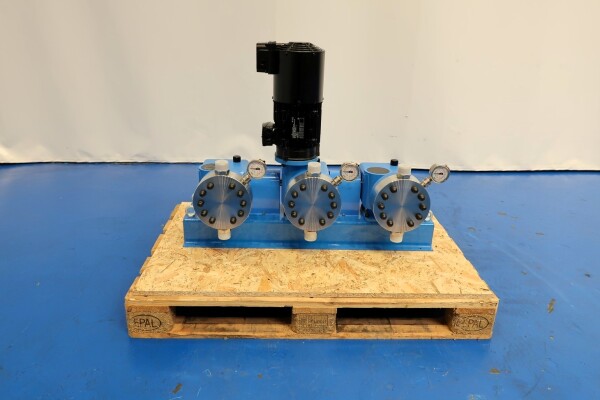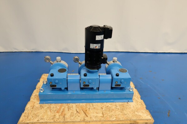Complete doseerpompinstallatie gemonteerd op een robuust frame, bestaande uit drie doseerpompen aangedreven door één motor met geforceerde koeling. Elke pomp heeft een nominale capaciteit van 5–500 l/u, met een totale maximale capaciteit tot 1.500 l/u. Het systeem is ontworpen voor een maximale uitlaatdruk van 10 bar en is voorzien van afzonderlijke drukmanometers per pomp voor monitoring. Inlaatdrukbereik P1: –0,3 tot 0 bar. Technische documentatie (Engels) is inbegrepen.