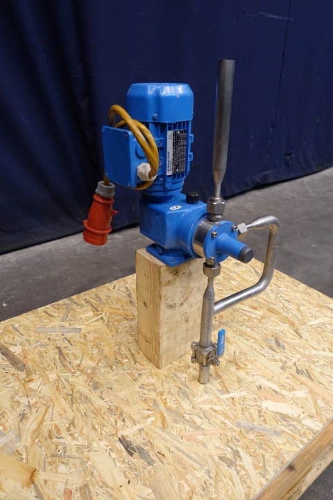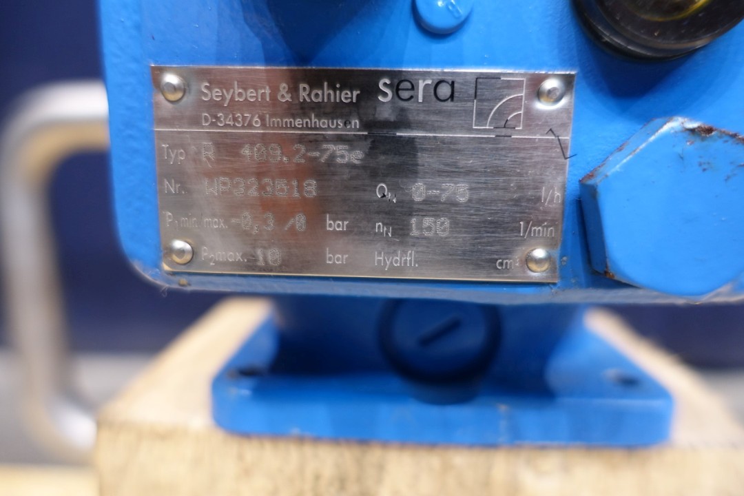 Sera (Seybert & Rahier) dosing pump, manual adjustable. Pressure P1 min -0,3/0 bar, P2 max 10 bar. Qn 0-75 l/h, Nn 150 l/min. AC motor: 0,18 kW - 0,59 A - 1.330 rpm - 50 Hz. Dimensions: 35x33x68 (lxwxh) cm - weight: 45 kg.
